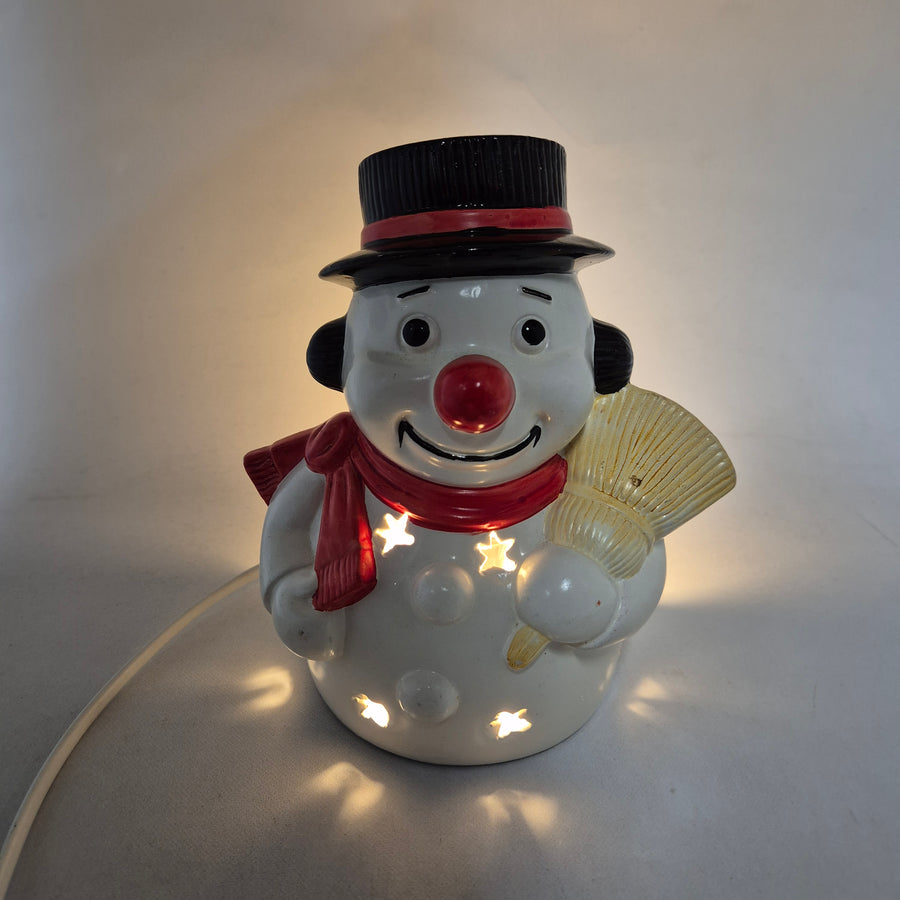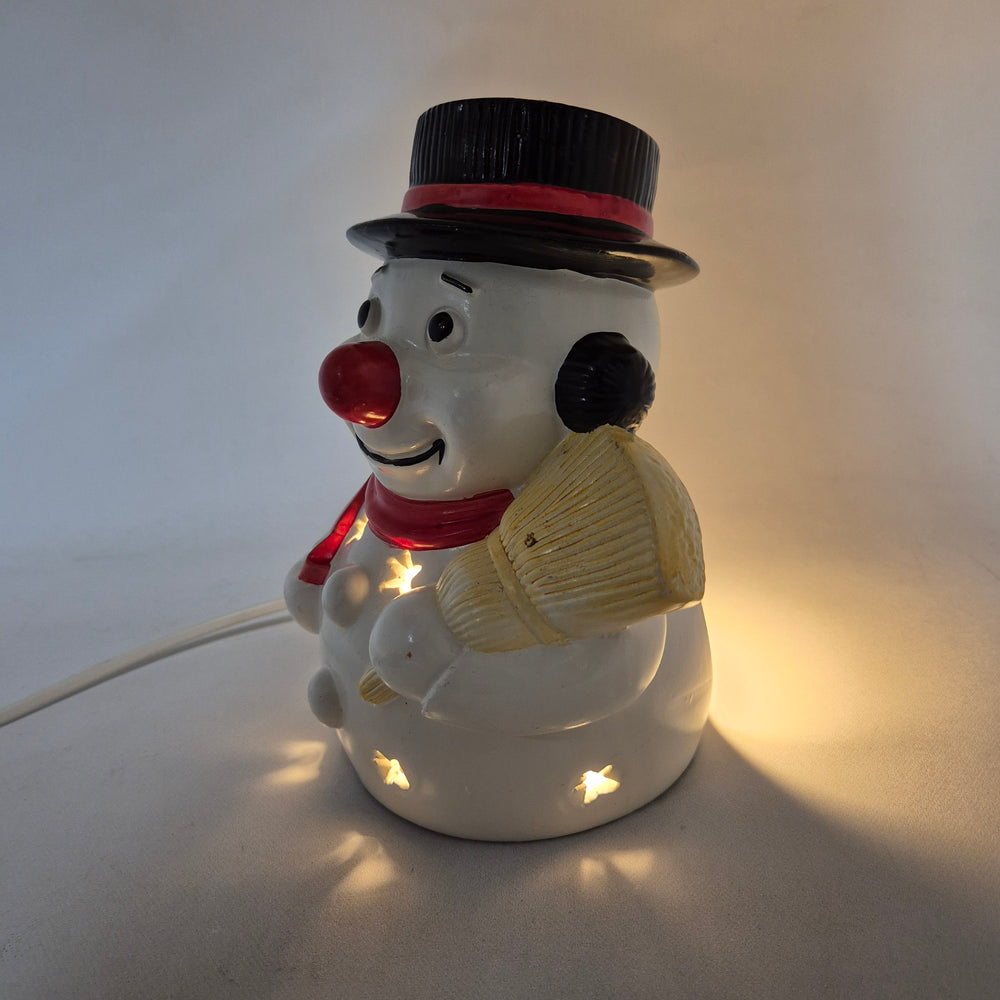 Denna dekorativa ljuslykta är utformad som en glad snögubbe, komplett med hatt, halsduk och en lykta. En idealisk dekoration som sprider ljus och värme under den mörka vintertiden. Funktionen att lysa upp med inbyggda lampor gör den till ett utmärkt tillskott i varje juldekorationssamling. Produkten är begagnad men välbevarad och fungerar utmärkt.