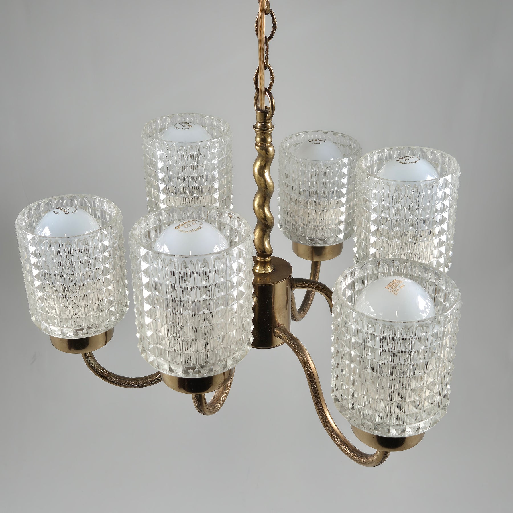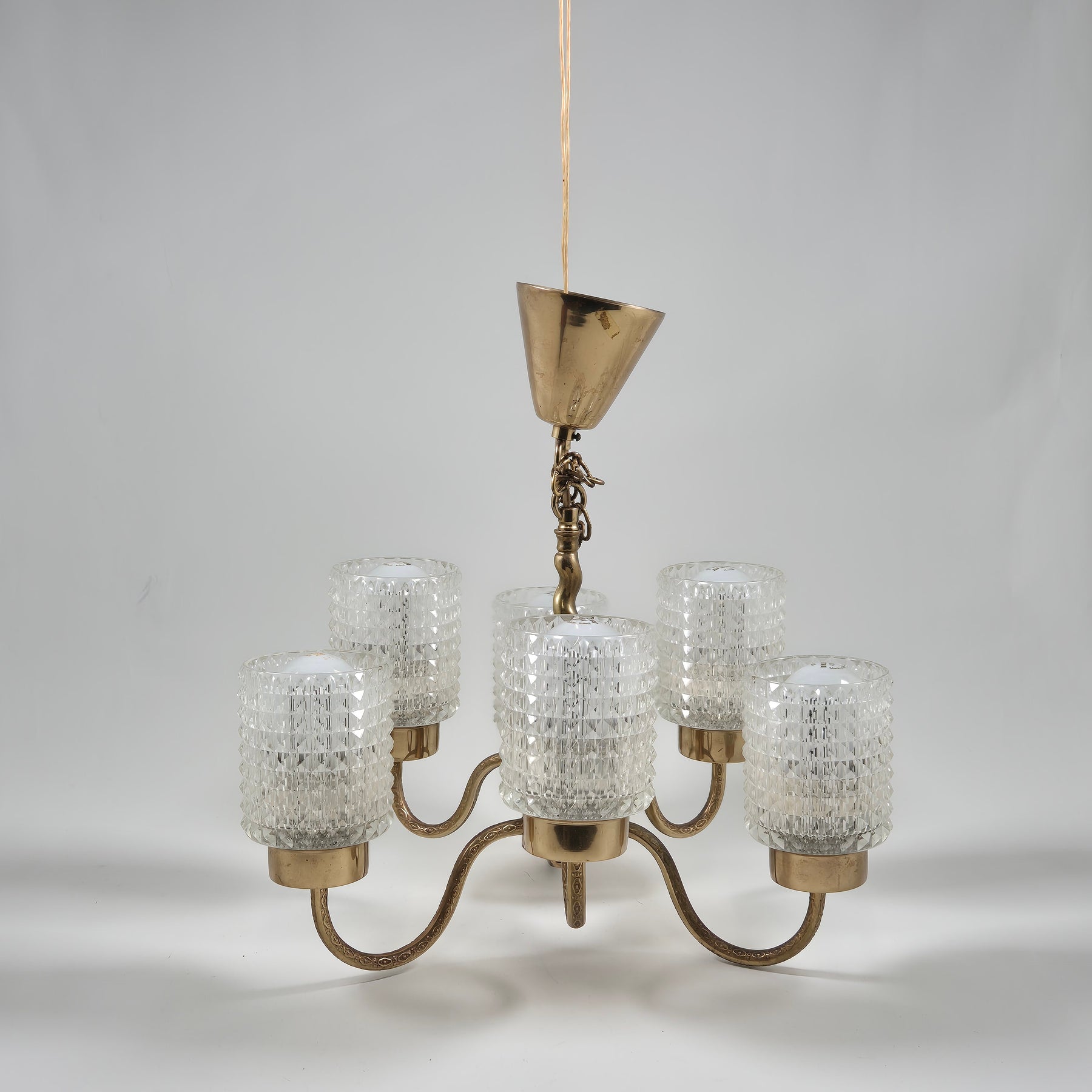 Den snygga takkronan pryder vilket rum som helst med sin tidlösa design. Den består av sex glasskärmar med detaljrika prismor och en guldtonad metallstruktur, vilket ger ett mjukt och inbjudande ljus. Takkronan är idealisk för alla som uppskattar vintage och klassisk inredning. Det är en produkt som kombinerar funktionalitet med en stilsäker estetik, begagnad men i mycket gott skick.