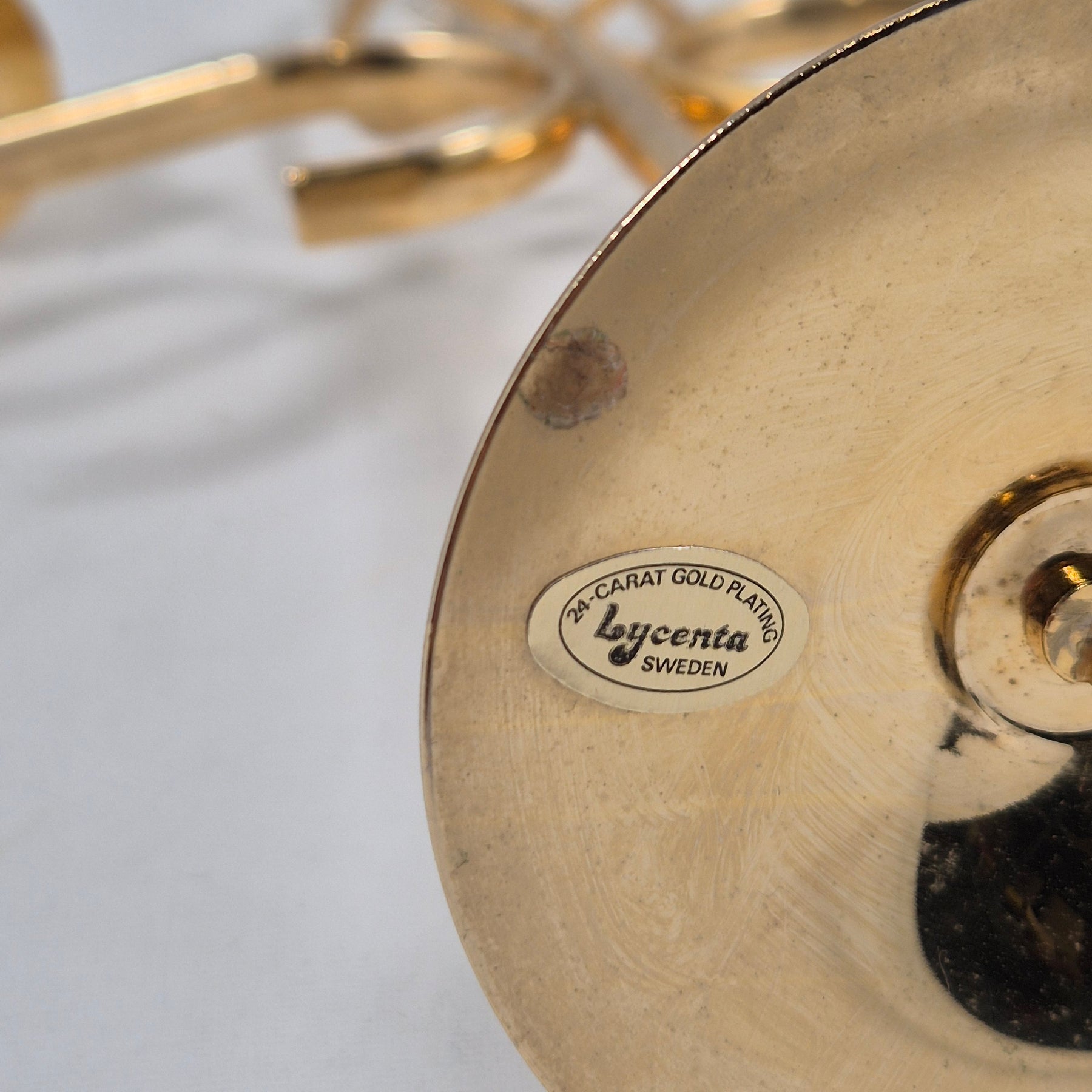 Denna ljusstake är tillverkad av Lycenta Sweden och har en stilfull design i 24 karat guldplätering. Dess detaljerade konstruktion och glänsande finish gör den till en iögonfallande detalj i hemmet och tillförs ett touch av lyx. Varje del av ljusstaken är noggrant formgiven, inkluderat de sirliga armar och dekorerade med tydliga kristaller, vilket gör den perfekt för både vardaglig användning och speciella tillfällen. Produkten är begagnad men fortfarande i mycket gott skick.