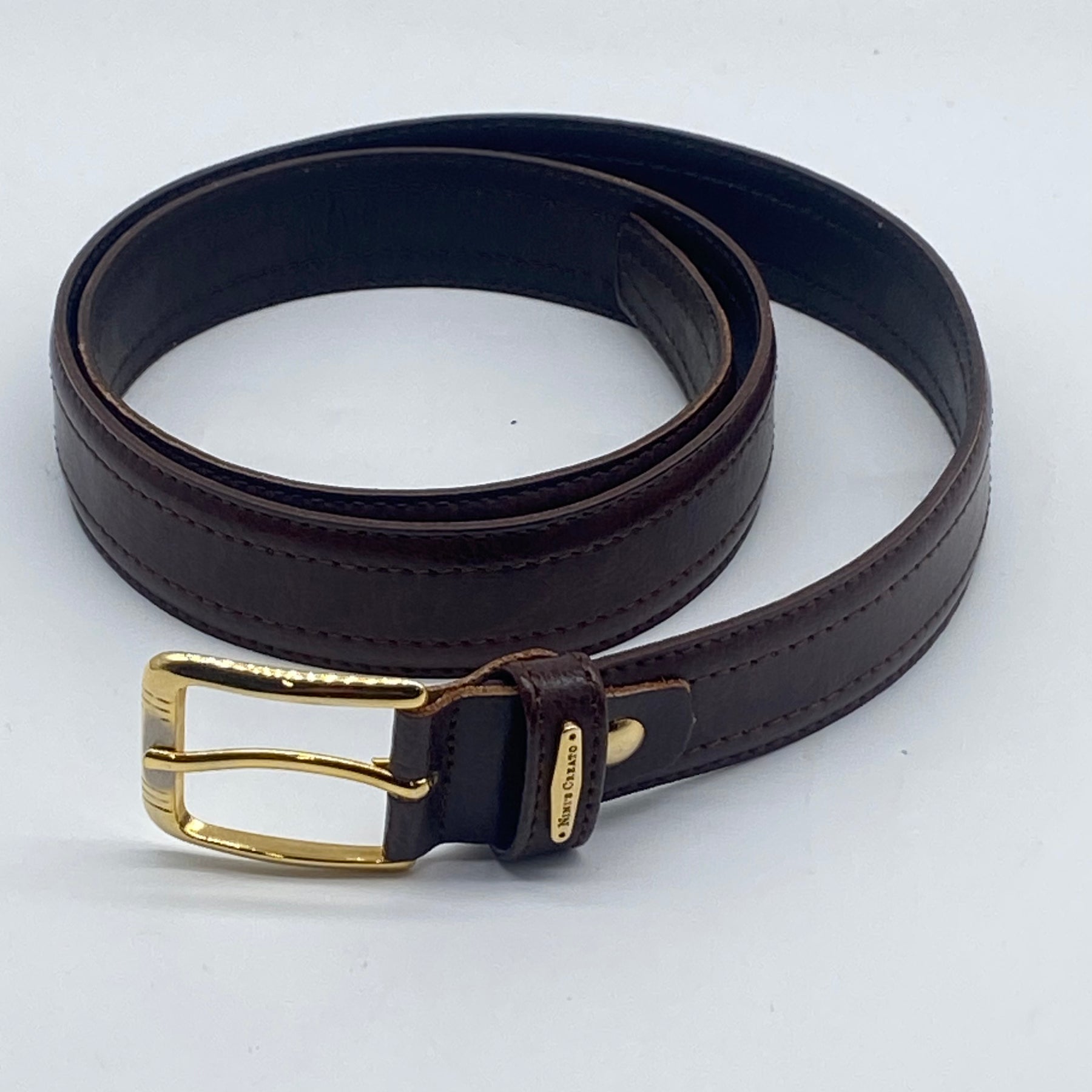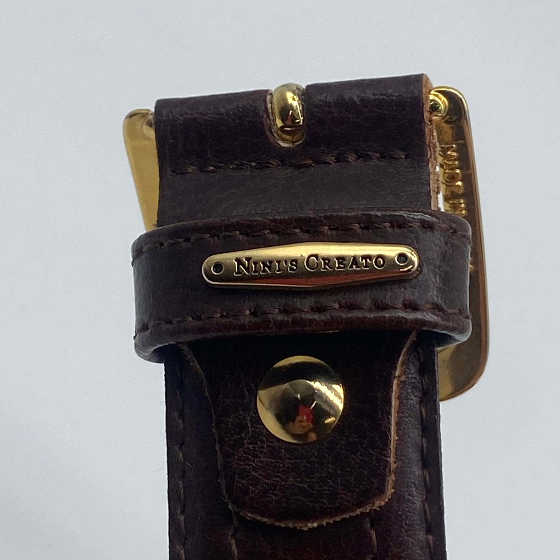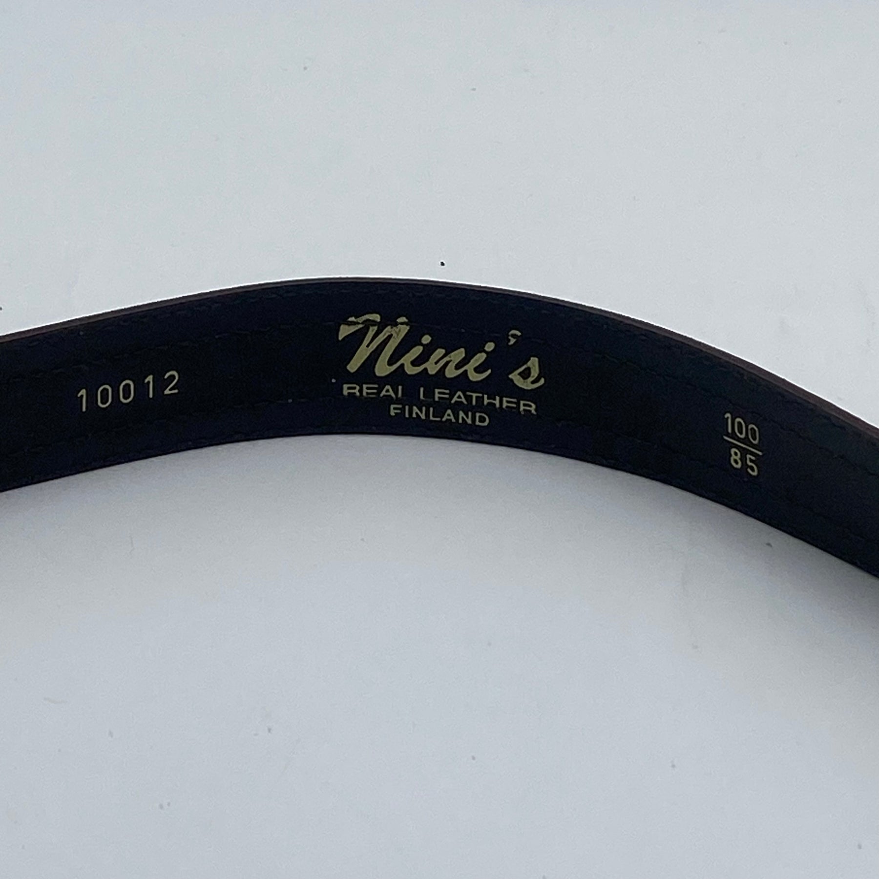 Detta stiliga bälte är tillverkat i äkta läder med en attraktiv guldtonad spänne som ger en sofistikerad touch till vilken outfit som helst. Märket Nini's står för hög kvalitet och hållbarhet, vilket gör detta bälte till ett utmärkt val för den mode- och kvalitetsmedvetna. Bältet är begagnat men fortfarande i utmärkt skick och kan ge dina vardags- eller arbetskläder den där extra finishing touch.Produktspecifikationer