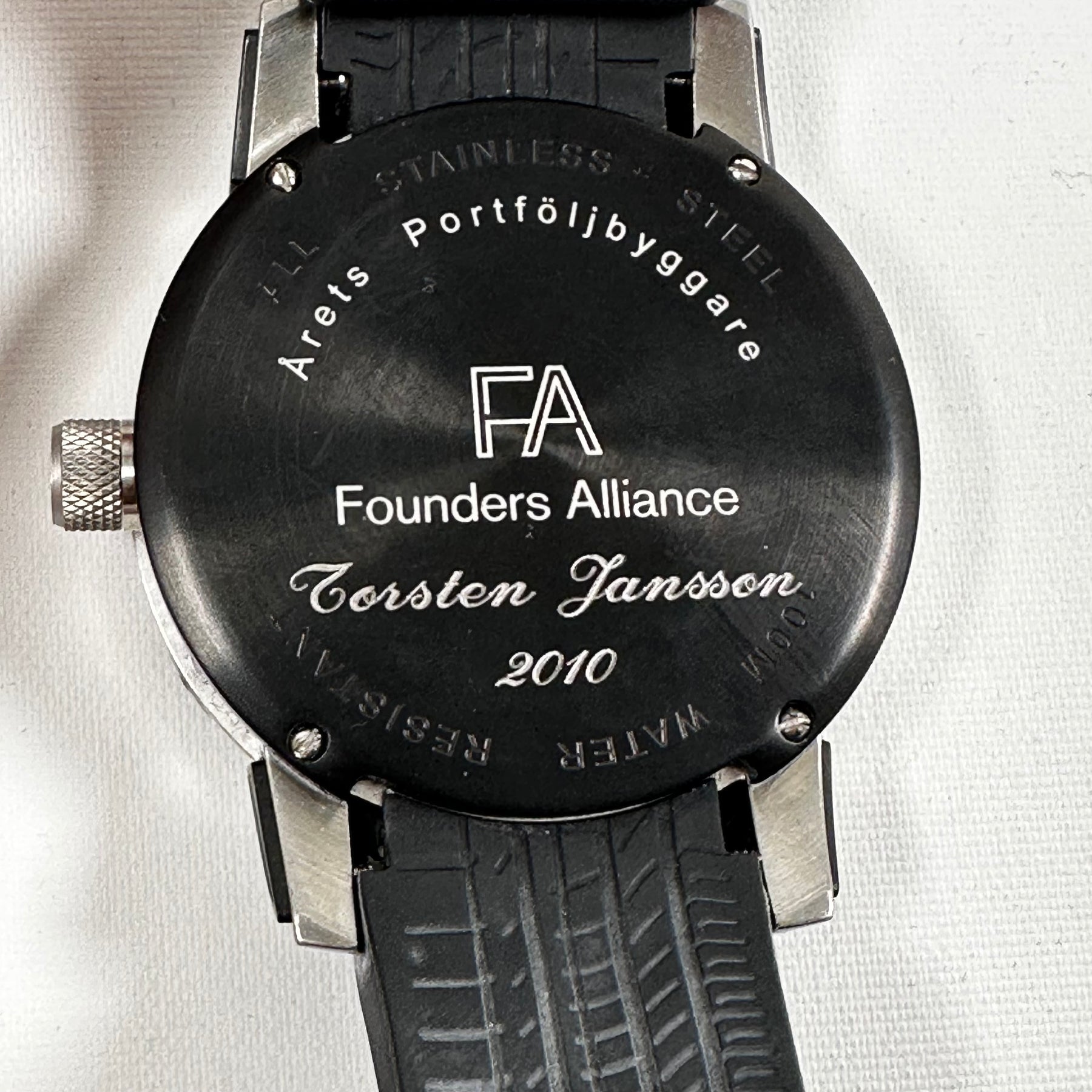 Denna armbandsklocka från Founders Alliance, modell "Årets Portföljbyggare 2010", kombinerar praktisk elegans med kompakt design. Med inskriptionen för Torsten Jansson 2010 på baksidan är detta både en minnessak och en funktionell accessoar. Perfekt för samlare av unika klockor eller som en exklusiv gåva. Klockan är begagnad men är i mycket gott skick, och visar minimala tecken på användning.