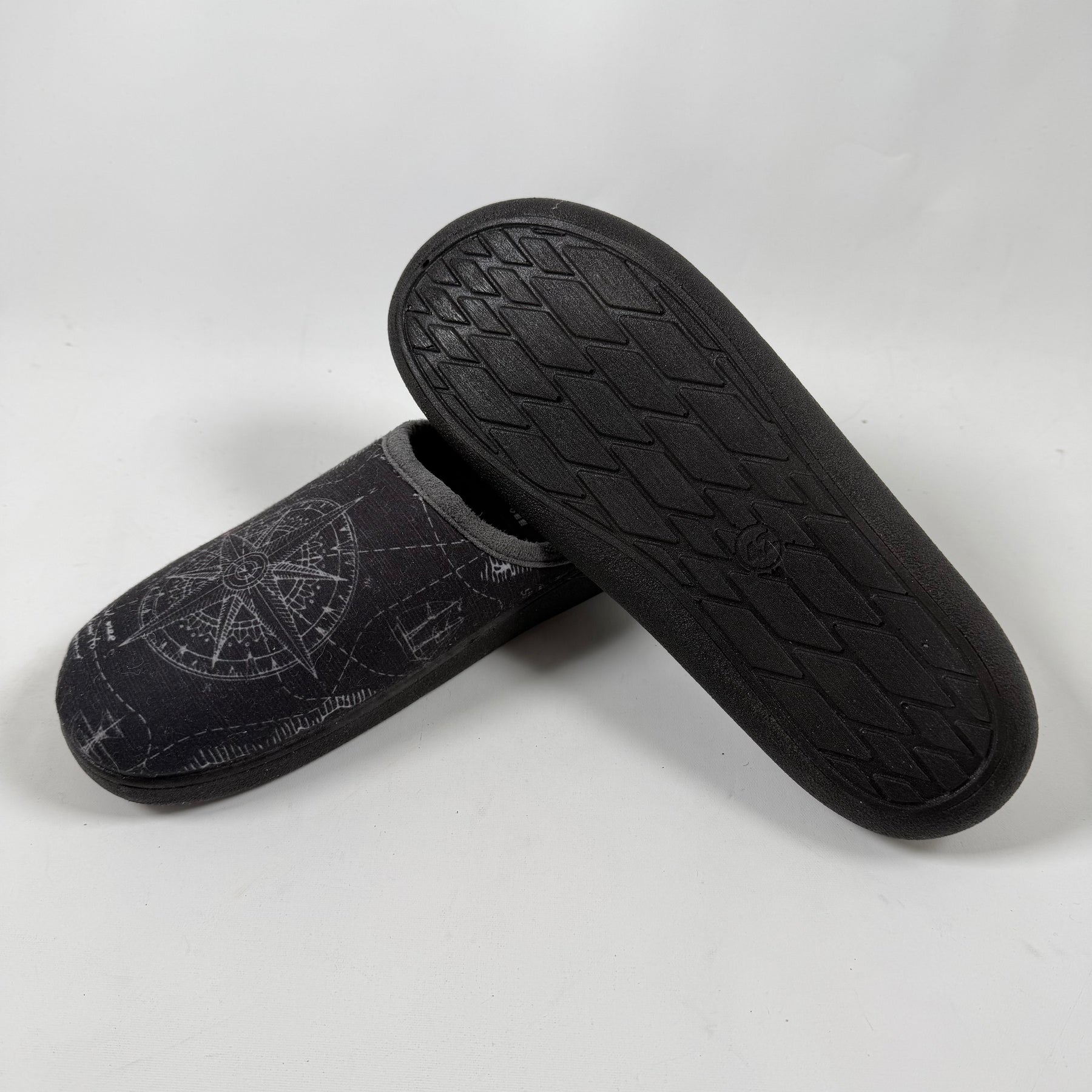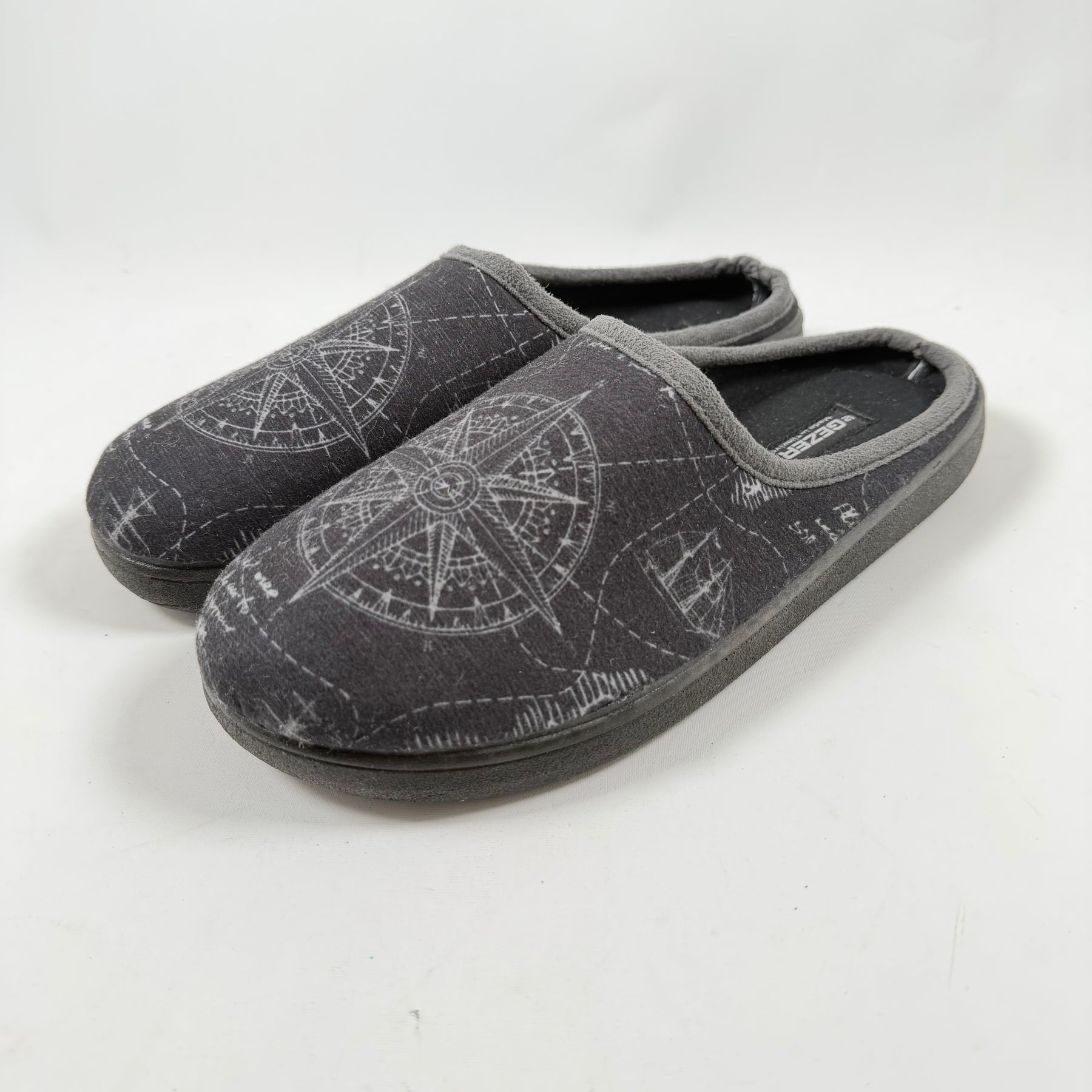 Dessa inneskor är prydda med en detaljerad kompassmotiv, vilket ger dem en distinkt och äventyrlig känsla. Skorna är tillverkade av ett mjukt material som gör dem oerhört bekväma för avslappnad användning inomhus. De är perfekta för den som uppskattar både stil och komfort hemma. Skicket är begagnat men skorna är väl bevarade och visar minimala tecken på användning.Produktspecifikationer