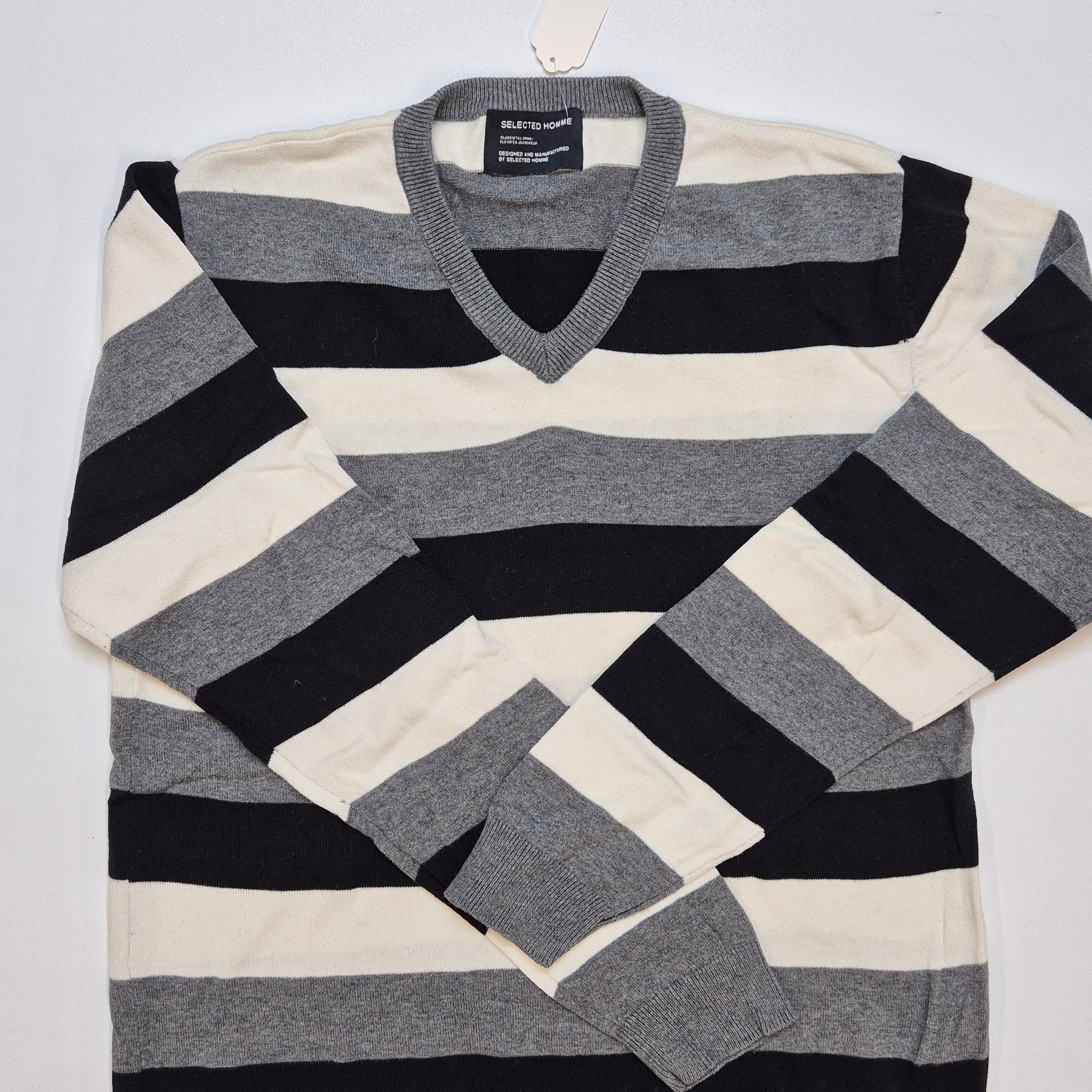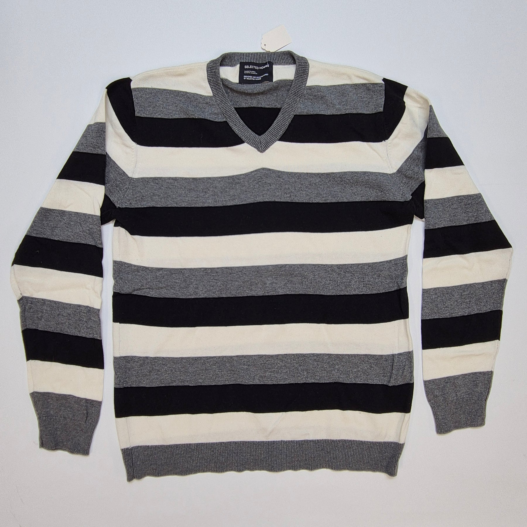 Denna randiga herrtröja är från det danska modemärket Selected Homme. Tröjan har en tidlös design med horisontella ränder i svart, grått och vitt, vilket gör den lämplig för såväl vardags som fest. Tillverkad i en mjuk bomullsblandning för optimal komfort. Tröjan är försiktigt använd och i mycket gott skick, vilket gör den till ett utmärkt köp för den modeintresserade.