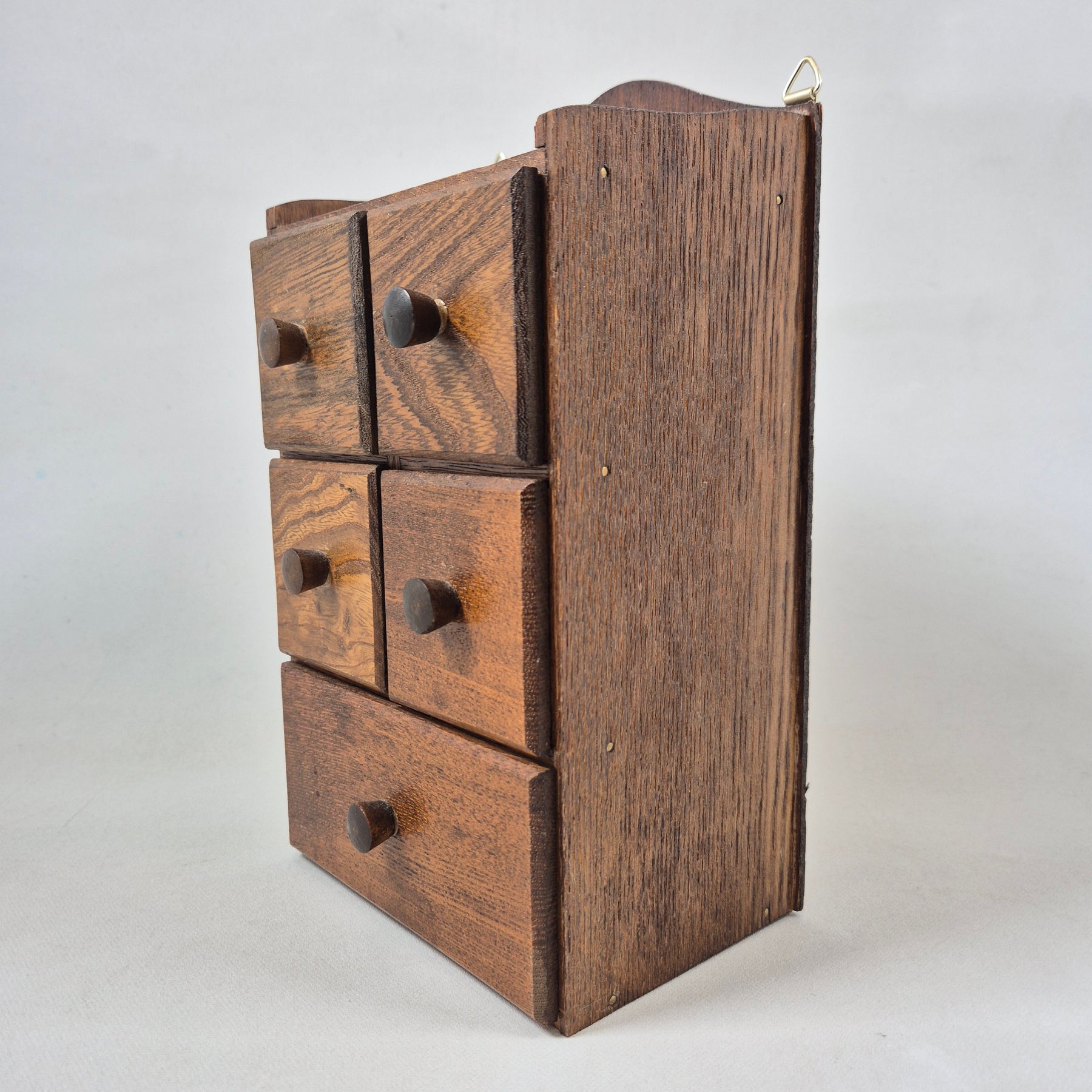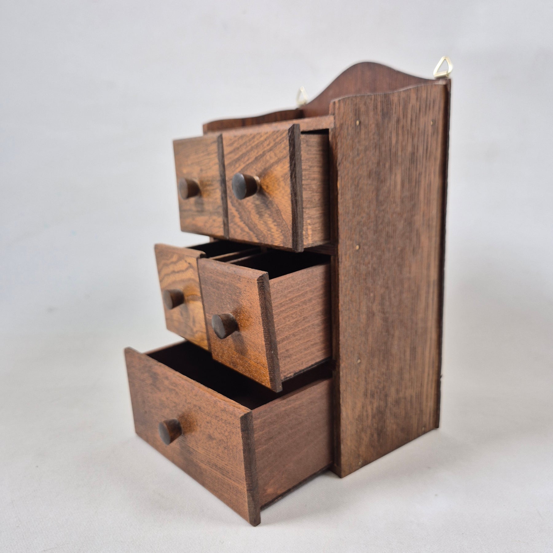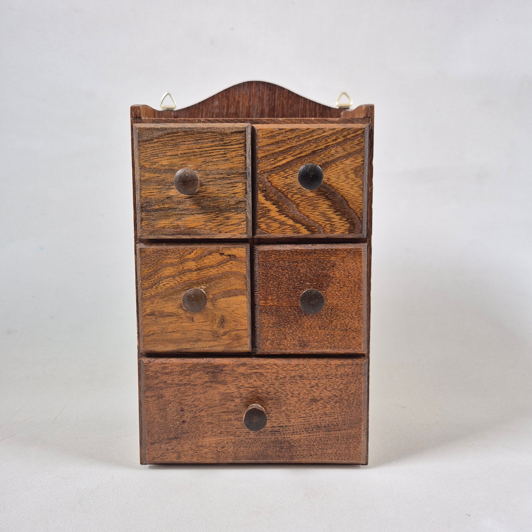 Denna mångsidiga förvaringslåda är tillverkad av robust trä och karaktäriseras av sitt unika, rustika utseende. Den har fem utdragbara lådor i olika storlekar som erbjuder praktisk förvaring för små föremål som smycken, kontorsmaterial eller handverktyg. Dess kompakta storlek gör den idealisk för bruk på skrivbord, i bokhyllor eller på arbetsbänkar. Lådan är begagnad men i utmärkt skick, vilket gör den till ett hållbart och stilfullt tillägg till varje rum.