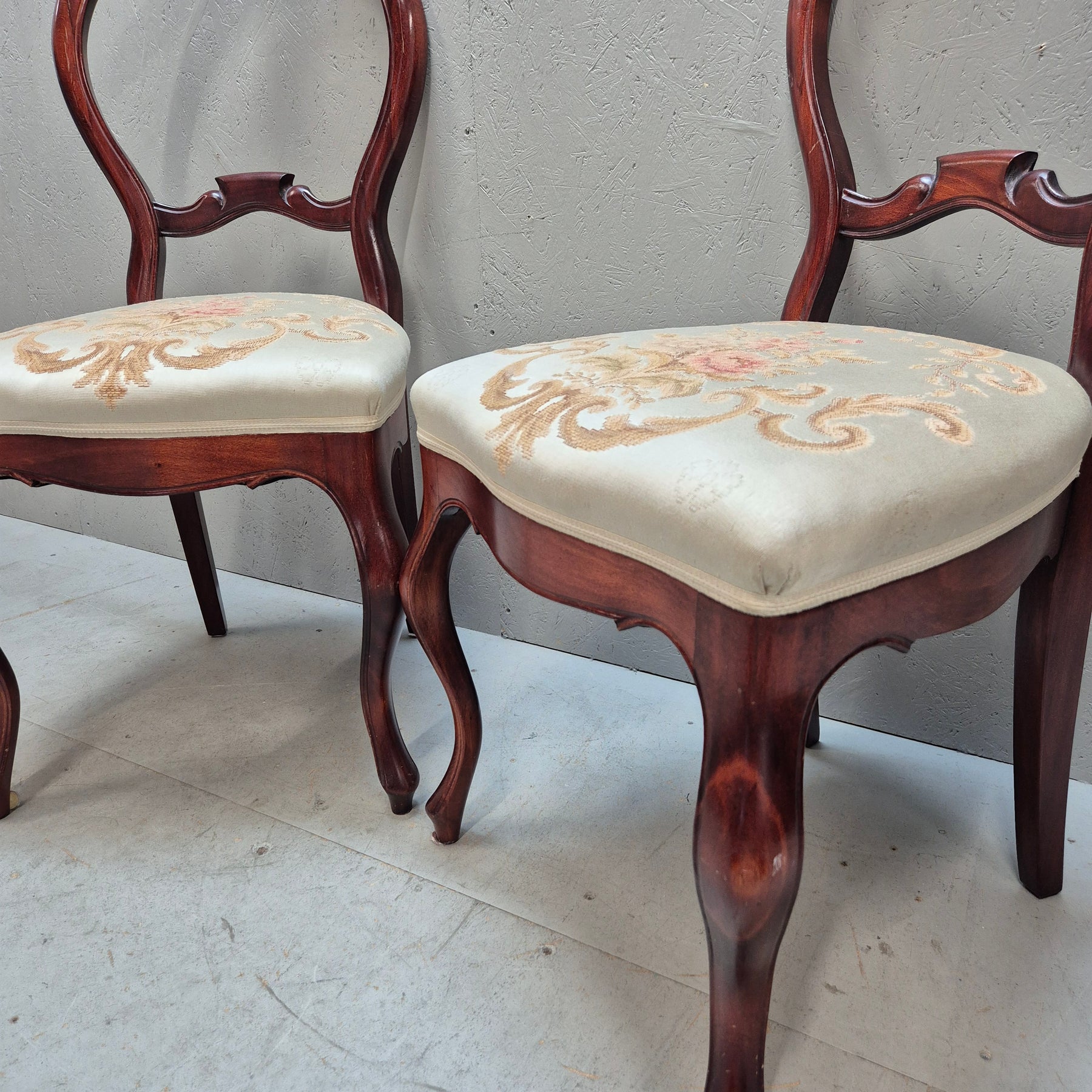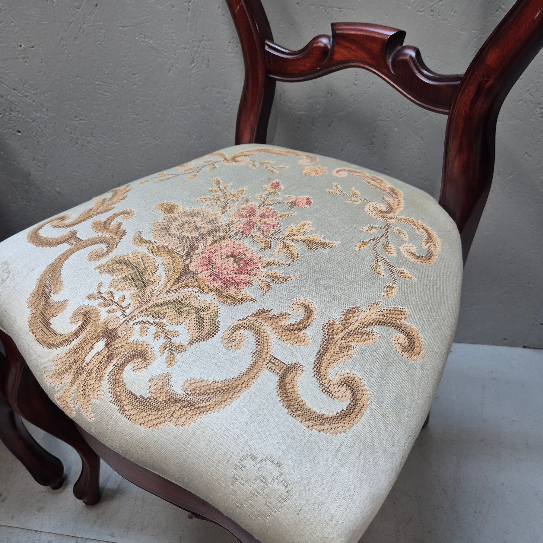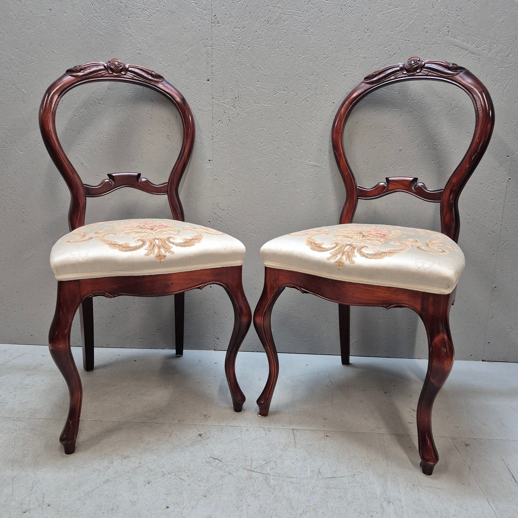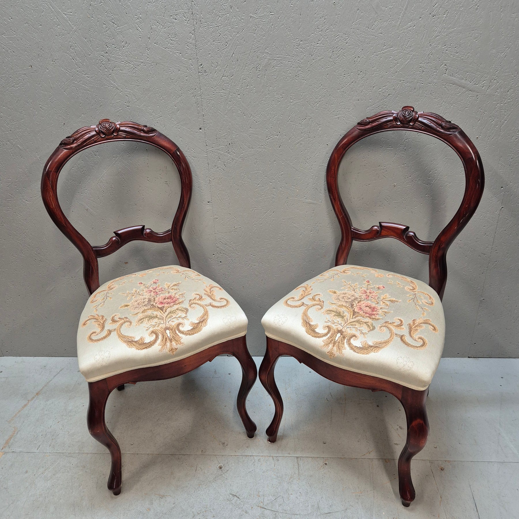 Dessa vintage stolar kombinerar tidlös design med en vacker rödbrun finish och dekorerade sitsöverdrag. De är perfekta för att ge en känsla av gammaldags elegans till ditt matsalsområde eller som ett ståtligt inslag i ditt vardagsrum. Stolarna är inom kategorin antikmöbler och utmärker sig med sitt påkostade träsnideri och sina skulpterade former, vilket gör dem till ett eftertraktat tillskott för samlare såväl som för inredningsentusiaster. De är begagnade men har bevarats i mycket gott skick.Produktspecifikationer