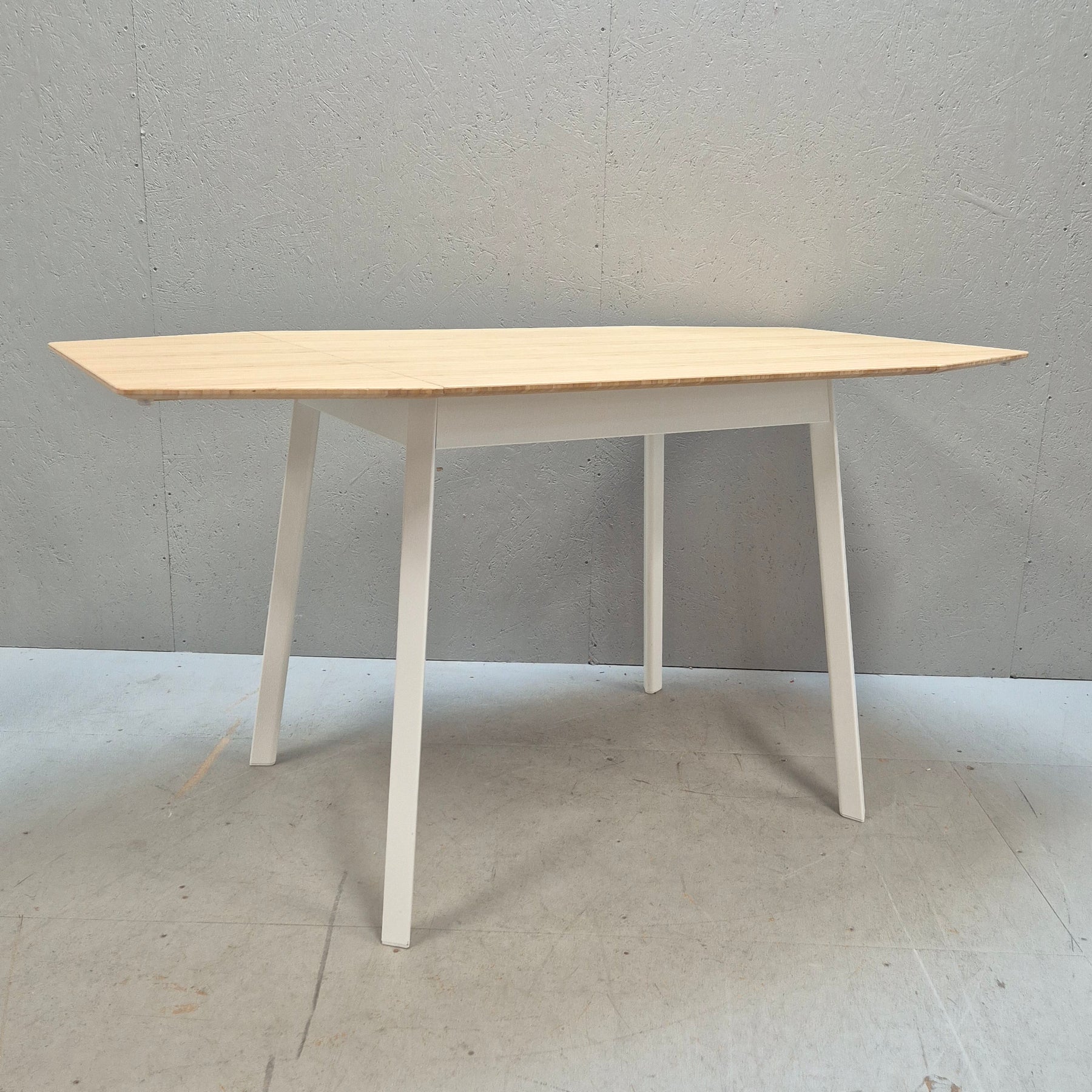 Praktiskt och stilrent matbord från IKEA PS 2012-kollektionen, designat av Jon Karlsson. Bordet är tillverkat i naturlig bambu med vita metallben och två hopfällbara sidodelar som gör det enkelt att anpassa storleken efter behov. Perfekt för små kök, matplatser eller som extra bord vid behov.