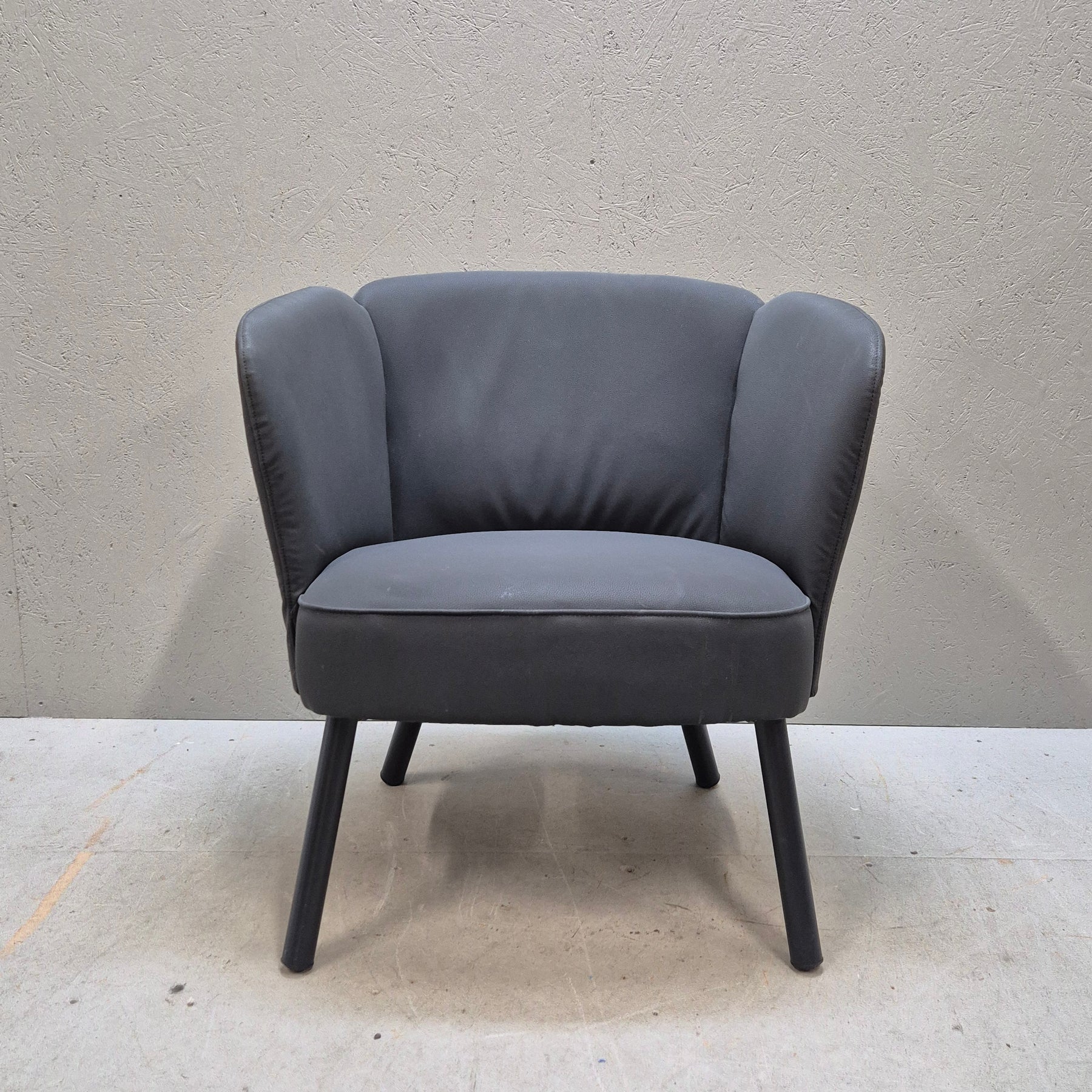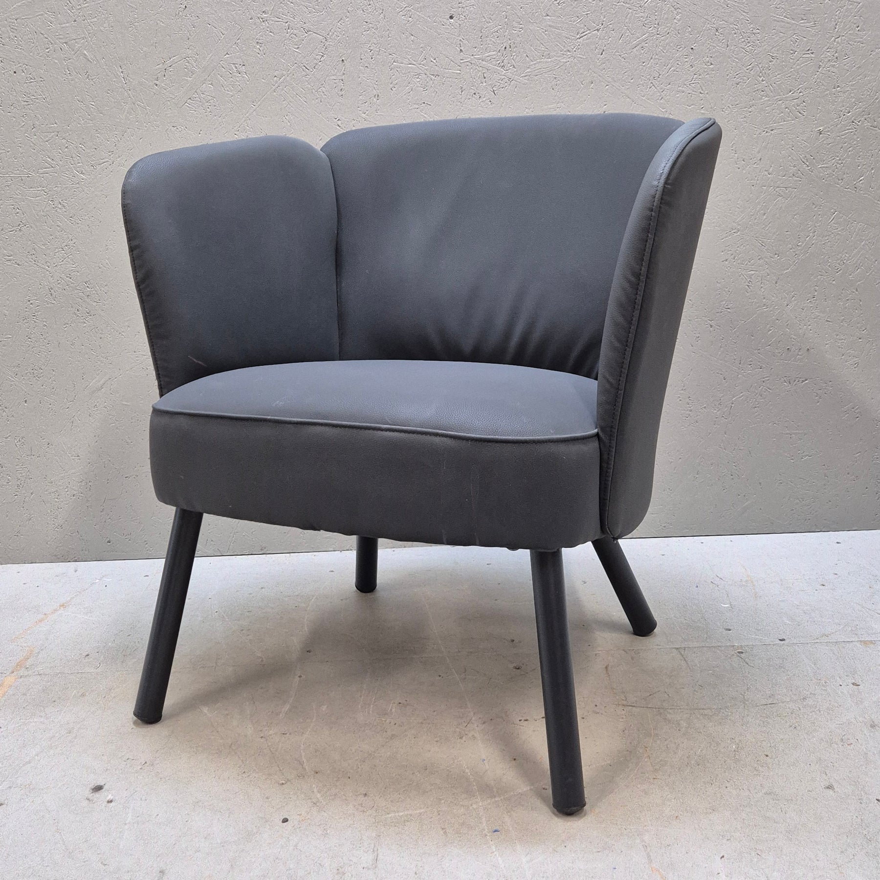 Denna eleganta fåtölj i mörkgrått är perfekt för dig som uppskattar både komfort och stil. Fåtöljen är tillverkad med en robust stomme och klädd i ett mjukt och slitstarkt tyg som bjuder in till många timmars avslappning. Den kompakta designen gör den idealisk för mindre utrymmen utan att kompromissa med sittkomfort. Tillståndet är begagnat men fåtöljen är i mycket gott skick, vilket gör den till ett smart och hållbart val.