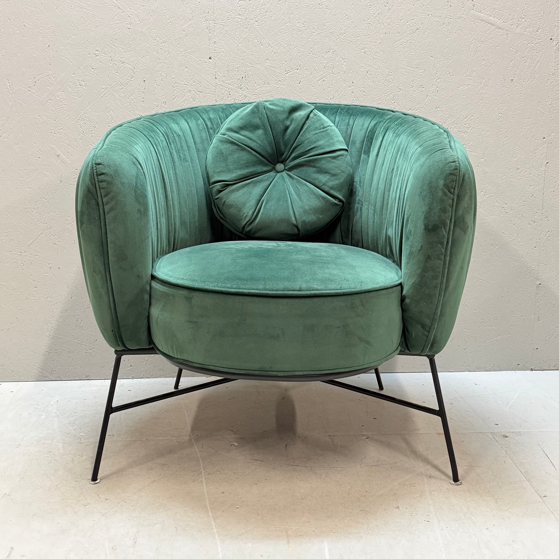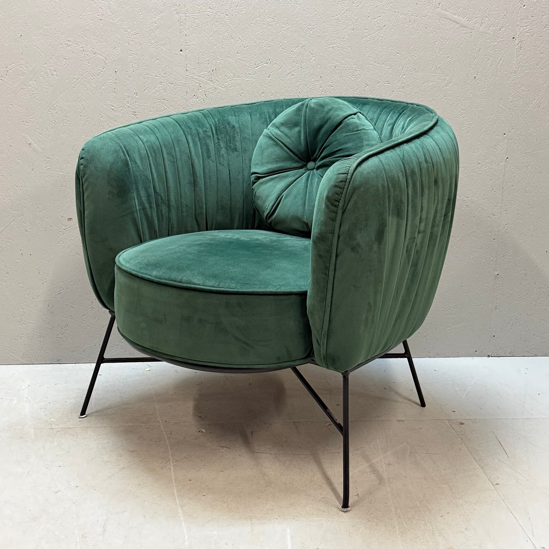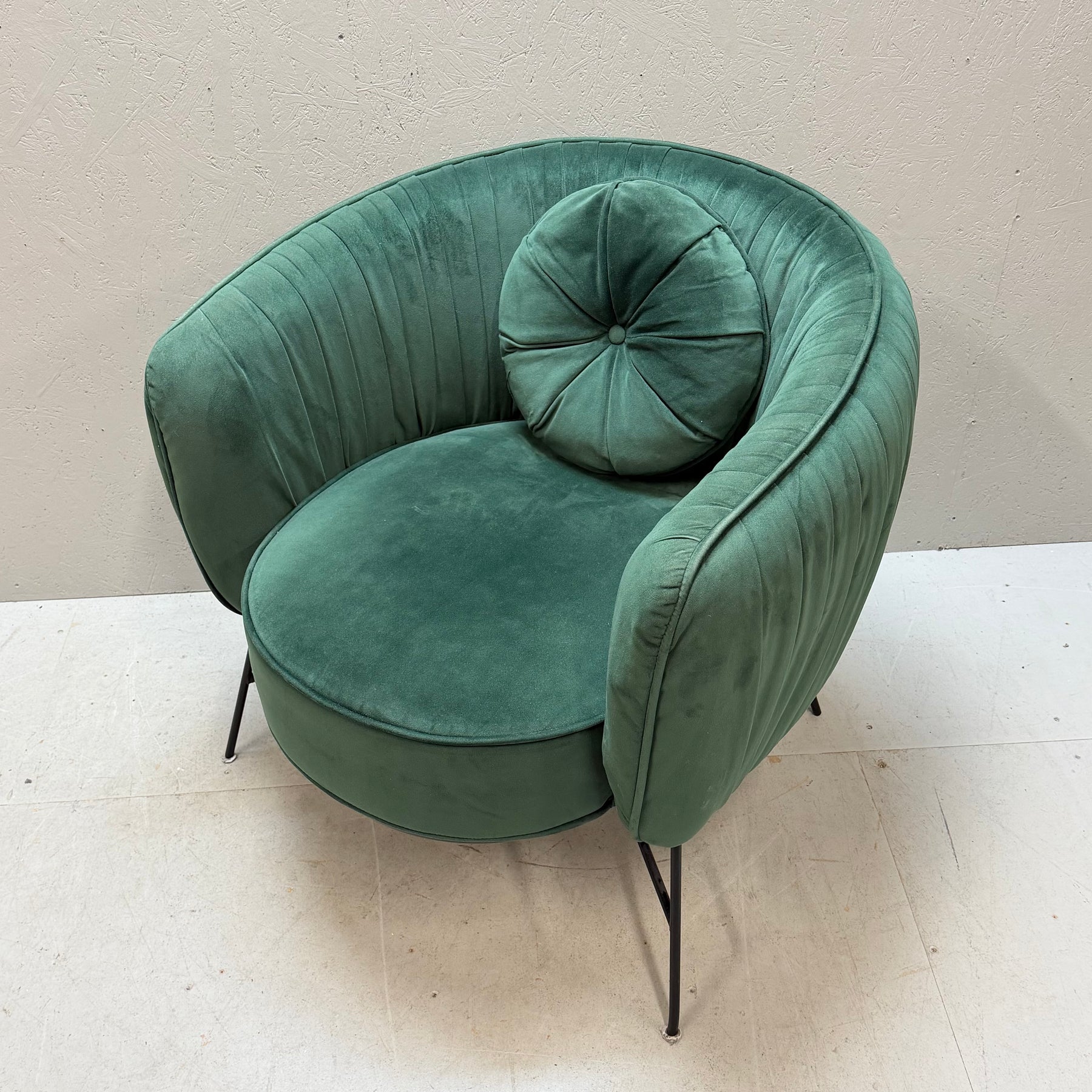 Denna lyxiga och komfortabla fåtölj är klädd i en vacker mossgrön sammet och stöttas av en robust metallram. Dess unika design, med mjuka linjer och en djärvt utformad knappdetalj i ryggstödet, gör den till en oemotståndlig accentmöbel för såväl klassiska som moderna interiörer. Fåtöljen är använd men fortfarande i mycket gott skick, väl hållen och redo att användas i ditt hem.Produktspecifikationer