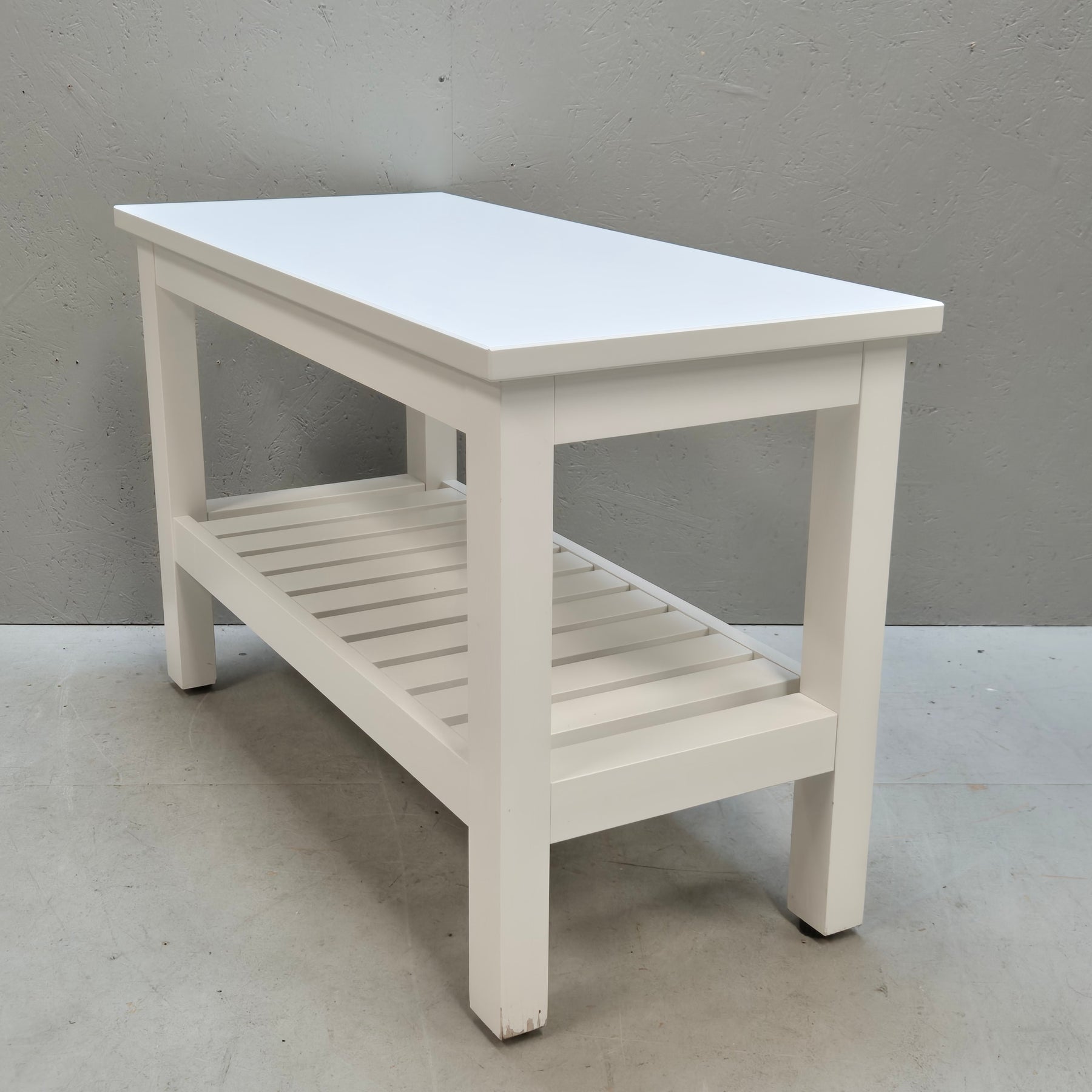 Denna stilrena vita bänk kombinerar funktionalitet med modern design. Bänken är utmärkt för hallen eller vardagsrummet och erbjuder en praktisk förvaringshylla under sitsen. Dess kompakta storlek gör den idealisk för även mindre utrymmen. Produkten är begagnad men i mycket gott skick, vilket gör den till ett smart och hållbart val.