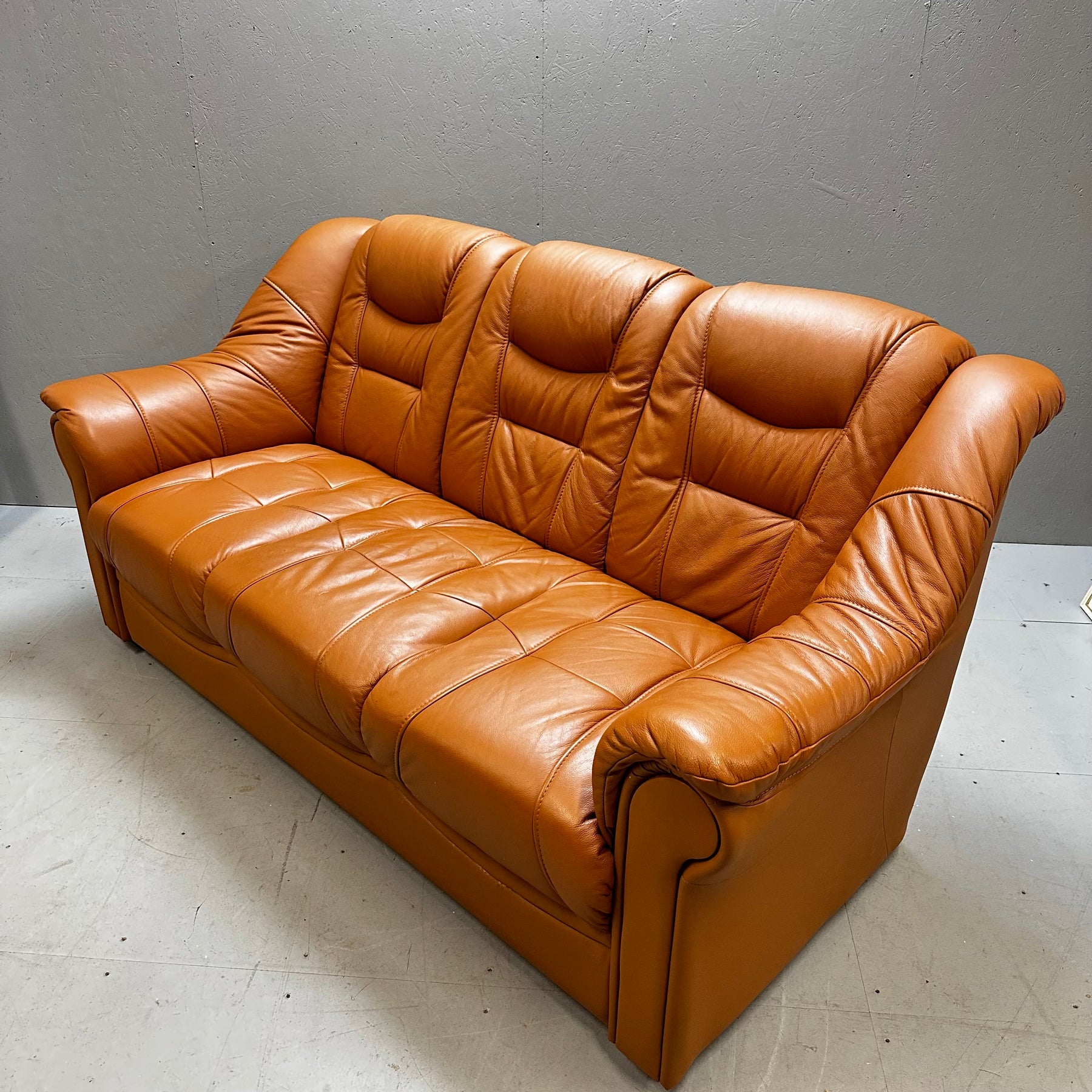 Denna inbjudande soffa är klädd i högkvalitativt, karamellfärgat läder som ger ett lyxigt intryck. Dess design är tidlöst klassisk med mjuka linjer och komfortabelt stoppad sits och ryggstöd, idealisk för avkoppling efter en lång dag. Soffan är begagnad men väl underhållen och förblir ett attraktivt inslag i varje hem.