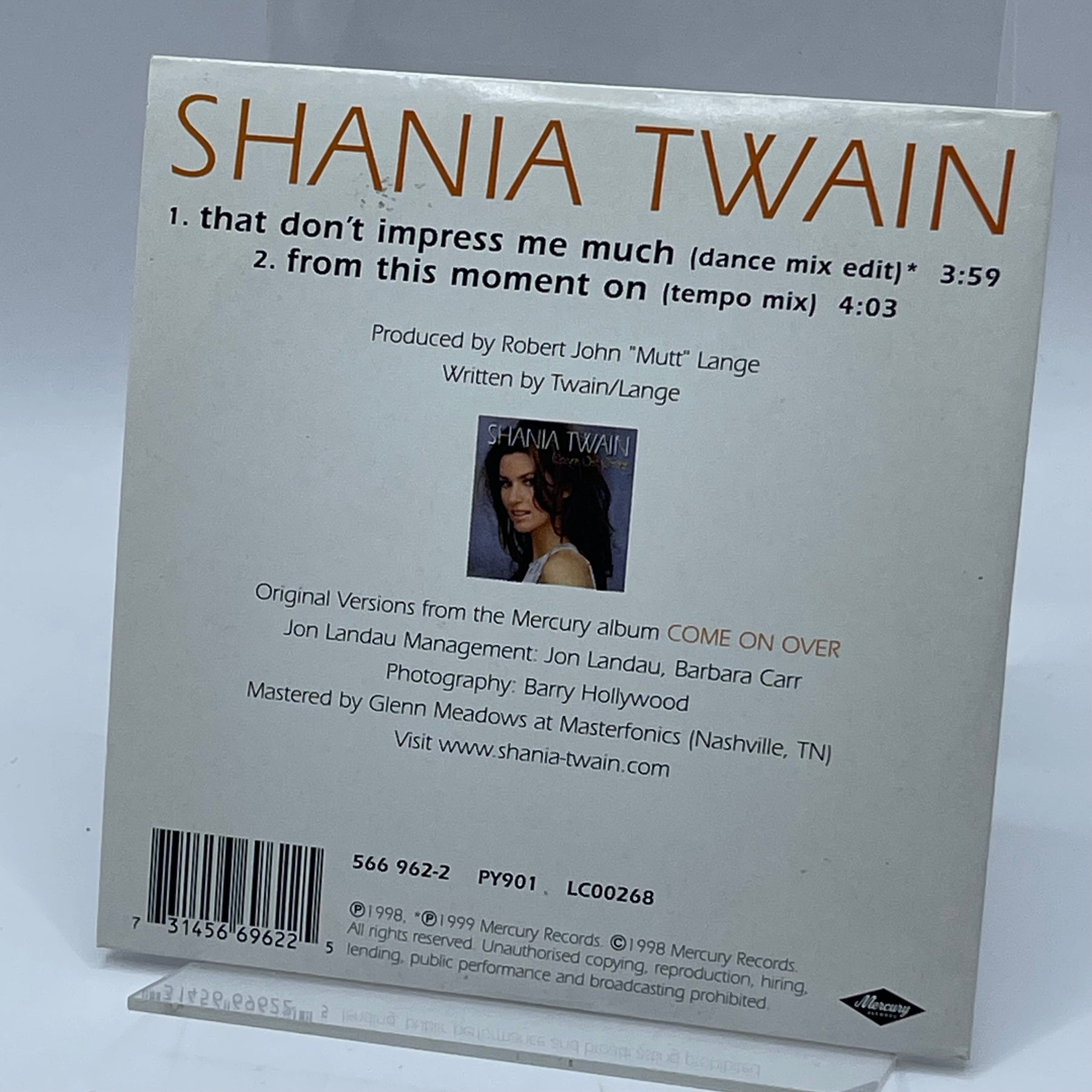 Denna samlarvärda singelskiva av Shania Twain innehåller två ikoniska låtar: "That don't impress me much (dance mix edit)" och "From this moment on (tempo mix)". Det är en unik samling av moderna popklassiker, presenterad i originalversioner. Singeln är begagnad men i mycket gott skick, utmärkt för både samlare och Shania Twains fans.Produktspecifikationer