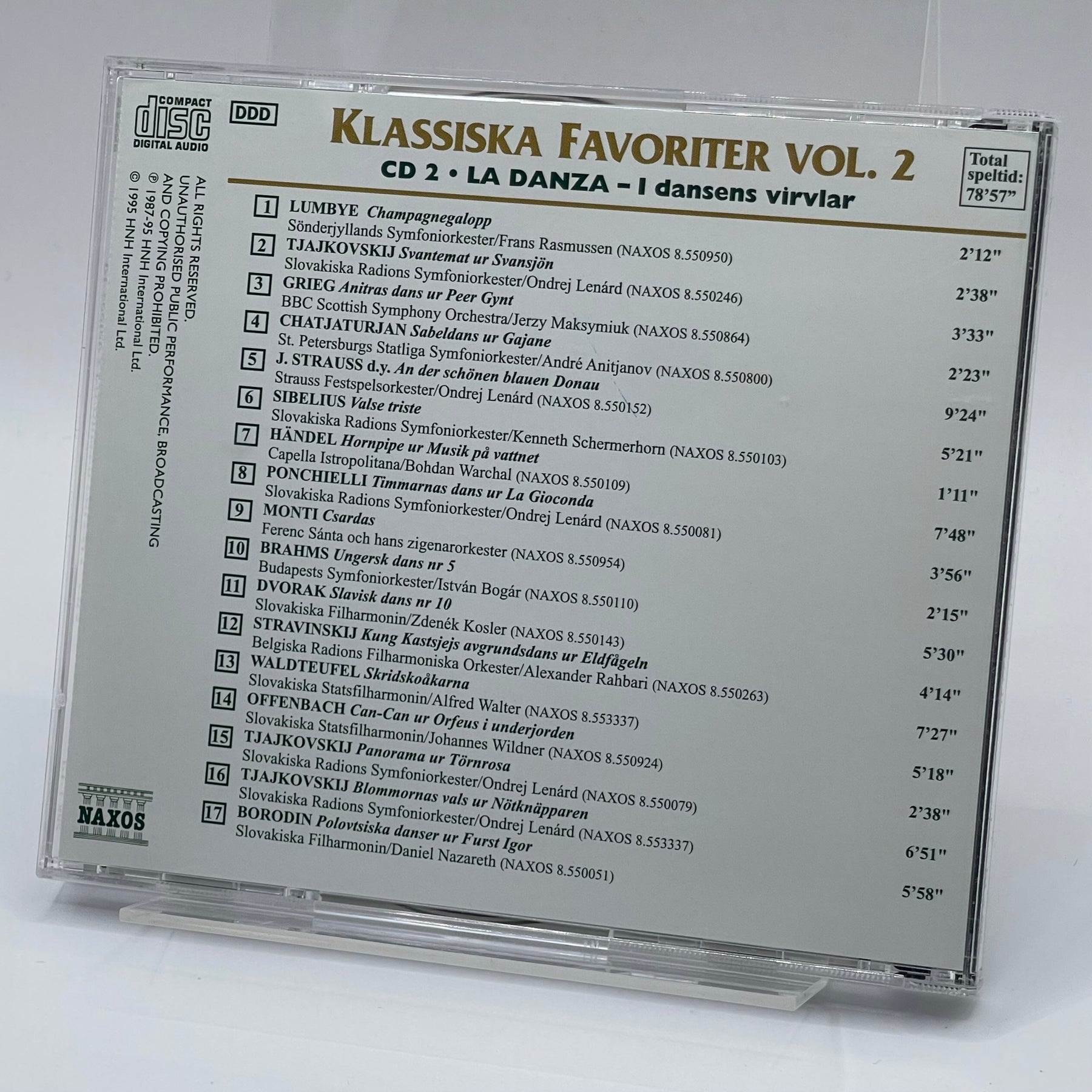 Denna CD, "Klassiska Favoriter Volym 2 - I dansens virvlar", erbjuder en vacker samling av klassisk musik från olika epoker och kompositörer. Perfekt för den musikintresserade som vill utforska eller återuppleva några av klassisk musiks mest uppskattade stycken. Skivan är begagnad men i mycket gott skick, vilket gör den till ett utmärkt tillägg till vilken musiksamling som helst.3. Produktspecifikationer