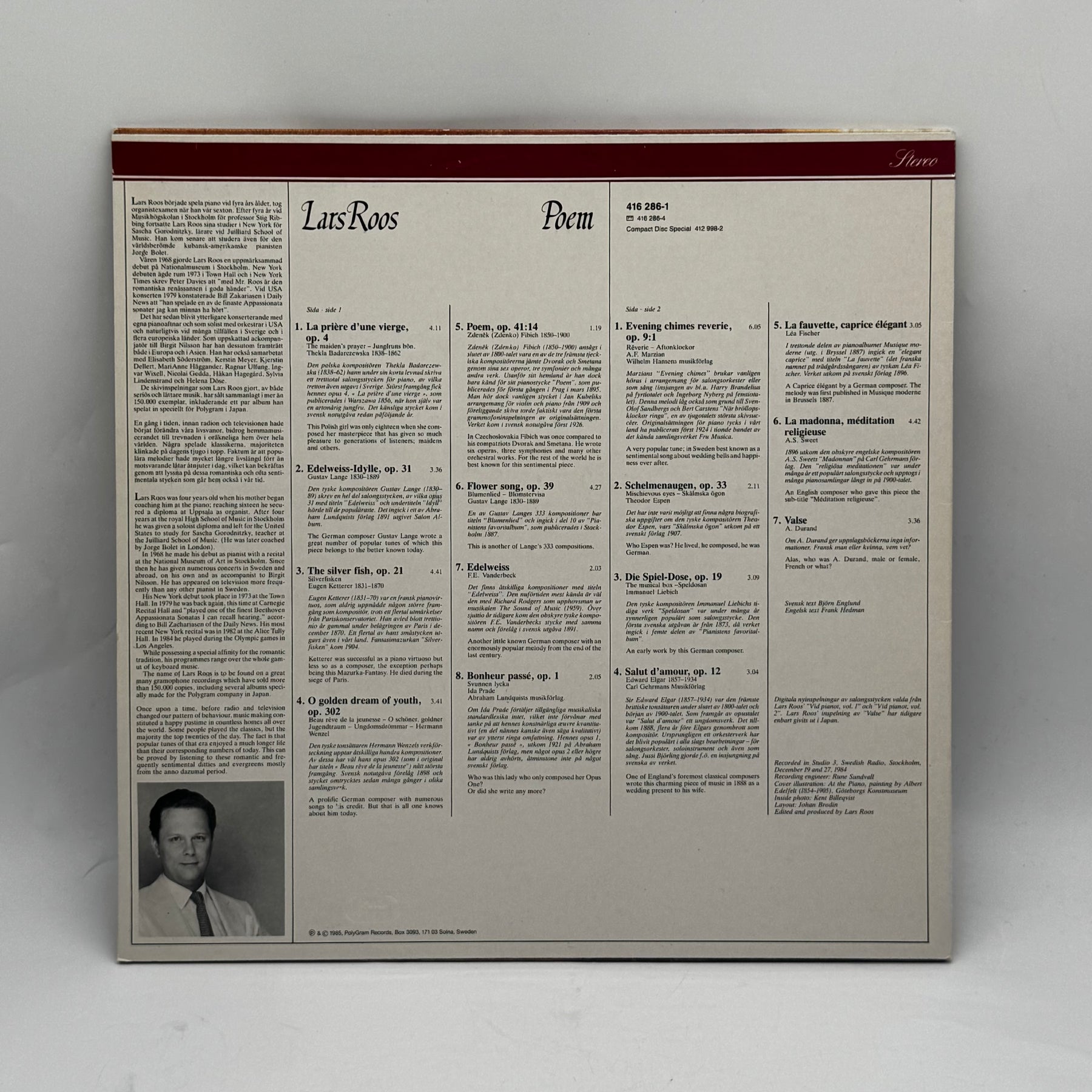 Upptäck klassisk skönhet med LP-skivan "Poem" av Lars Roos, en tidlös samling av pianostycken.Produktbeskrivning