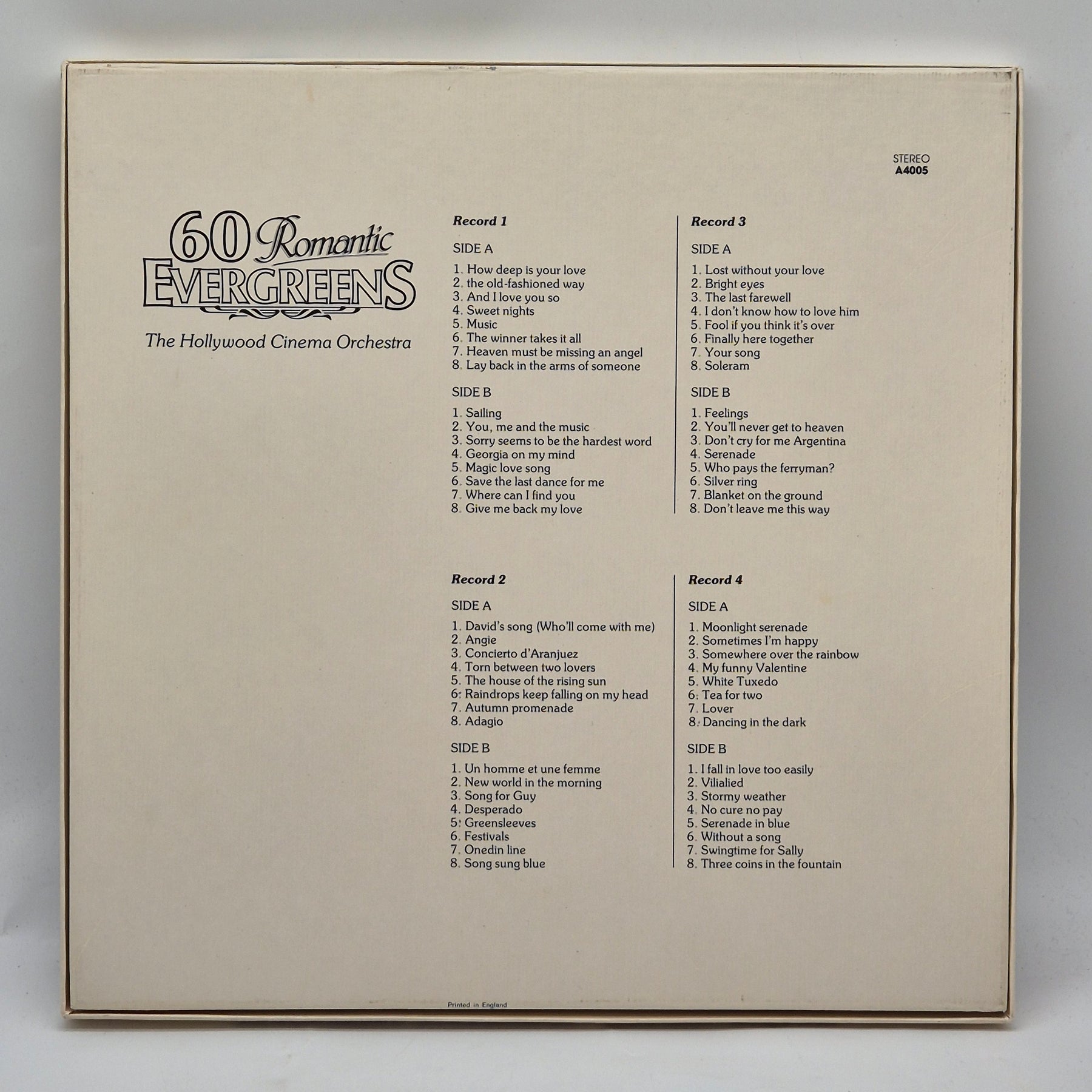 Detta album, "60 Romantic Evergreens", presenterar en samling tidlösa klassiker framförda av The Hollywood Cinema Orchestra. Boxen innehåller fyra vinylskivor fyllda med romantiska melodier som "Moonlight Serenade" och "My Funny Valentine". Denna nostalgiska skatt är det ultimata valet för samlare eller entusiaster av klassisk musik. Skicka tillstånd: Begagnad men i mycket gott skick, komplett med alla originalskivor och albumomslag.Produktspecifikationer