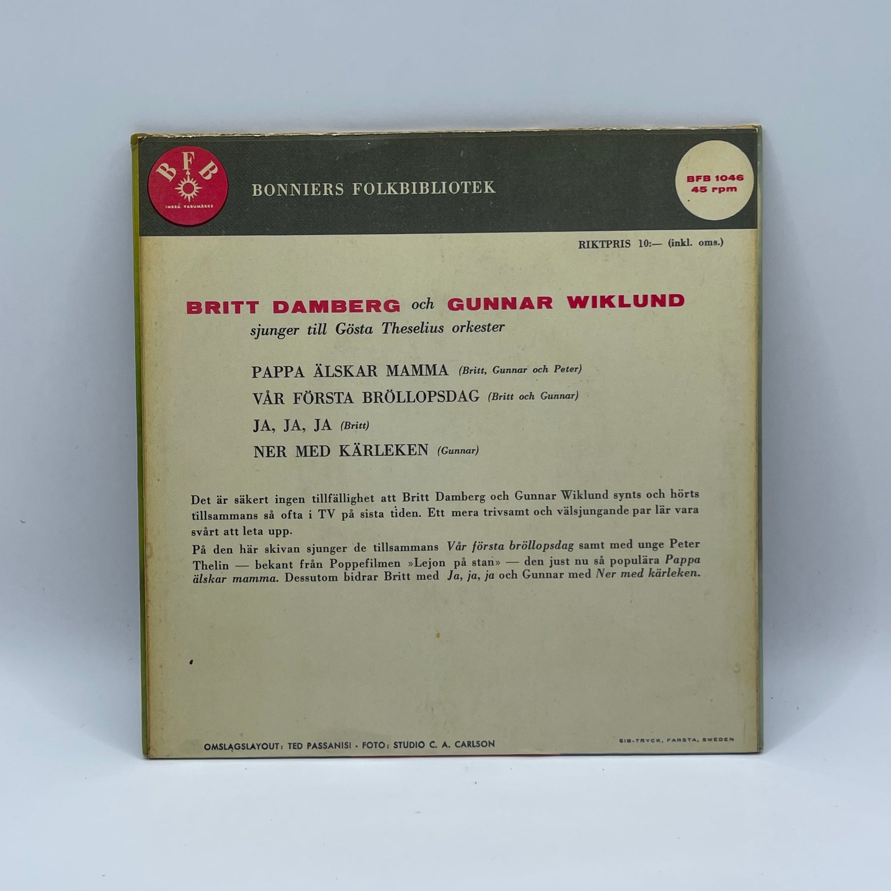Denna vinylsingel innehåller melodier som "Pappa älskar mamma" och "Vår första bröllopsdag", sjungna av Britt Damberg och Gunnar Wiklund med ackompanjemang av Gösta Theselius orkester. Skivan erbjuder en unik tidskapsel från det svenska 60-talet, perfekt för samlare eller som en retro detalj i varje hem. Skivan är begagnad men har bevarats i gott skick, och det medföljande omslaget bär på historiens charm.Produktspecifikationer