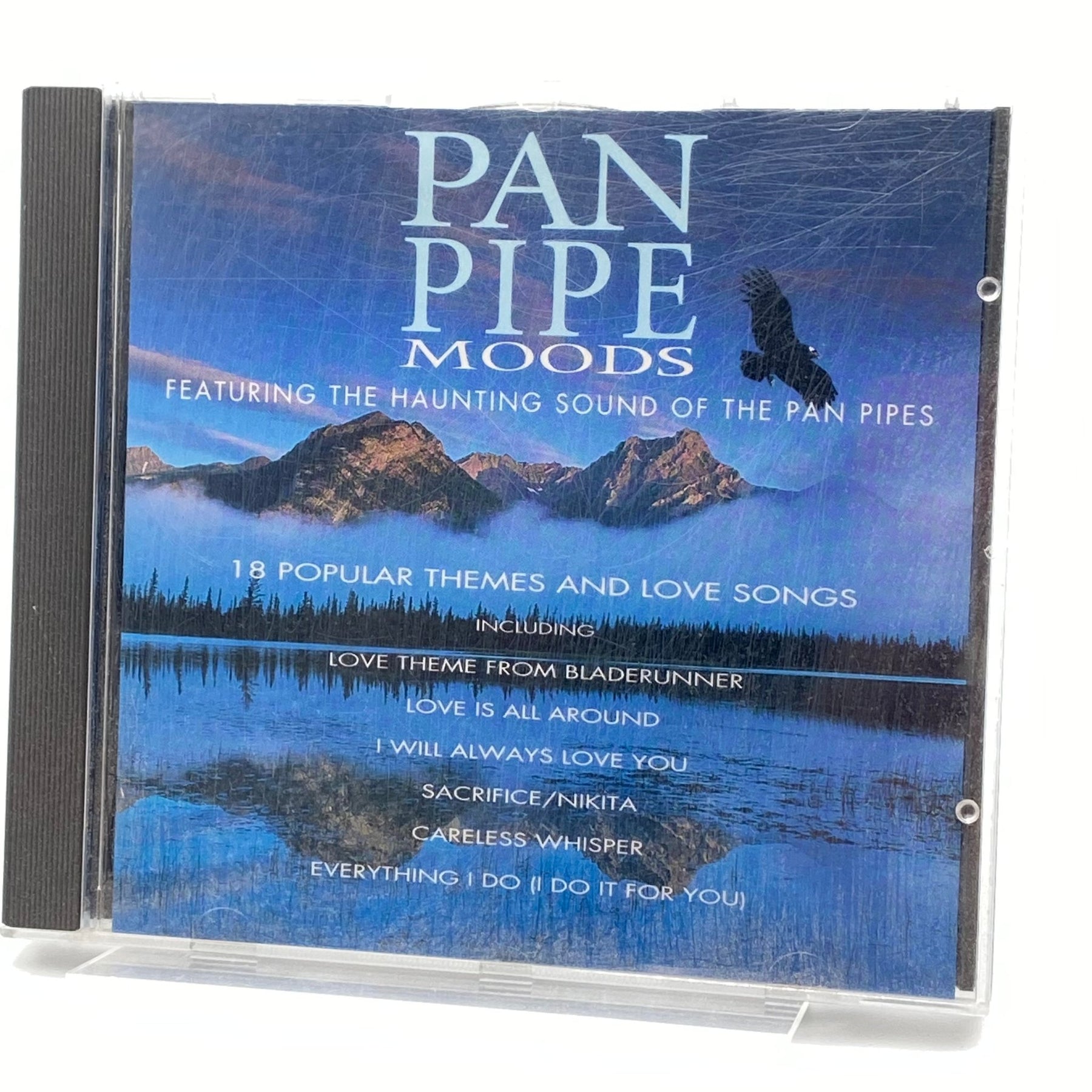 En begagnad CD med samlingen "Pan Pipe Moods", som innehåller 18 populära melodier och kärlekssånger spelade på panflöjt. Skivan är i gott skick och inkluderar välkända låtar som "I Will Always Love You" och "Careless Whisper".