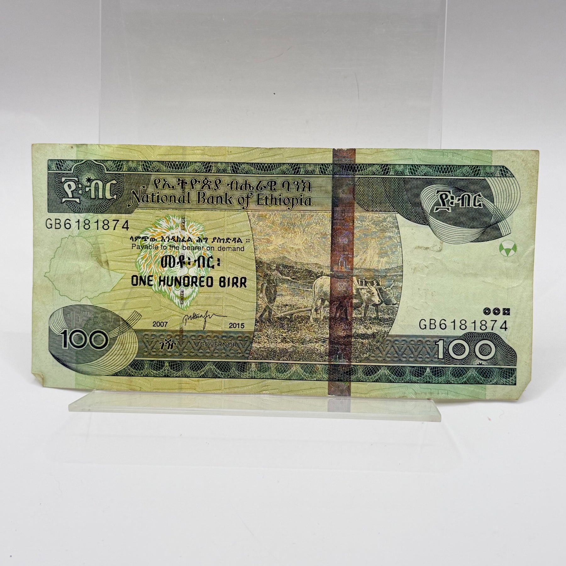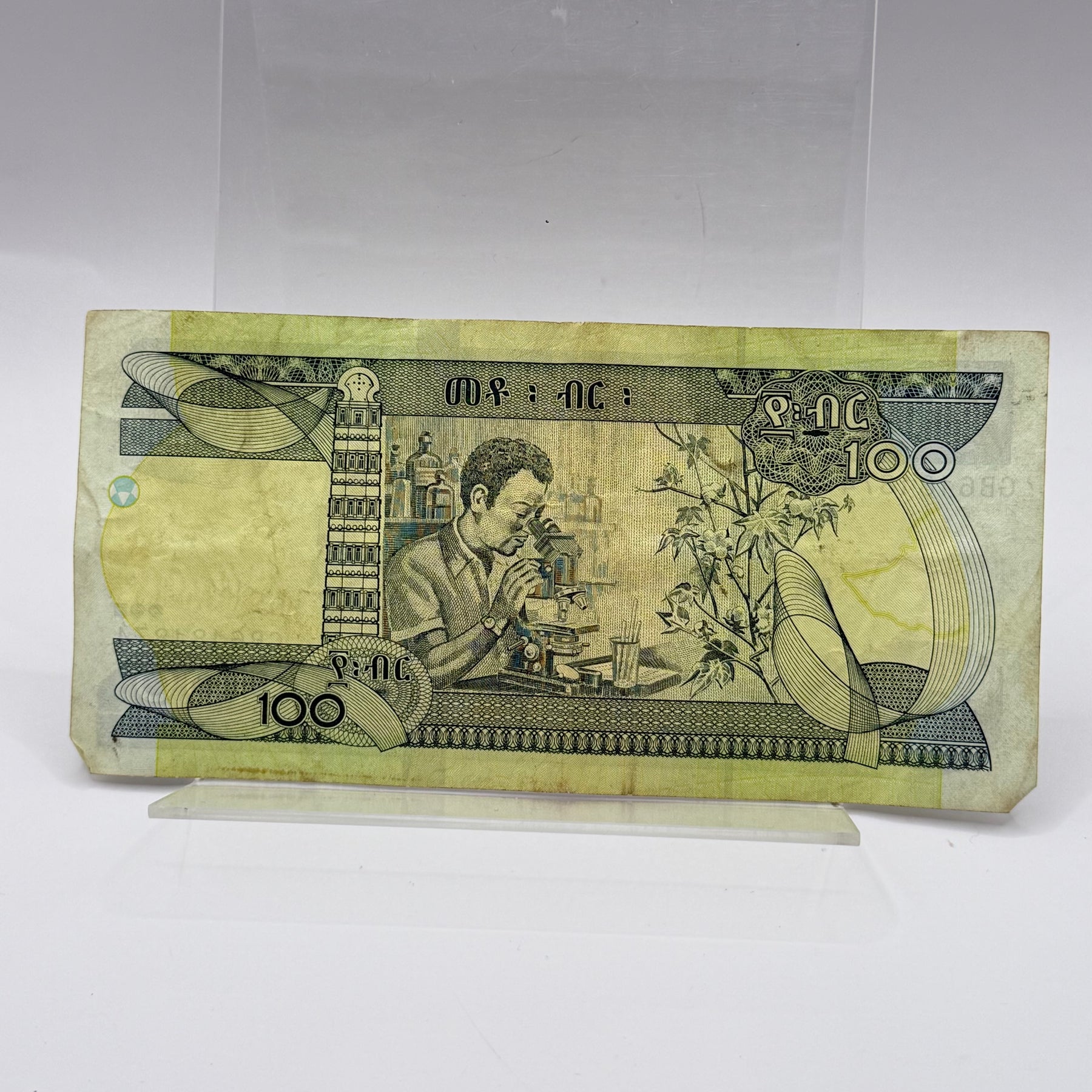 Denna 100 birr-sedel från Etiopien är inte bara ett betalningsmedel men även ett samlarobjekt med rik historisk betydelse. Framsidan avbildar en naturscen med oxar och den bakre sidan visar en forskare vid arbete, vilket speglar landets strävan efter framsteg och utbildning. Perfekt för samlare eller som en unik gåva. Sedeln är i gott skick.Produktspecifikationer