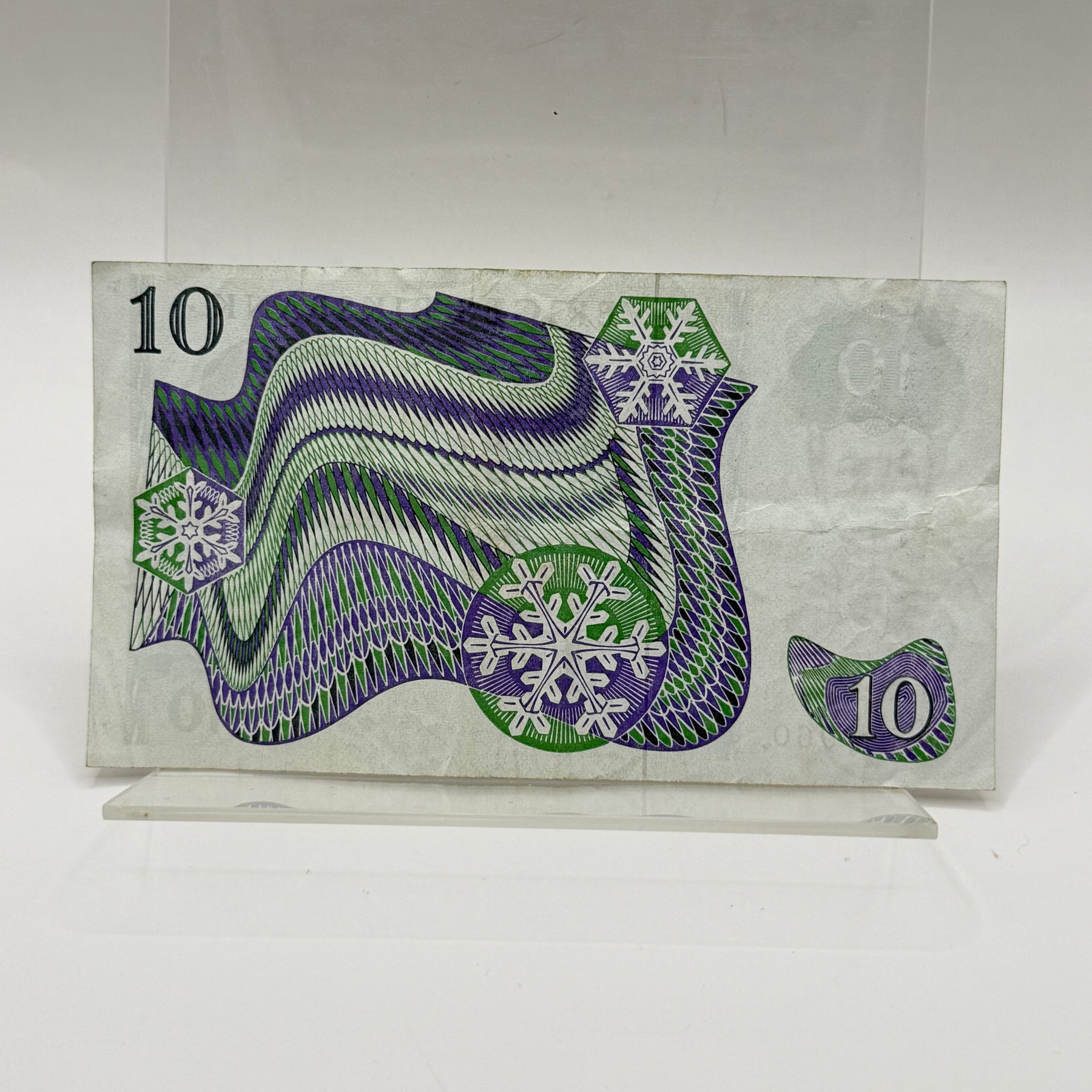 Detta är en svensk tio kronors sedel från 1989. Sedeln är prydd med ett porträtt av Gustav VI Adolf på framsidan och en abstrakt, konstnärlig design med snöflingor på baksidan. Perfekt för samlare eller som en unik dekoration. Begagnad men välbevarad med minimala tecken på användning.Produktspecifikationer