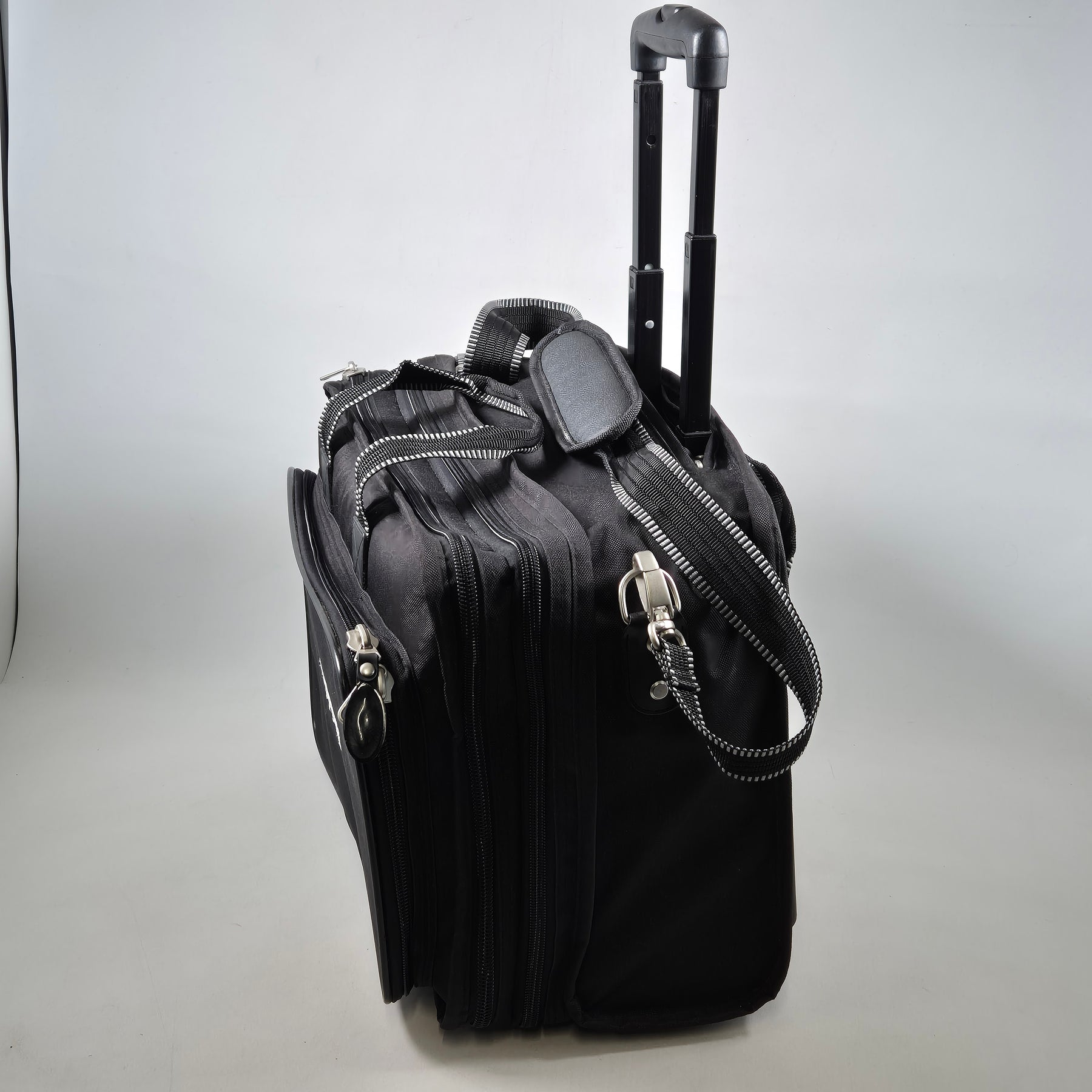 Denna rullväska är perfekt för både affärsresan och weekendresan. Tillverkad av slitstarkt material med flera funktionella fack, vilket gör den idealisk för ordnad förvaring av dina tillhörigheter. Den robusta utdragshandtaget och smidiga hjulen erbjuder enkel manövrering genom flygplatsens terminaler och stadens gator. Den är begagnad men i mycket gott skick, redo för många fler resor.Produktspecifikationer