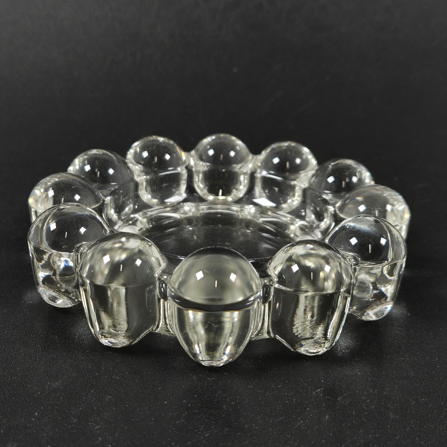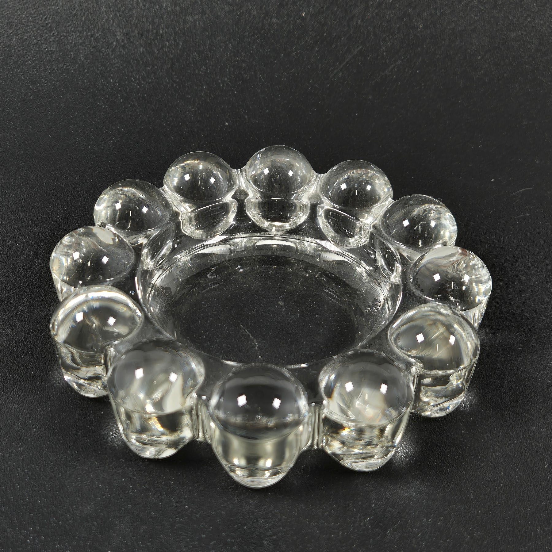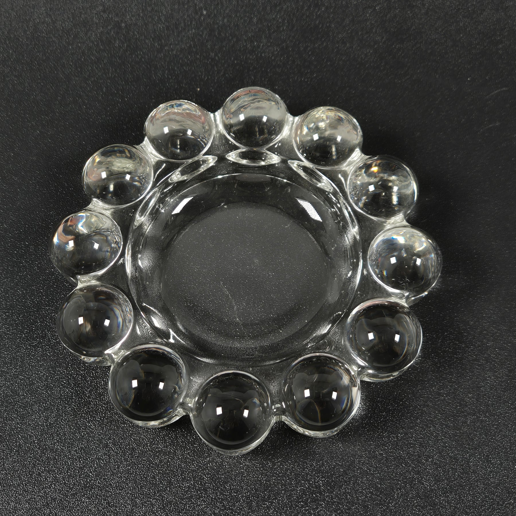 Denna charmiga askfat är tillverkad av genomskinligt glas med en distinkt och dekorativ design bestående av bubblande kulor runtom. Inte bara är den en stilig dekoration, men den fungerar även utmärkt för att hålla små föremål eller som en central prydnad på ditt bord. Dess genomskinliga material ger en känsla av rymd och ljus. Glasaskfatet är begagnat men fortfarande i mycket gott skick, och bevarar sin klarhet och lyster.