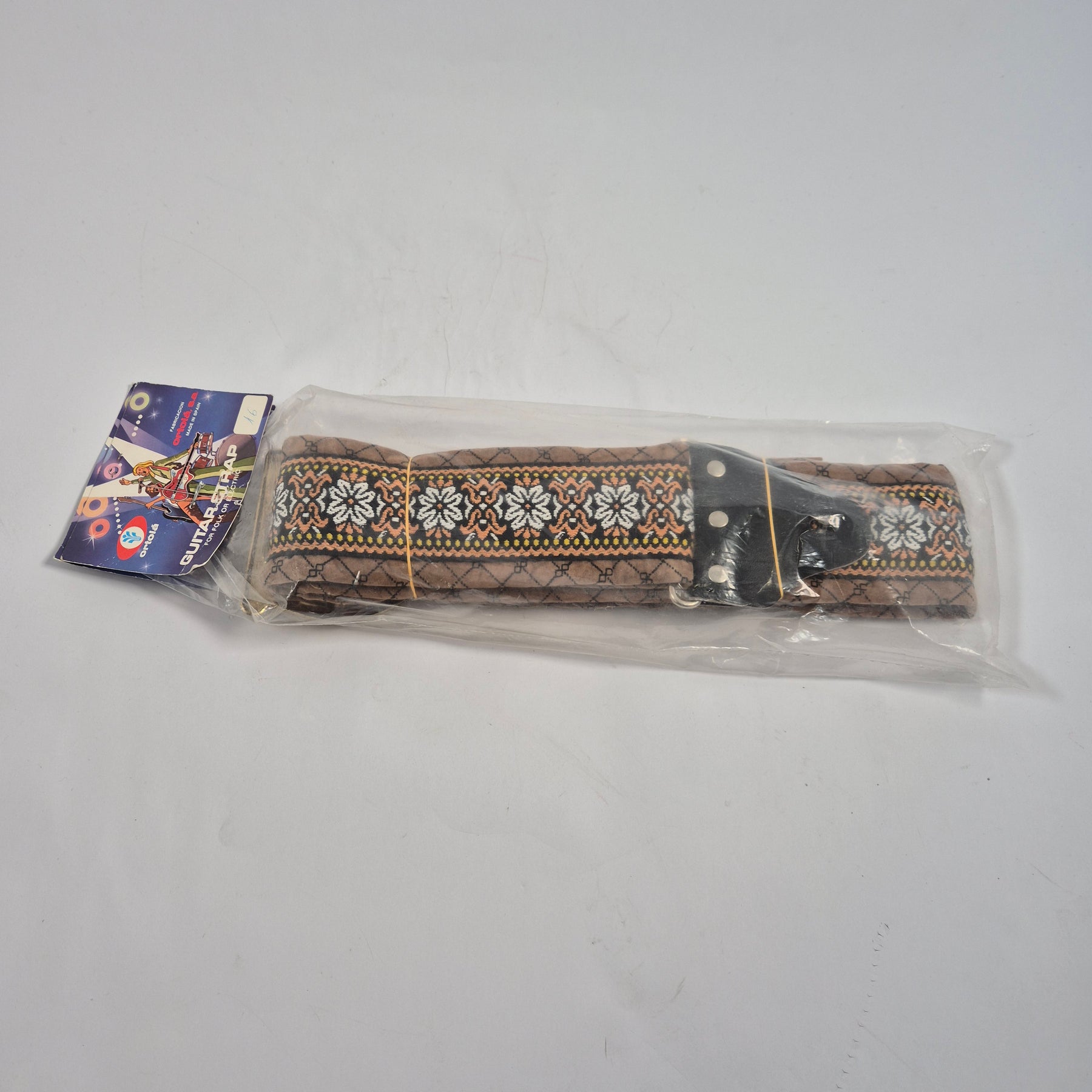 Detta gitarrband från spanska Ortolá är designat för folk- och elgitarr och har ett beige band med broderat blommönster i vitt, orange och svart samt stor metallring i mässingsfärg. Den vadderade konstruktionen ger bra komfort över axeln och den justerbara längden gör att det passar de flesta spelare. En härlig vintageaccessoar för dig som uppskattar både stil och funktion, begagnad men i mycket gott skick.