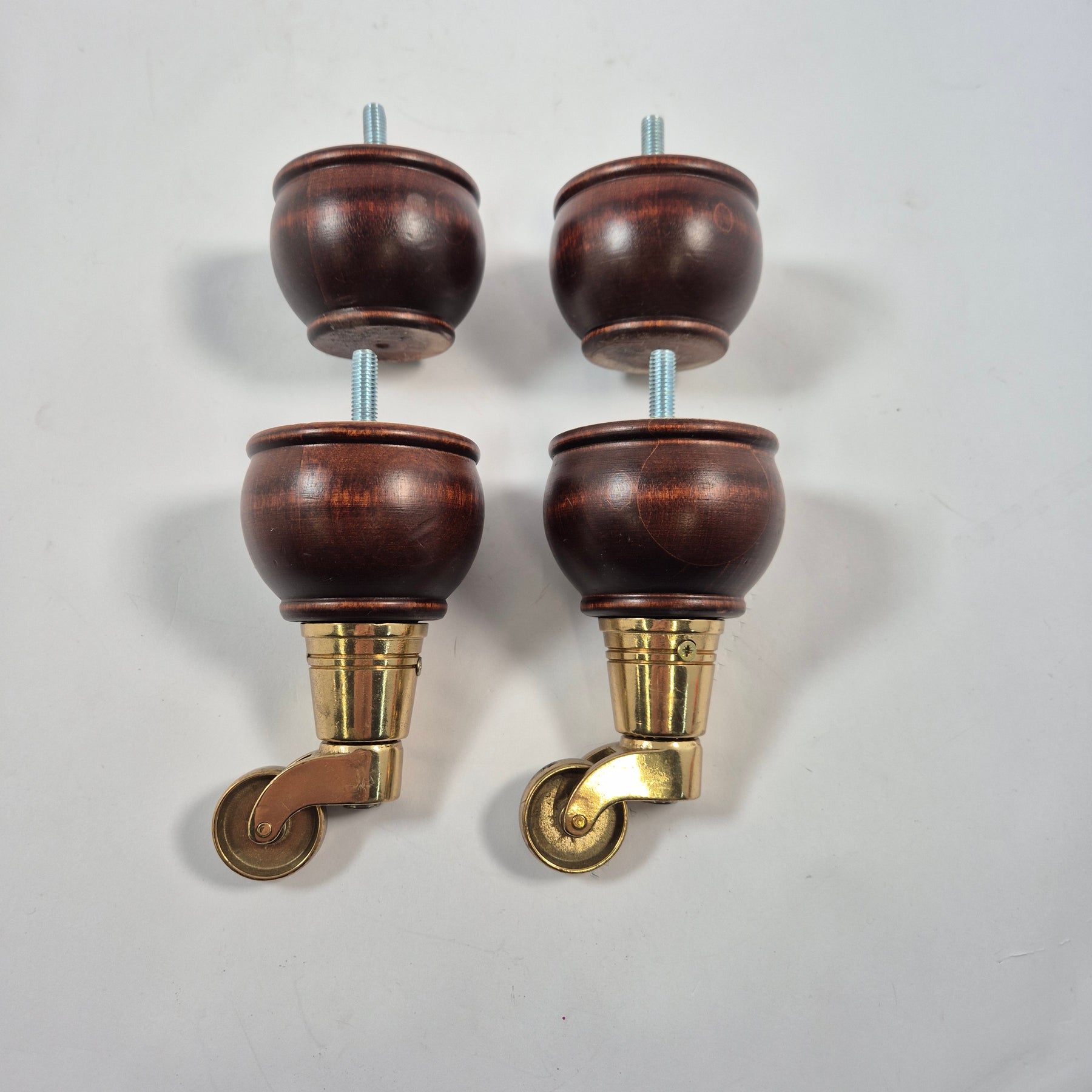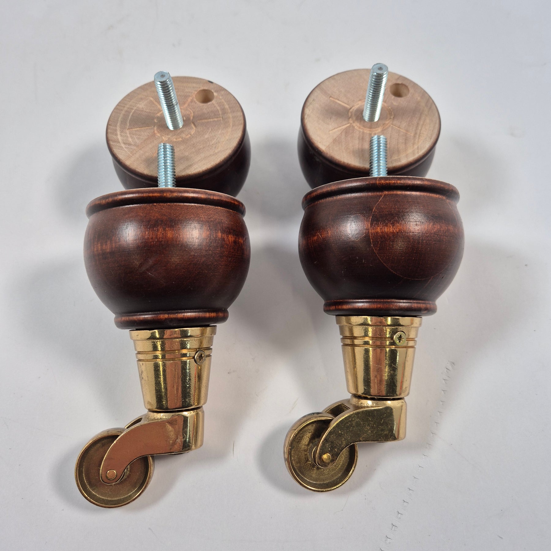 Detta är ett set om fyra mörkbetsade träben med dekorativa mässingsfärgade hjul, redo att skruvas direkt i möbeln. De kombinerar stabilitet med smidig rörlighet och passar utmärkt till exempelvis soffa, fåtölj eller byrå som behöver både höjd och flyttbarhet. Benen är begagnade men i mycket gott skick med endast mindre spår av användning – ett stilfullt val för dig som gillar klassiska detaljer och hållbar inredning.3. Produktspecifikationer