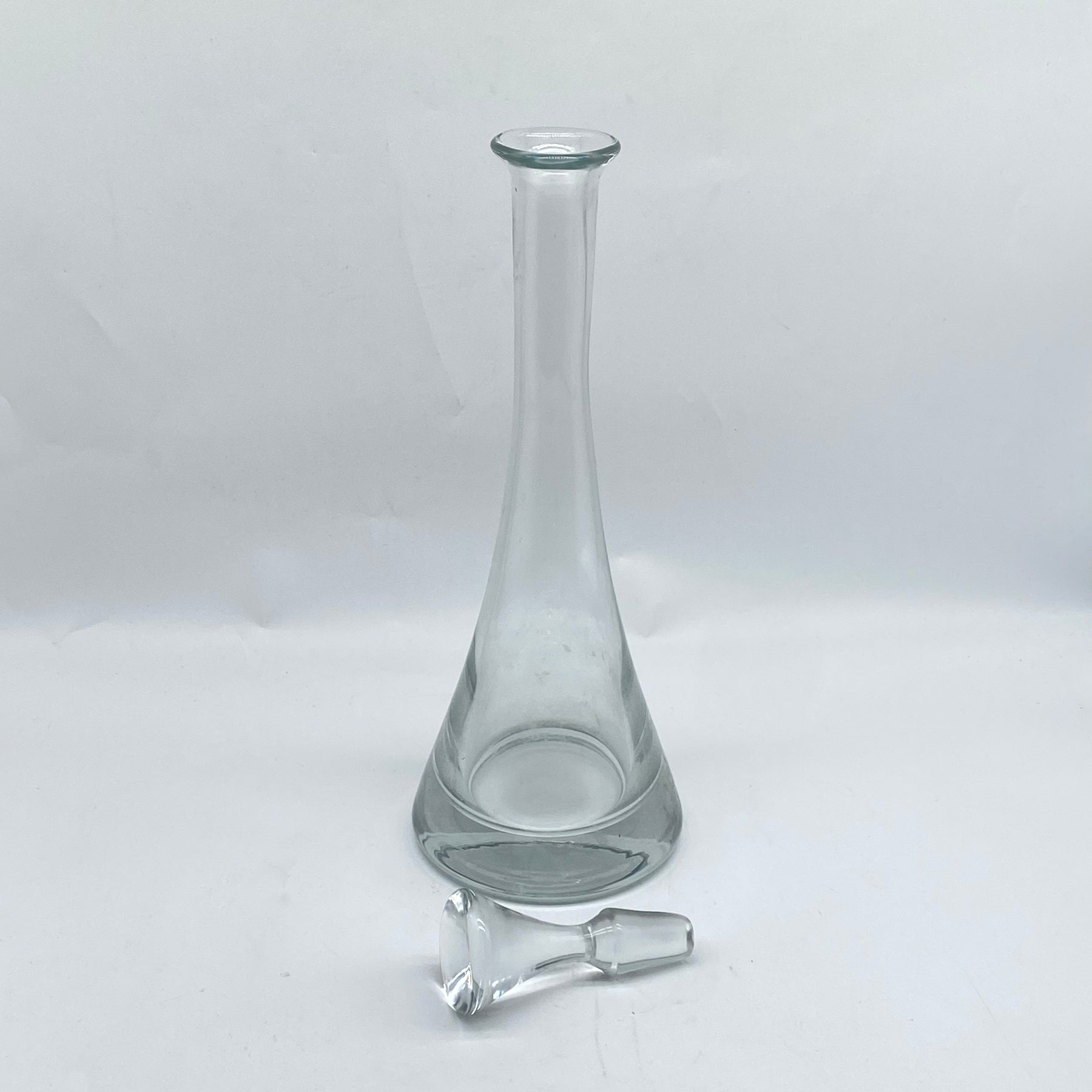 Denna eleganta glaskaraff är idealisk för servering av viner eller andra drycker. Den har en klassisk design med en smal hals som är både funktionell och visuellt tilltalande, vilket minimerar spill. Karaffen är tillverkad av genomskinligt glas som ger en ren och sofistikerad känsla till din dukning. I mycket gott skick, karaffen visar minimala tecken på användning och underhåller sin ursprungliga klarhet och lyster.Produktspecifikationer