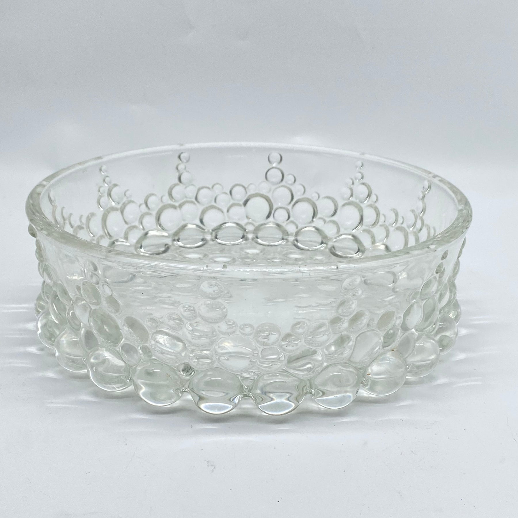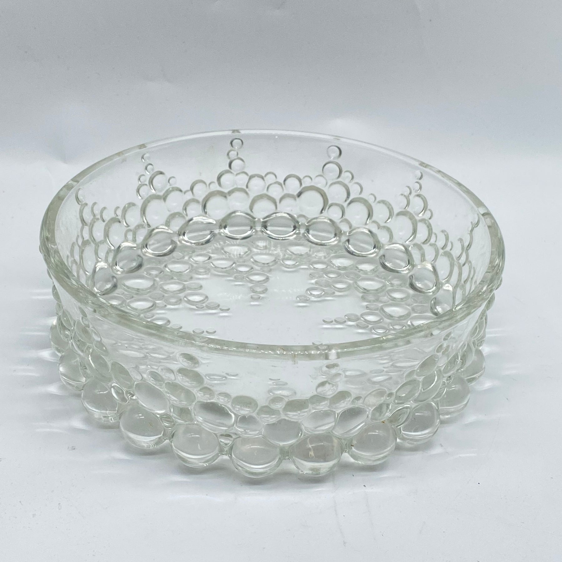 Denna ljusa och genomskinliga glasfat pryds av ett iögonfallande mönster av bubblor som fångar ljuset vackert. Dess runda form och eleganta design gör den till en utmärkt dekorativ accent i varje rum. Glasfatet är inte bara en estetisk fröjd utan även praktiskt för att servera godis eller som en del i en större dukning. Varje detalj är noggrant framställd för att skapa en känsla av tidlös elegans, samtidigt som det är funktionellt. Fatet är begagnat men fortfarande i utmärkt skick, vilket gör det till en ansvarsfull och stilfull inredningsinvestering.