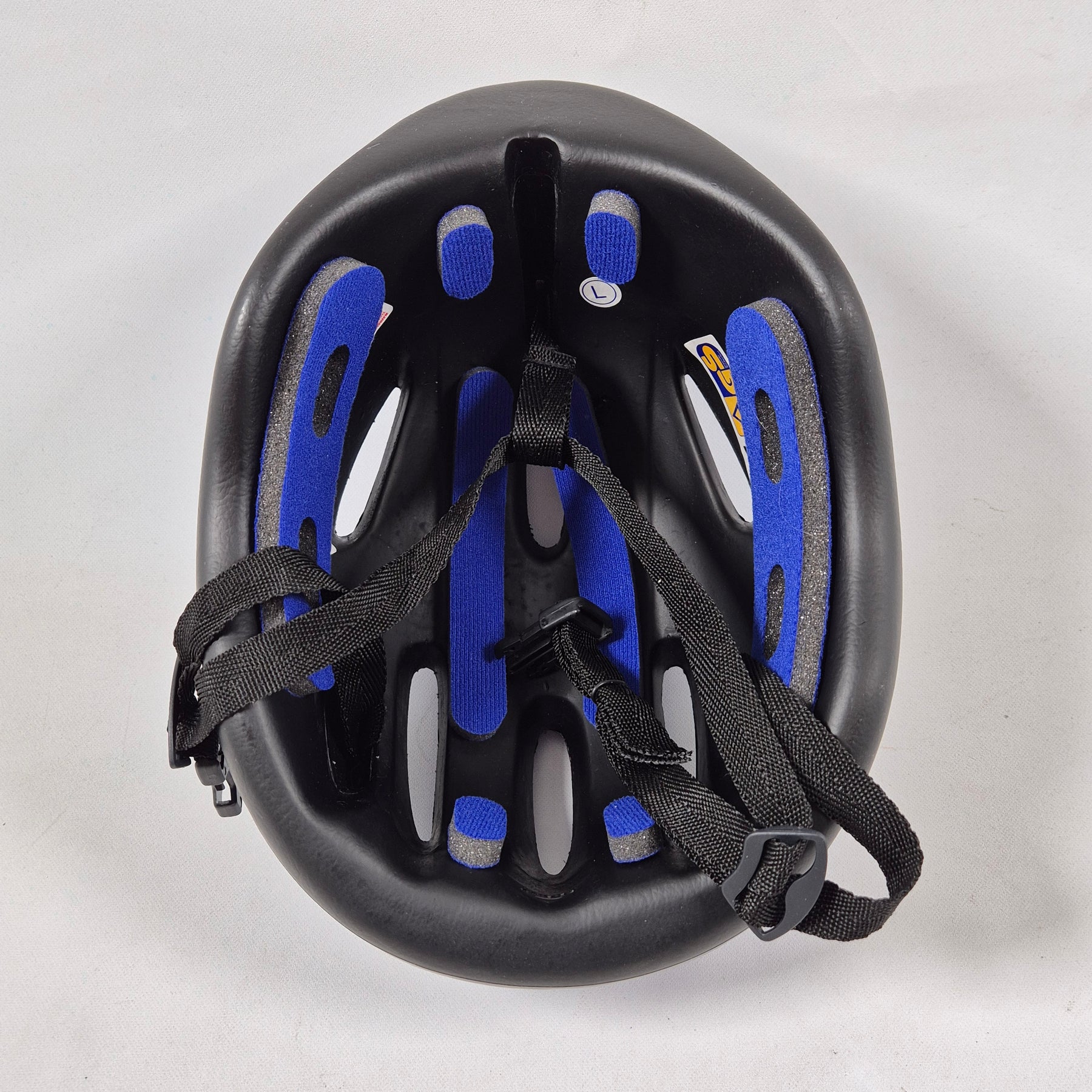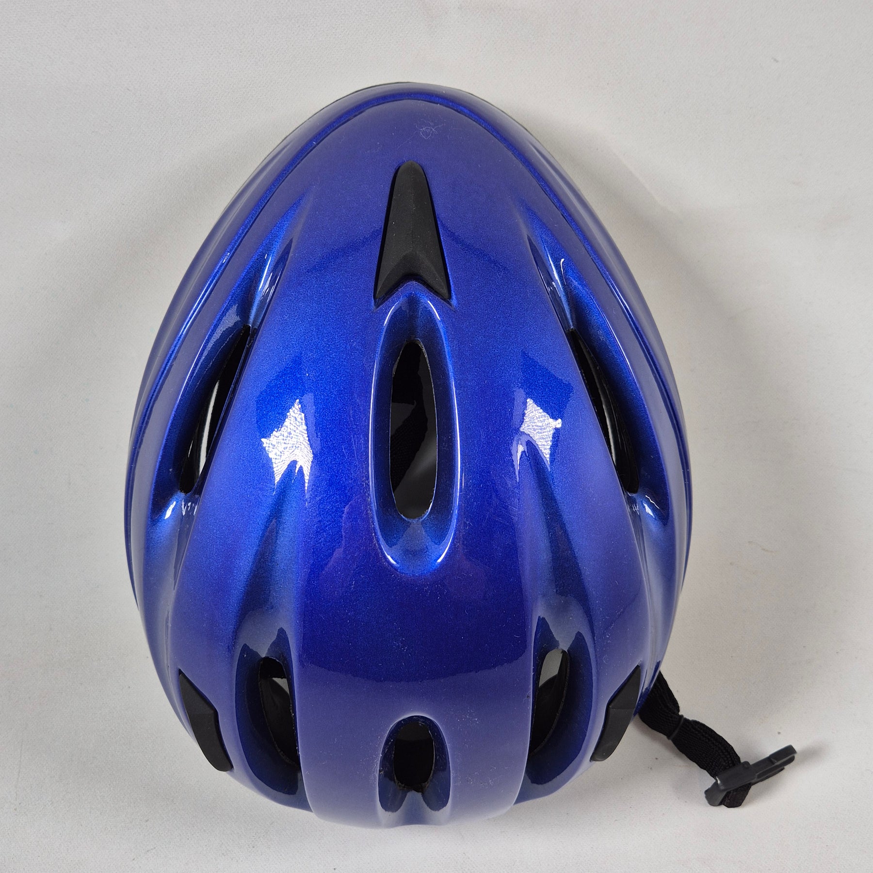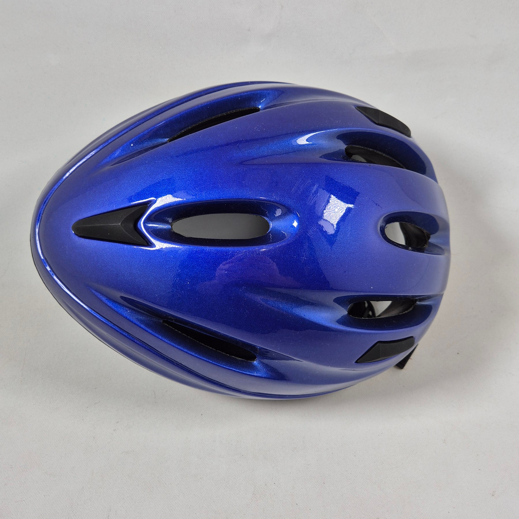 Det här är en modern och funktionell cykelhjälm i en slående blå färg med högglansfinish. Hjälmen är designad för att erbjuda maximalt skydd och komfort medan du cyklar. Dess lätta konstruktion och luftventilationshål gör den idealisk för både dagliga pendlingar och längre turer. Produkten är begagnad men i mycket gott skick, komplett med originalförpackning och extra stoppning för anpassad passform.