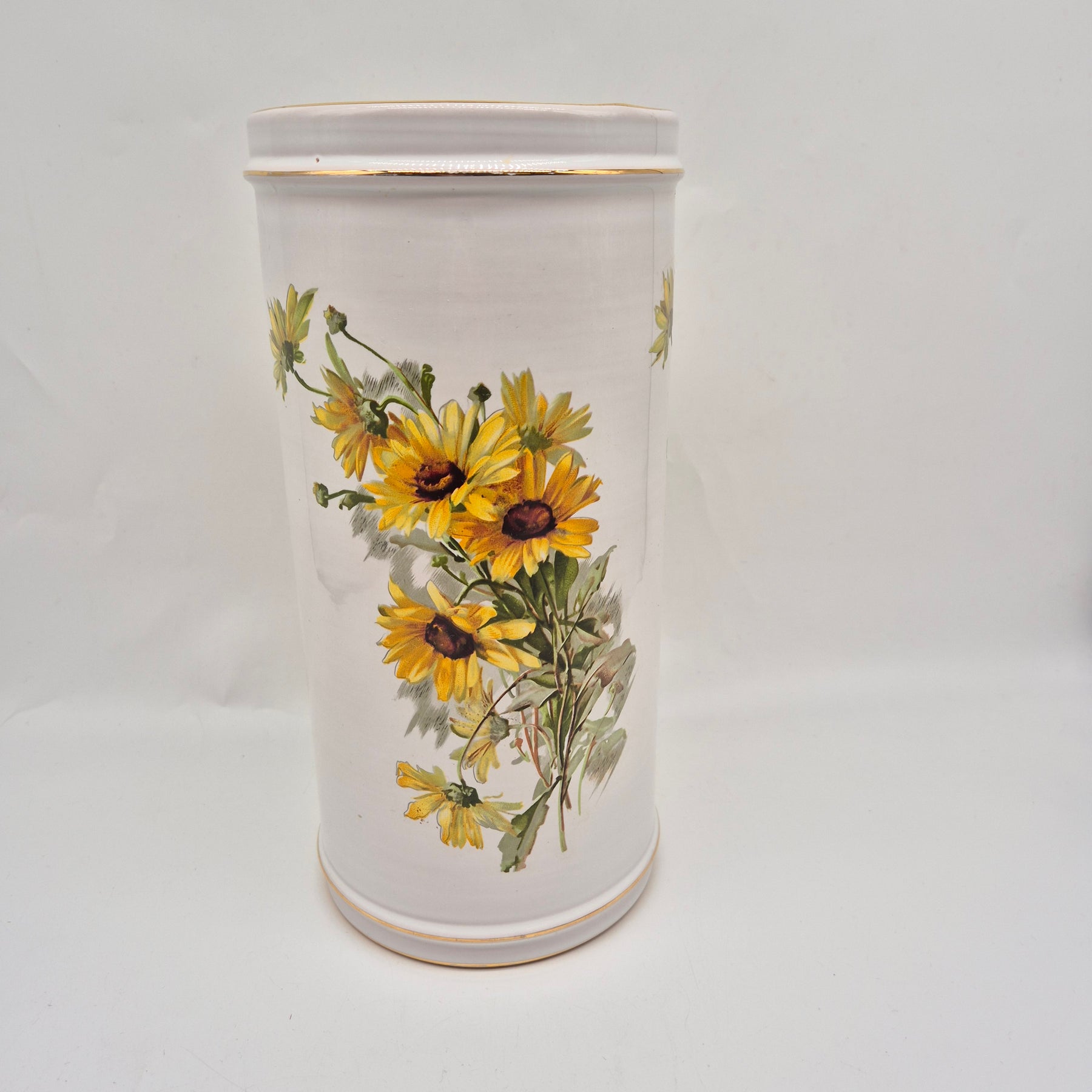 Denna dekorativa burk, tillverkad i Italien av kända Il Brocchio, bjuder på en harmonisk kombination av stil och funktion. Med en livlig design av solrosor som sveper runt burken, tillför den en varm och välkomnande anda till vilket rum som helst. Den är inte bara en charmig inredningsdetalj utan också praktisk för förvaring av kökstillbehör eller småsaker. Burken är begagnad men i mycket gott skick, vilket gör den till ett hållbart val för både esteter och miljömedvetna samlare.