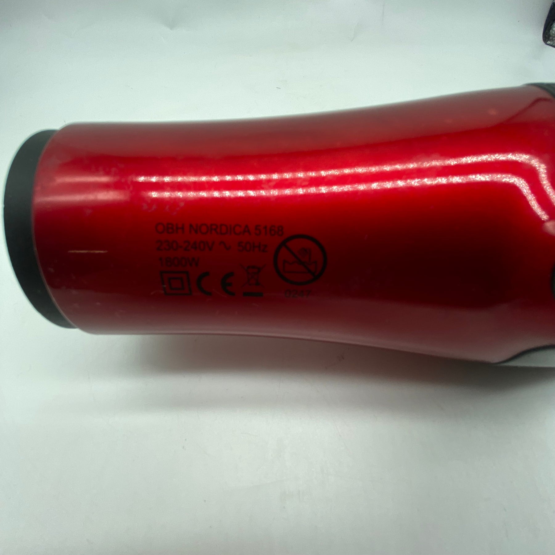 Upptäck effektiviteten med denna eleganta röda hårtork från OBH Nordica, perfekt för en snabb och effektiv styling.