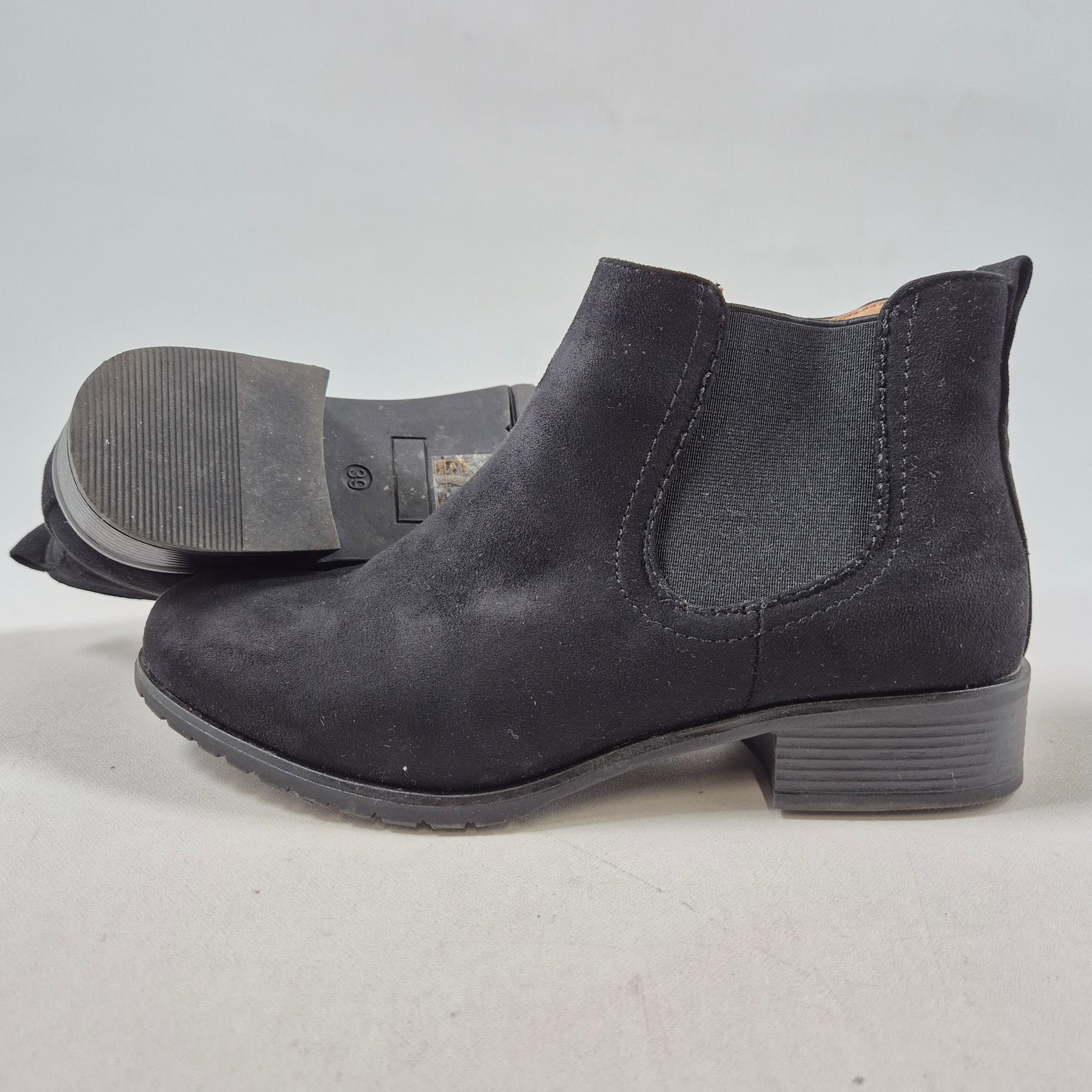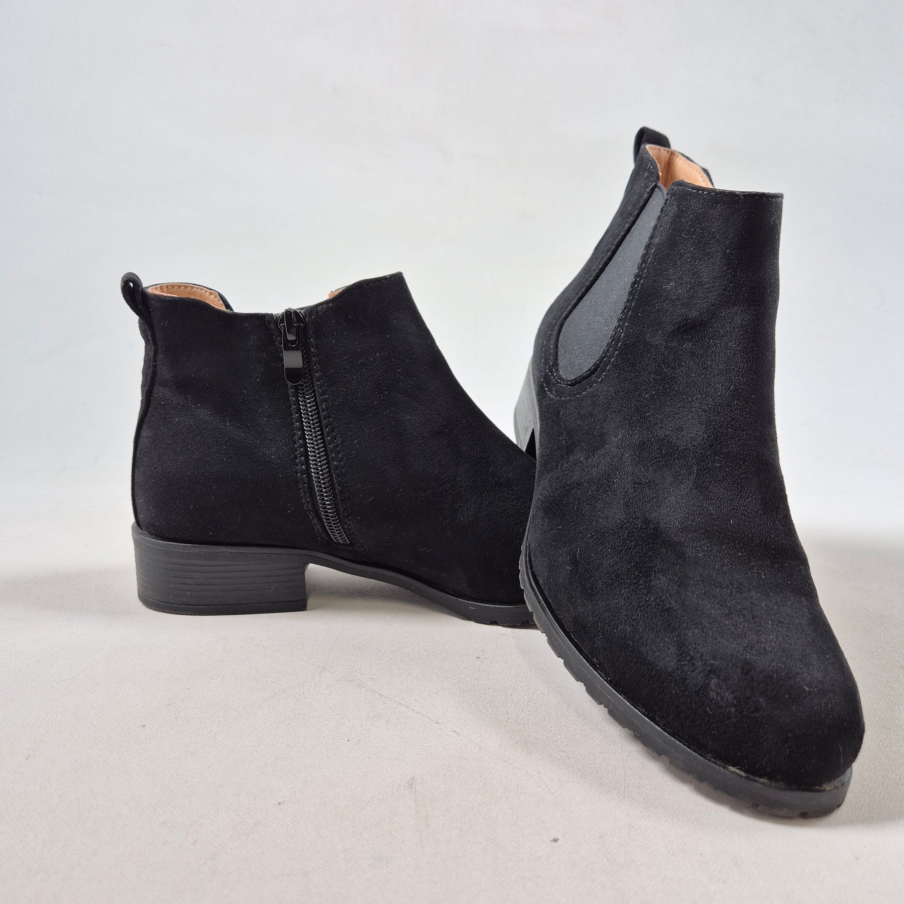 Dessa snygga herrstövlar i svart mocka är både mångsidiga och trendiga. Designade för att erbjuda optimal komfort och hållbarhet, de har en klassisk design med elastiska sidopaneler som gör dem enkla att ta på och av. Skorna är lämpliga för såväl formella som informella sammanhang och är i gott skick, vilket gör dem till ett utmärkt köp för fashionabla män på språng.