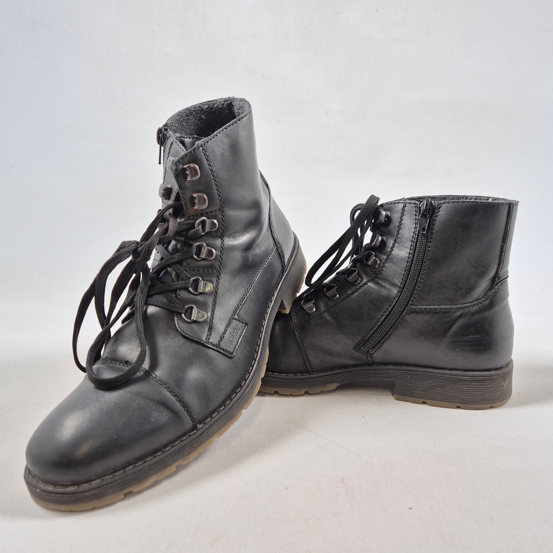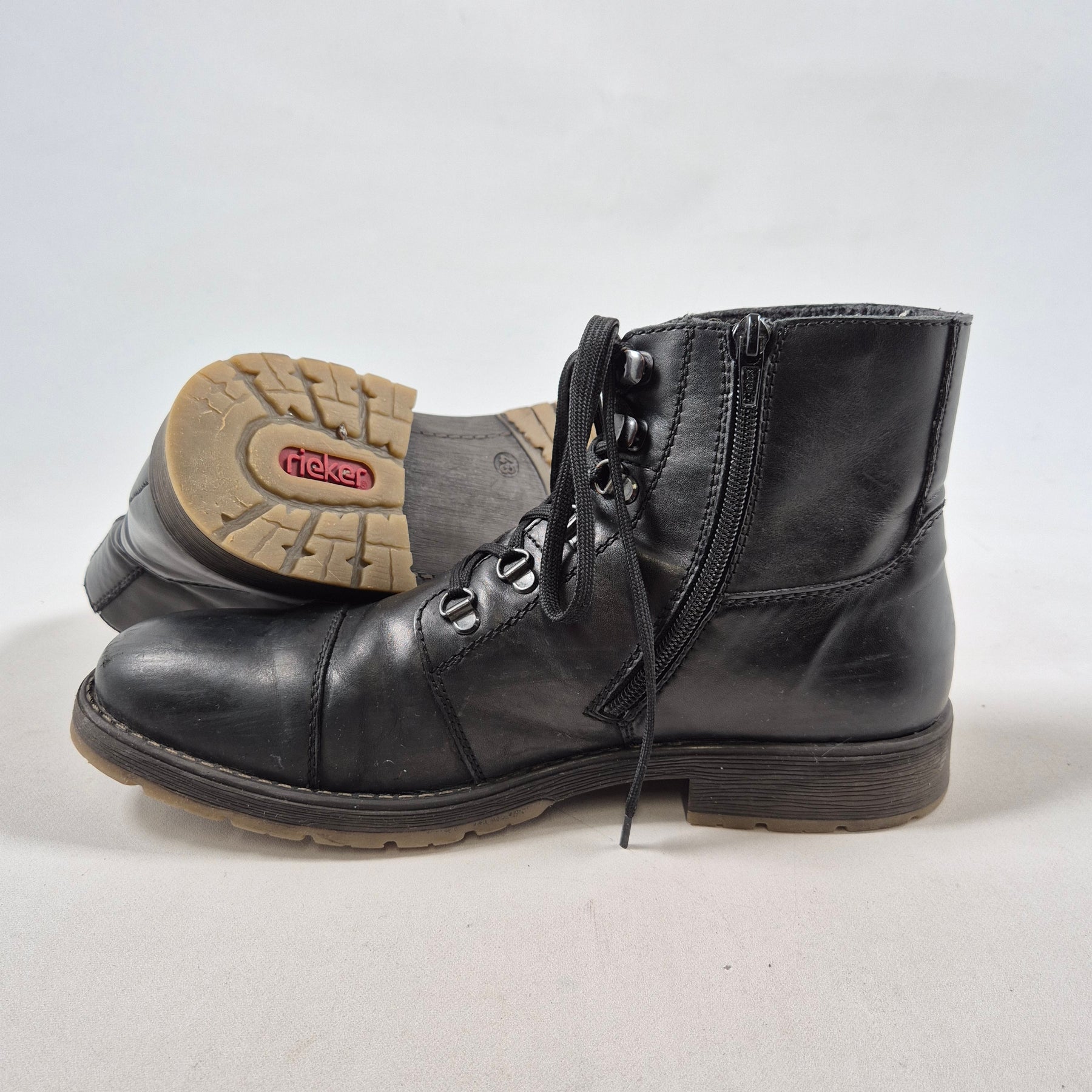Dessa herrkängor från välkända Rieker är tillverkade i slitstarkt läder med en klassisk och stilren design. Perfekta för kyligare väder tack vare det tjocka och värmande foderet inuti. De är inte bara praktiska med sin slitstarka sula och snörning för optimal passform, utan också fashionabla för alla tillfällen. Skicket är begagnat men kängorna är välvårdade och i mycket gott skick.