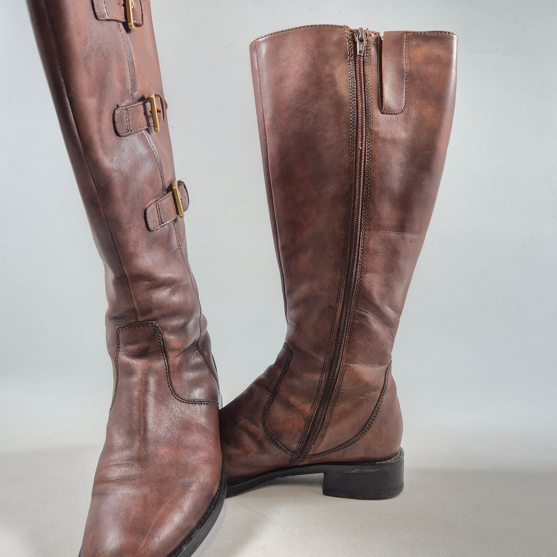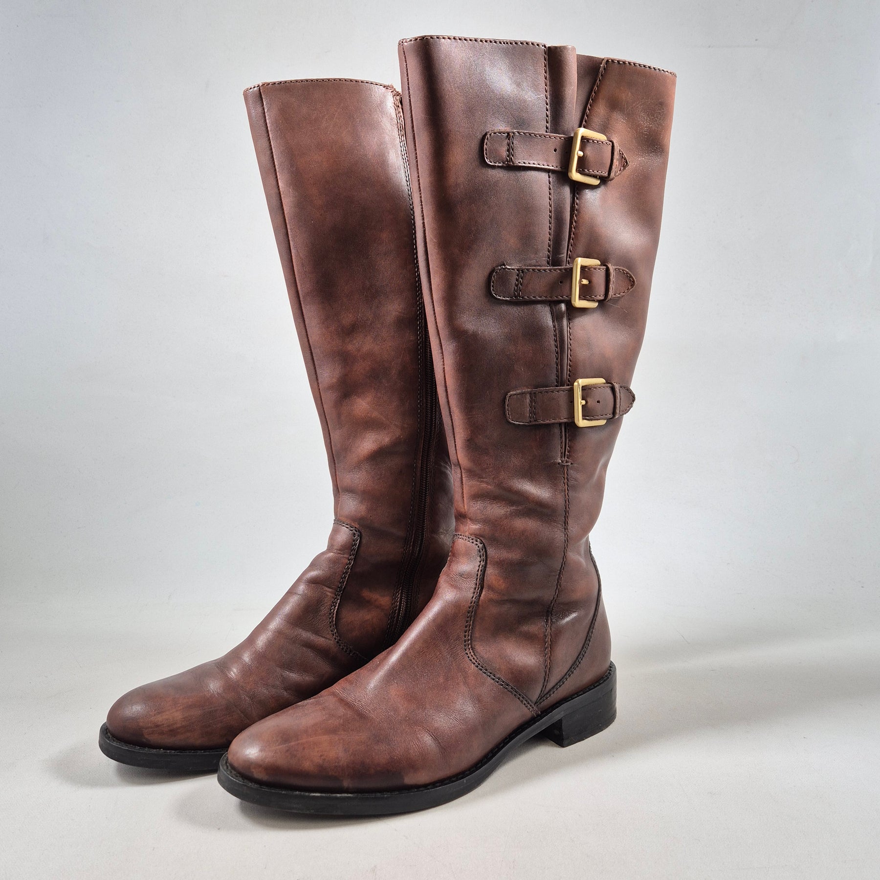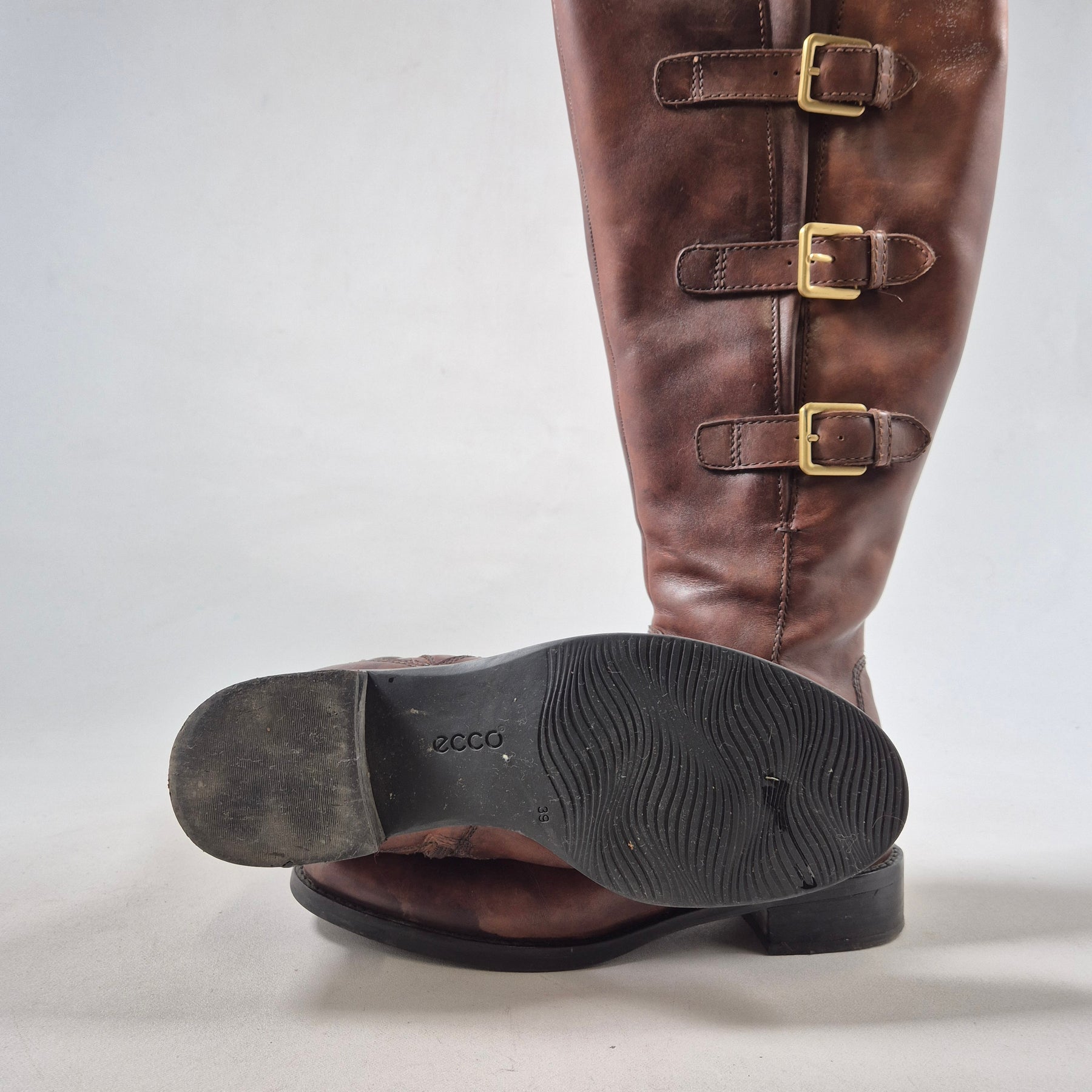 Dessa är högkvalitativa läderstövlar i brunt med justerbara spännen för en anpassningsbar passform. Från det välkända varumärket ECCO, erbjuder dessa stövlar både komfort och hållbarhet. Den tidlösa designen gör dem till ett perfekt val för både vardagligt och mer formellt bruk. De är begagnade men i mycket gott skick, vilket gör dem till ett utmärkt köp för den miljömedvetna köparen.Produktspecifikationer