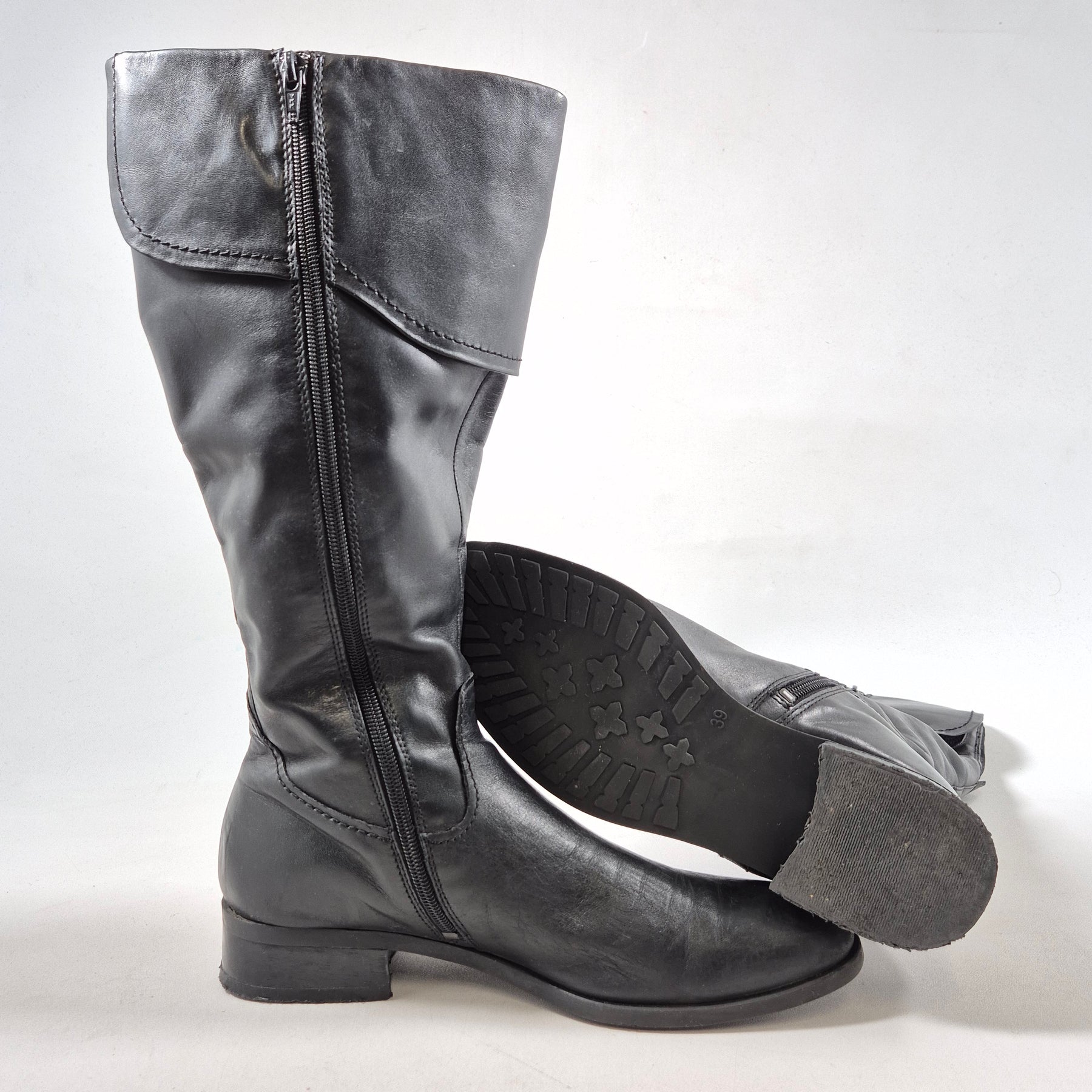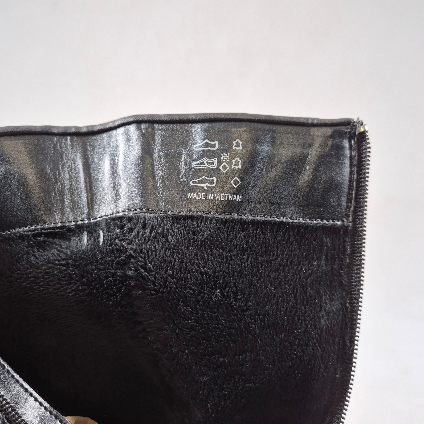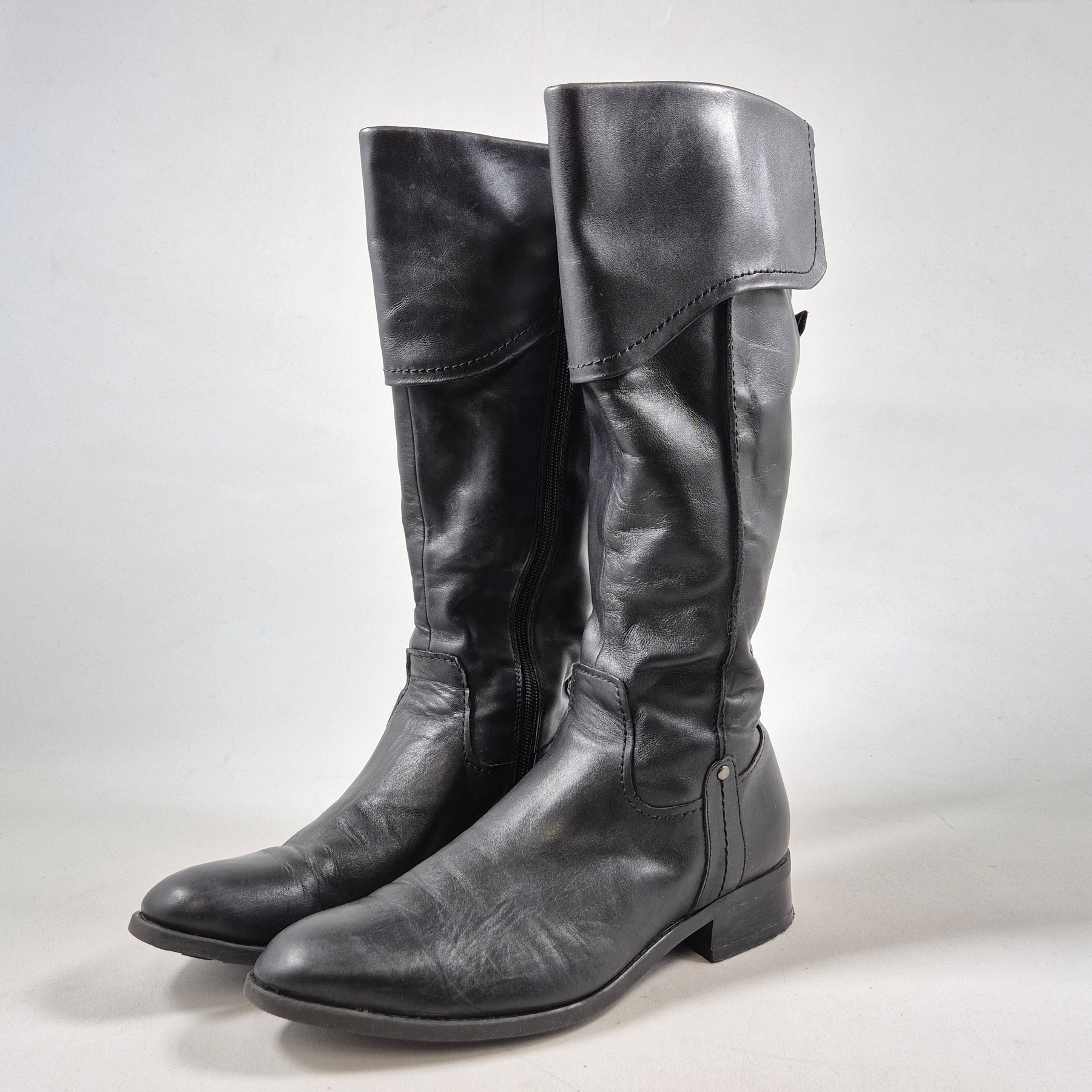 Dessa är höga, svarta läderstövlar som ger både stil och komfort. Tillverkade i slitstarkt läder och designade med en smidig dragkedja för enkel på- och avtagning. Perfekta för såväl vardagsbruk som till finare tillfällen, dessa stövlar är en tidlös tillägg till din garderob. Begagnade men i mycket gott skick, de har bara mindre tecken på användning.