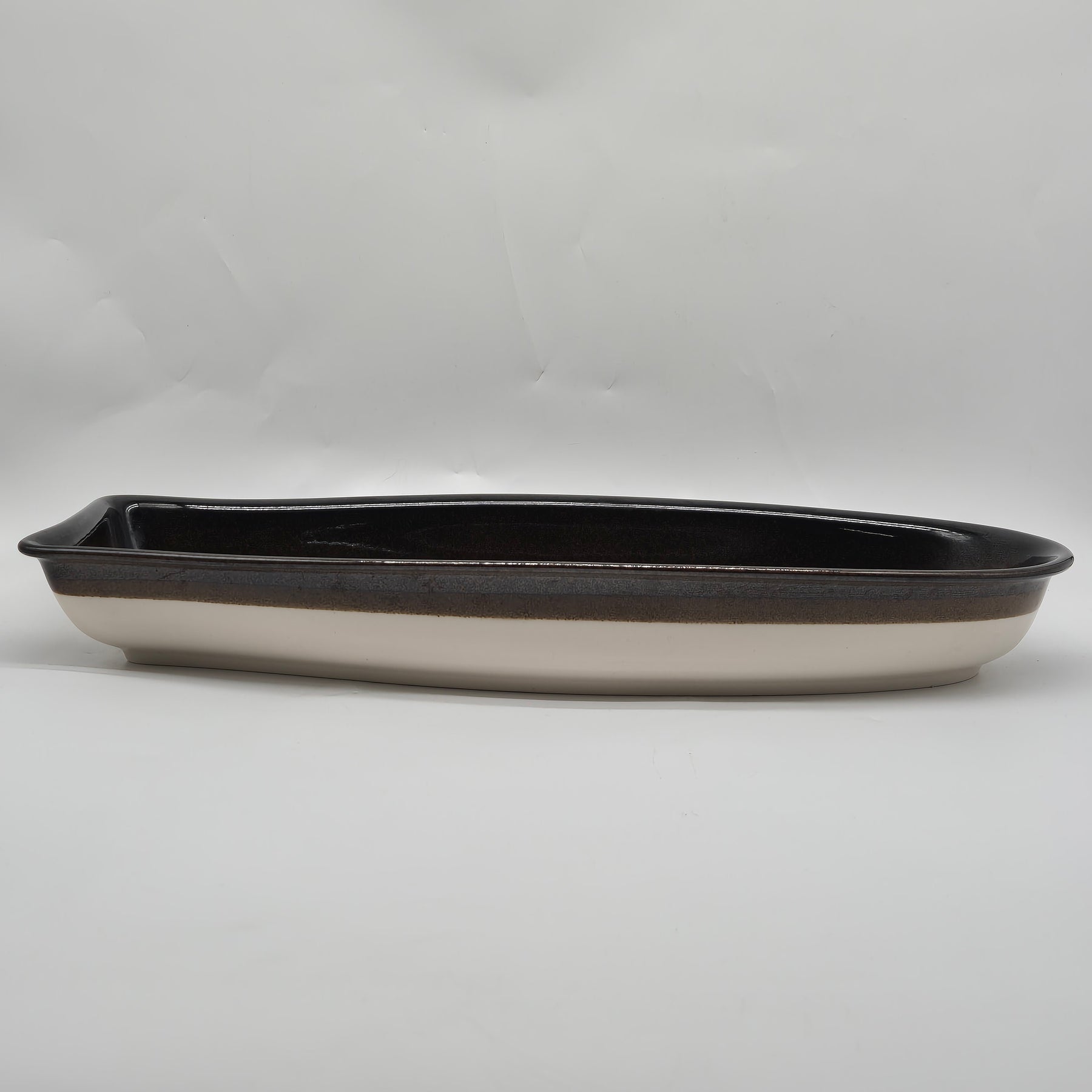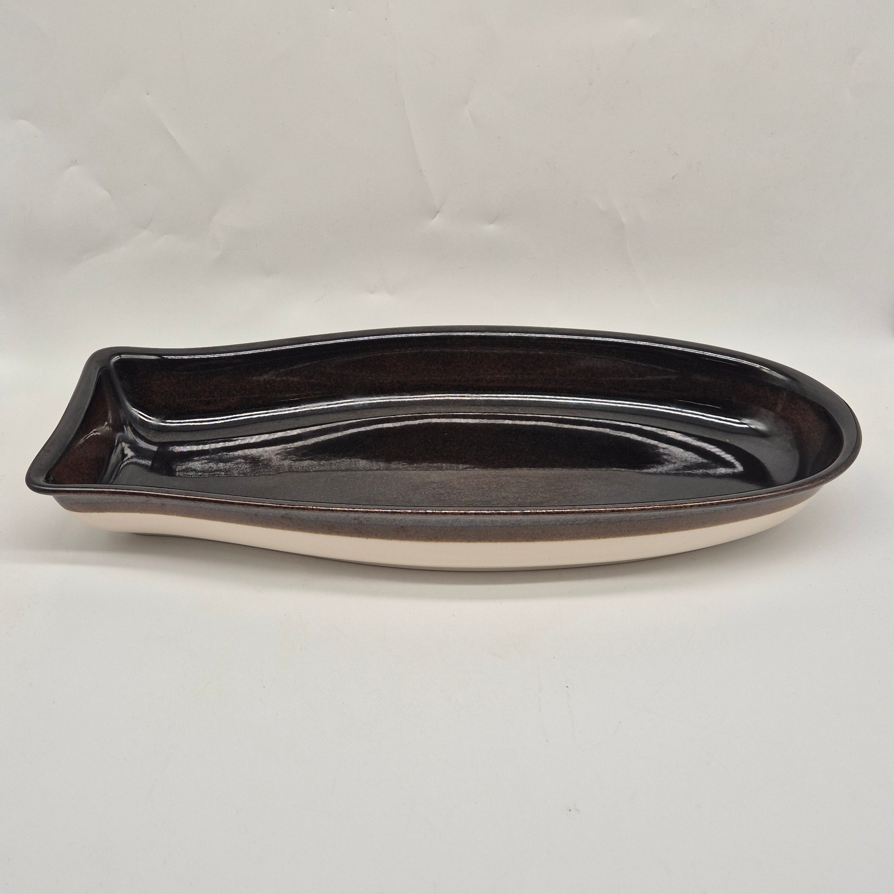 Det här är ett stämningsfullt serveringsfat i keramik, perfekt för att presentera allt från frukter till delikatesser. Fatet bär på en djup svart färg med en glänsande finish som ger en lyxig känsla till varje tillfälle. Märket Strehla är välkänt för sin högkvalitativa keramik och tidlösa design, vilket gör detta fat till en eftertraktad artikel. Det är begagnat men i mycket gott skick, och att lägga till detta åtråvärda objekt i din samling är ett steg mot sofistikerad och funktionell elegans.