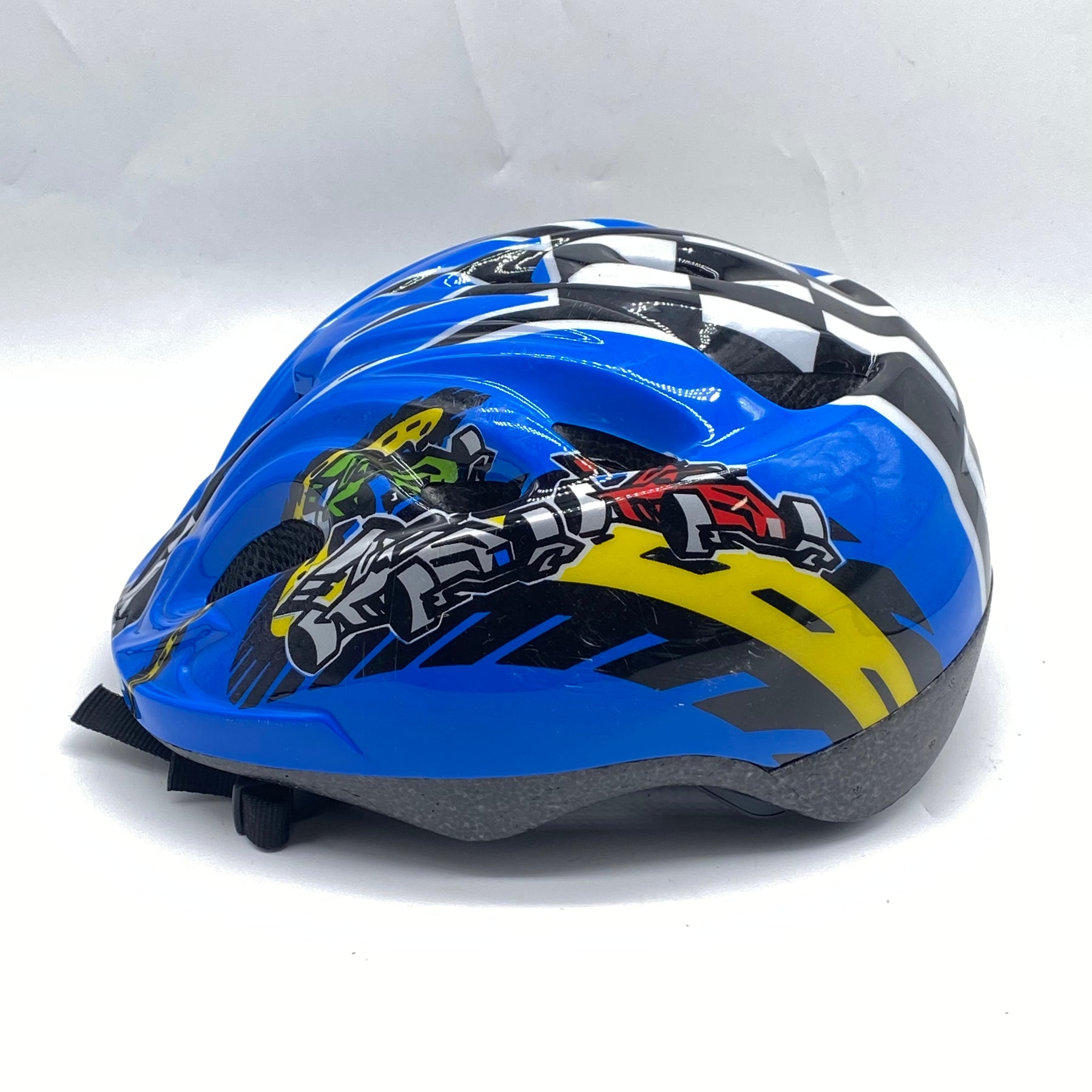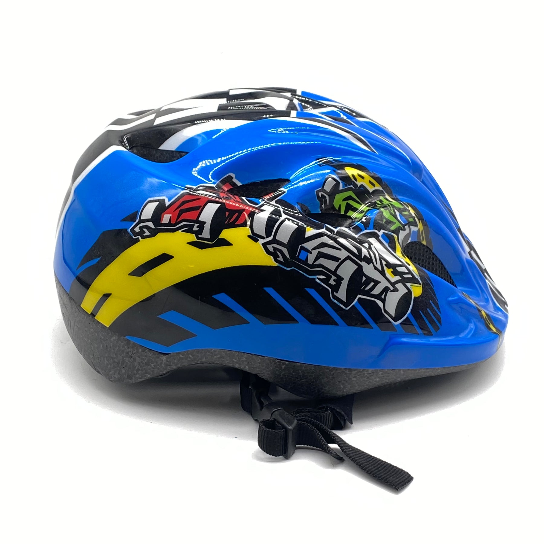 Denna barnhjälm är designad för att kombinera hög säkerhet och snygg design med sin livfulla blå och gula färgsättning och actionfyllda motiv. Passar utmärkt för cykelturer, skridskoåkning eller andra utomhusaktiviteter där extra skydd behövs. Den är bekväm att bära tack vare sin lätta vikt och justerbara passform. Hjälmen är begagnad men fortfarande i mycket gott skick, vilket gör den till ett prisvärt alternativ till en ny.Produktspecifikationer