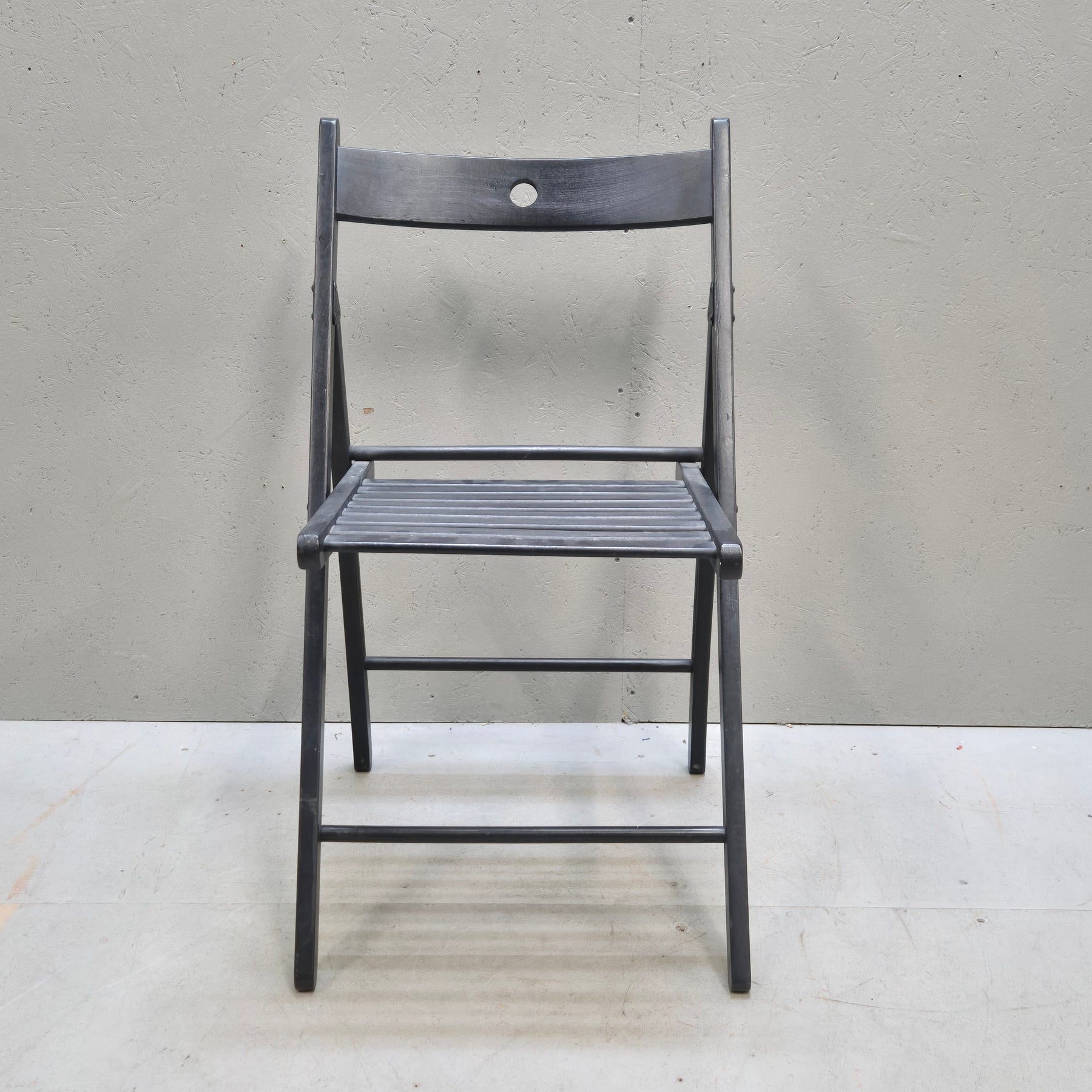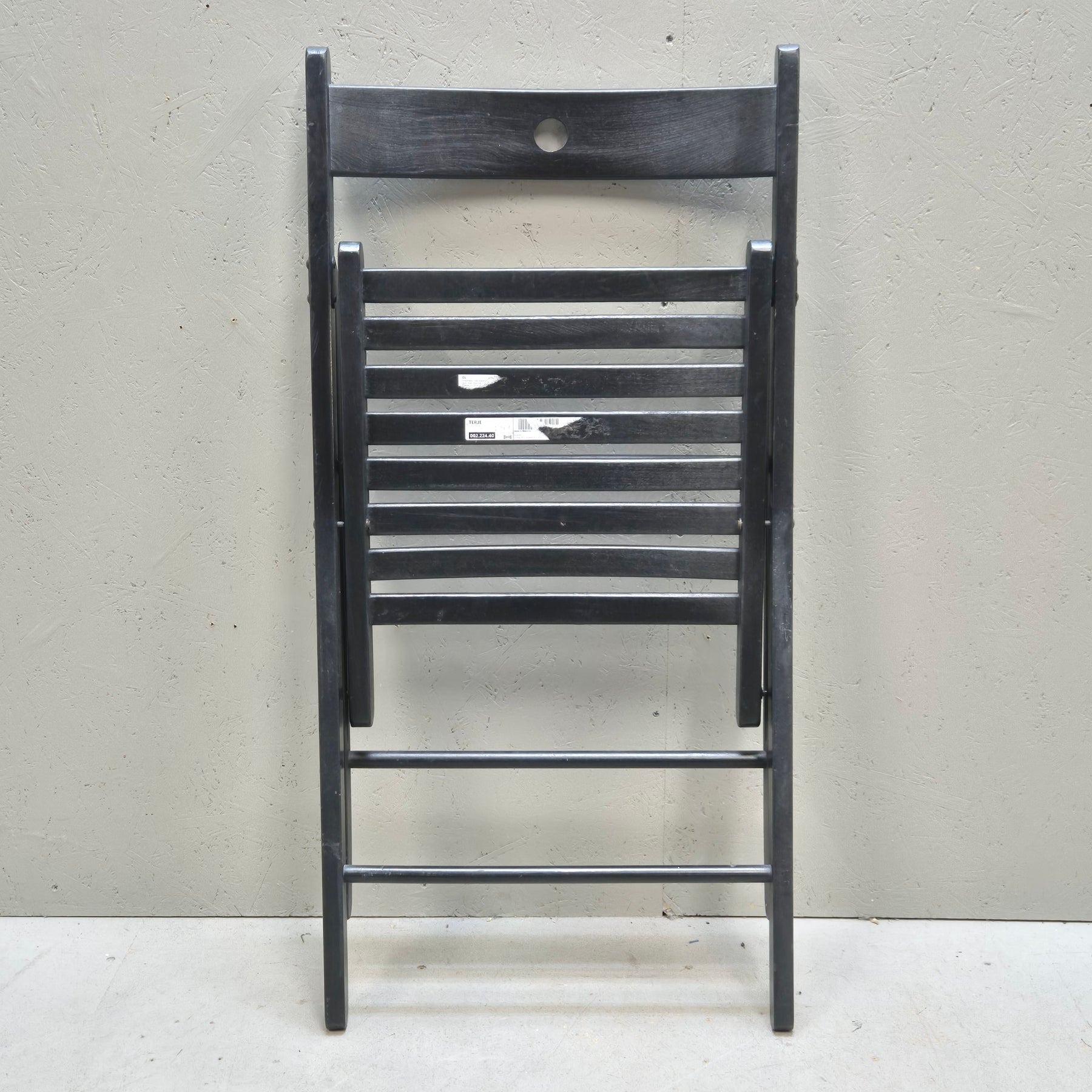 Denna klappstol, modell TERJE, tillverkad av IKEA är både stilren och funktionell. Med dess slanka design och svarta finish passar den utmärkt i både kök och på balkonger. Stolen är lätt att fälla upp och ner vilket gör den idealisk för små utrymmen eller som extra sittplatser vid behov. Begagnad men i mycket gott skick.