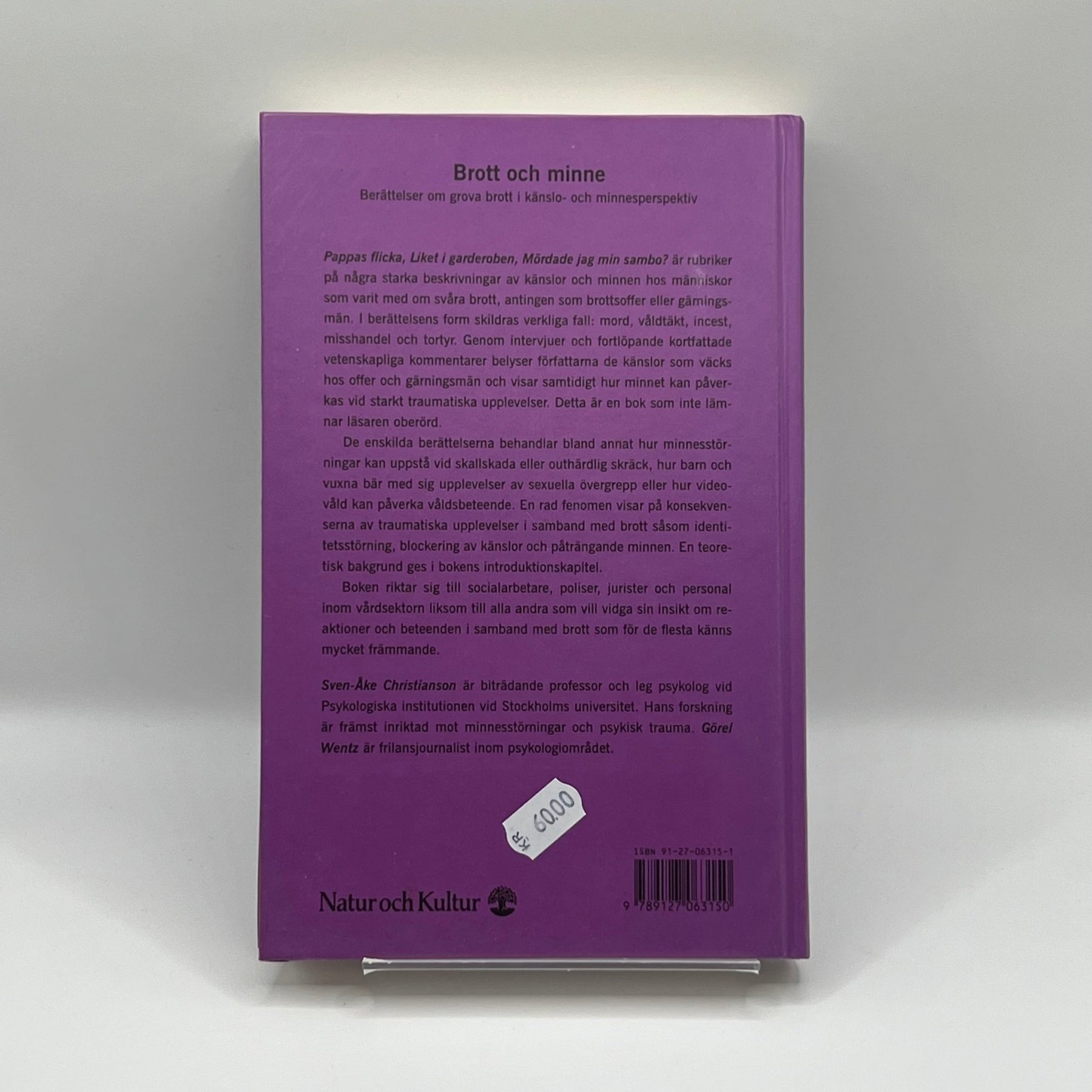 Bokens innehåll rör berättelser om allvarliga brott från både ett känslomässigt och ett minnespsykologiskt perspektiv. Den används för att ge insikter i brottets komplexa natur och dess påverkan på människors liv. Boken är begagnad men i gott skick.