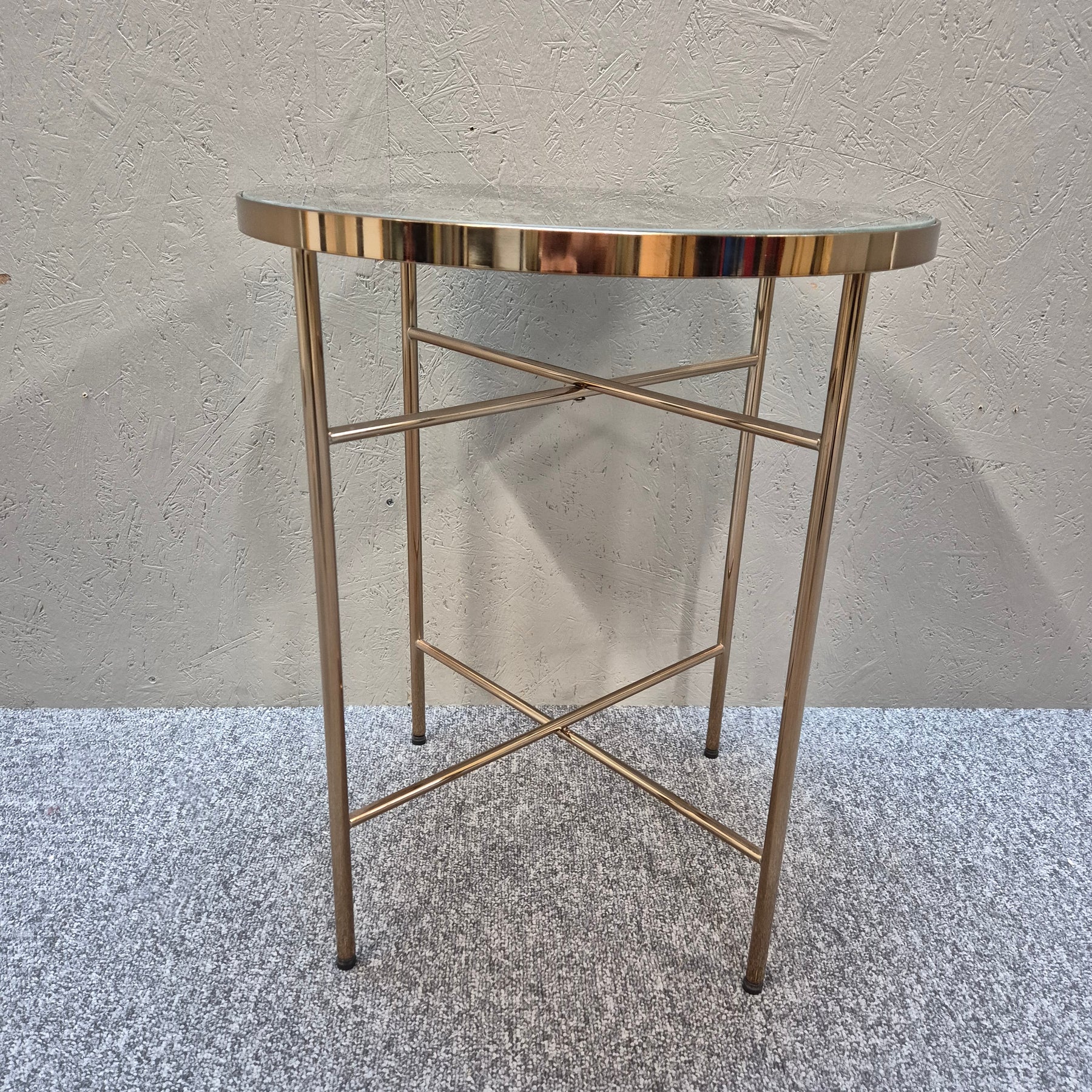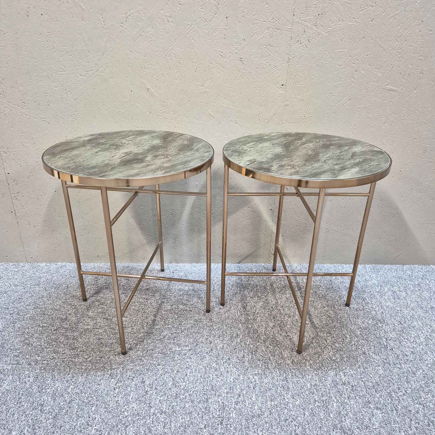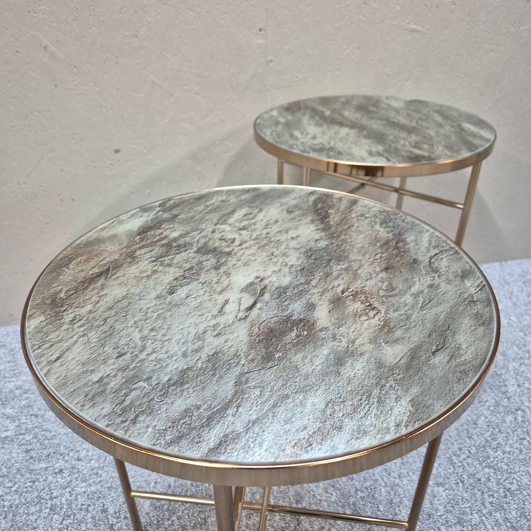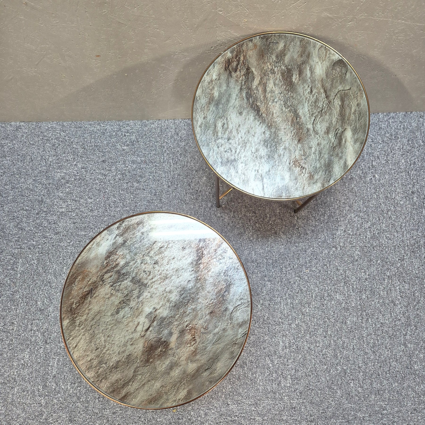 Detta är ett par moderna sidobord i matchande design, med stenliknande yta i dämpade naturtoner och guldfärgade metallstativ. Bordens nätta format gör dem perfekta som soffbord, avlastningsbord eller för att lyfta fram dina favoritdekorationer. Begagnade men i mycket gott skick, idealiska för dig som vill skapa en lyxig känsla hemma på ett hållbart sätt.