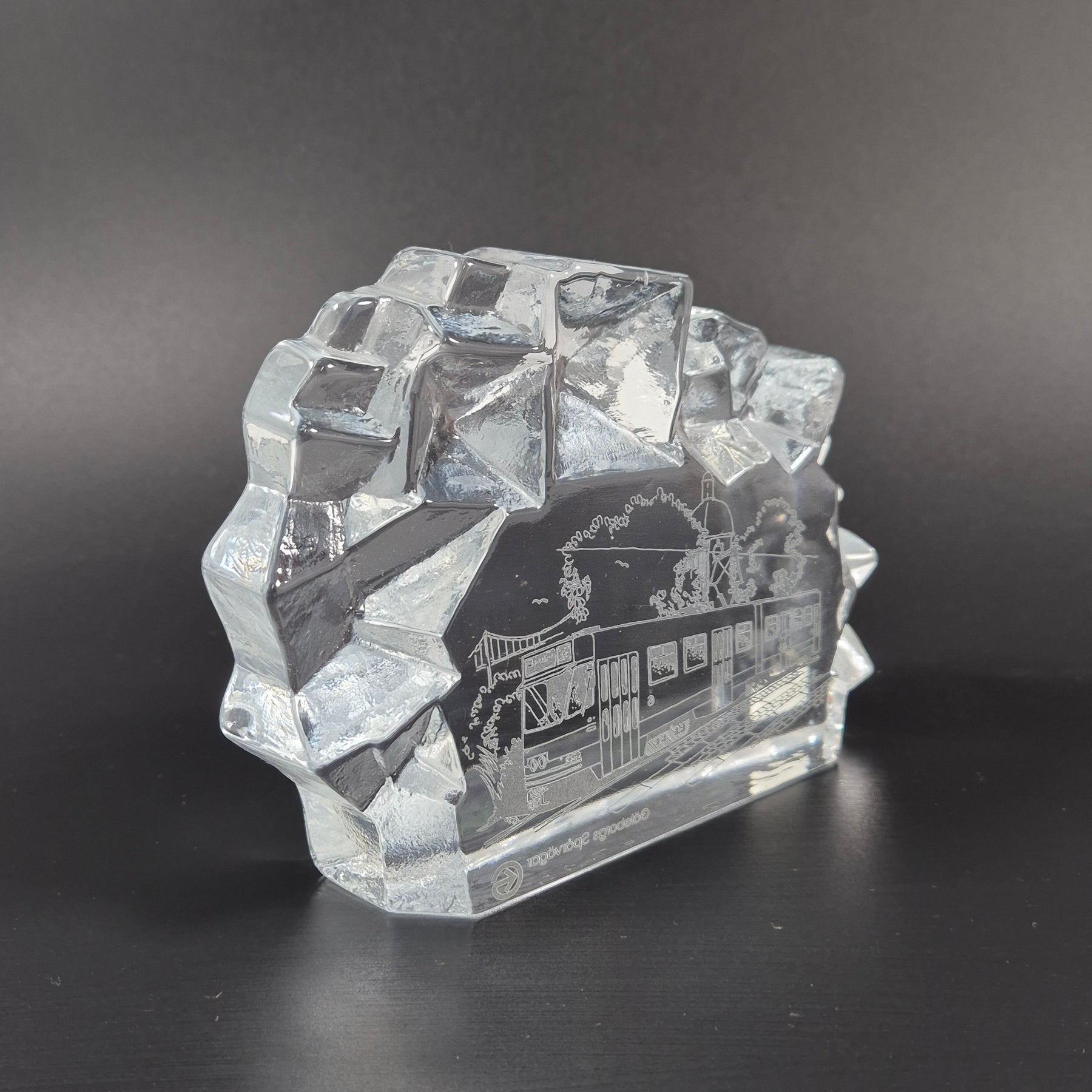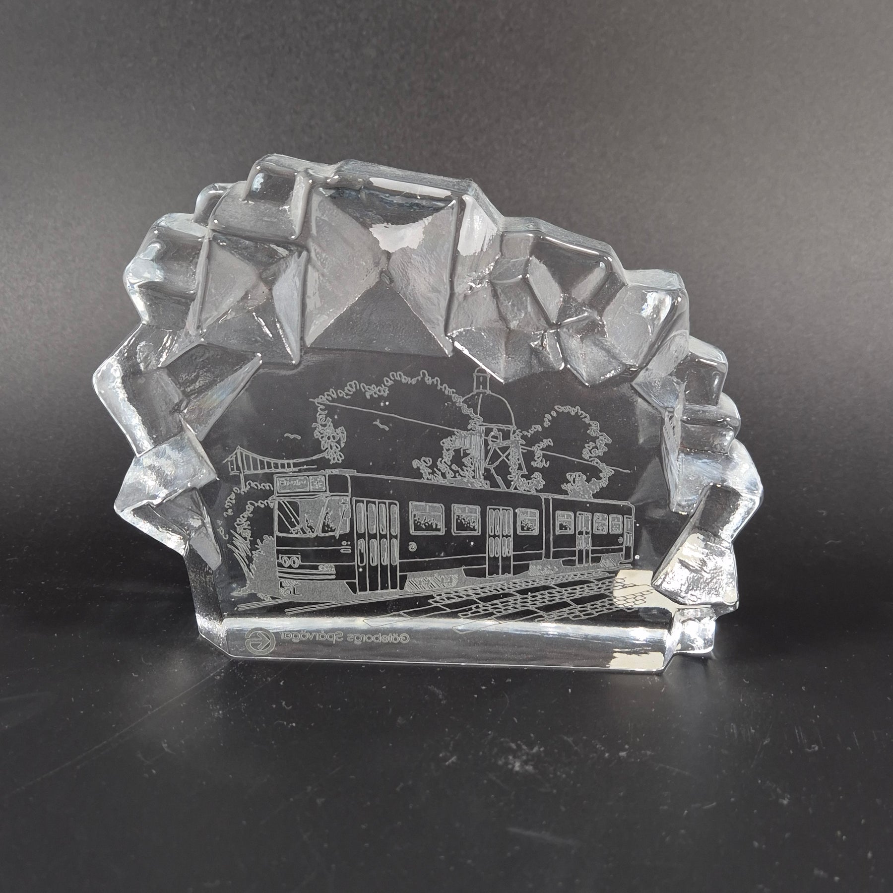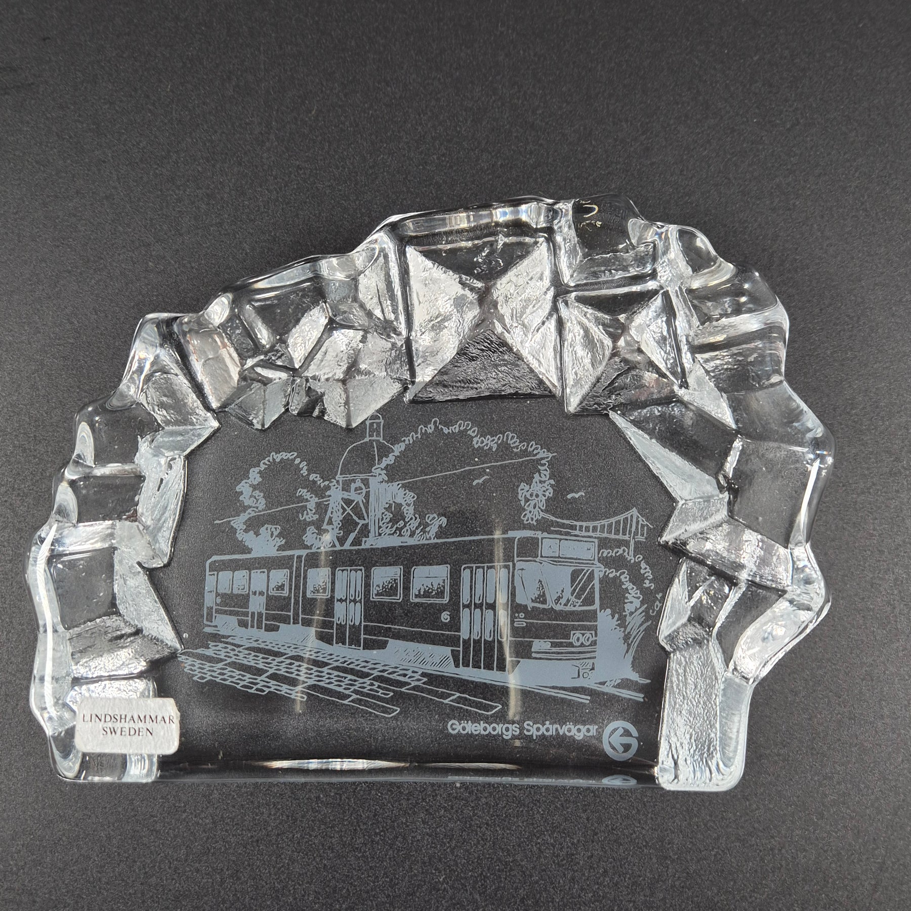 Dekorativ glasplakett i klart pressglas med graverat motiv av en spårvagn och stadssiluett. Tillverkad av Lindshammar Sweden med rå, isliknande kant som ger ett elegant och konstnärligt uttryck. Passar utmärkt som samlarobjekt eller personlig inredningsdetalj i hylla eller fönster, begagnad men i mycket gott vintage-skick med mindre bruksspår.