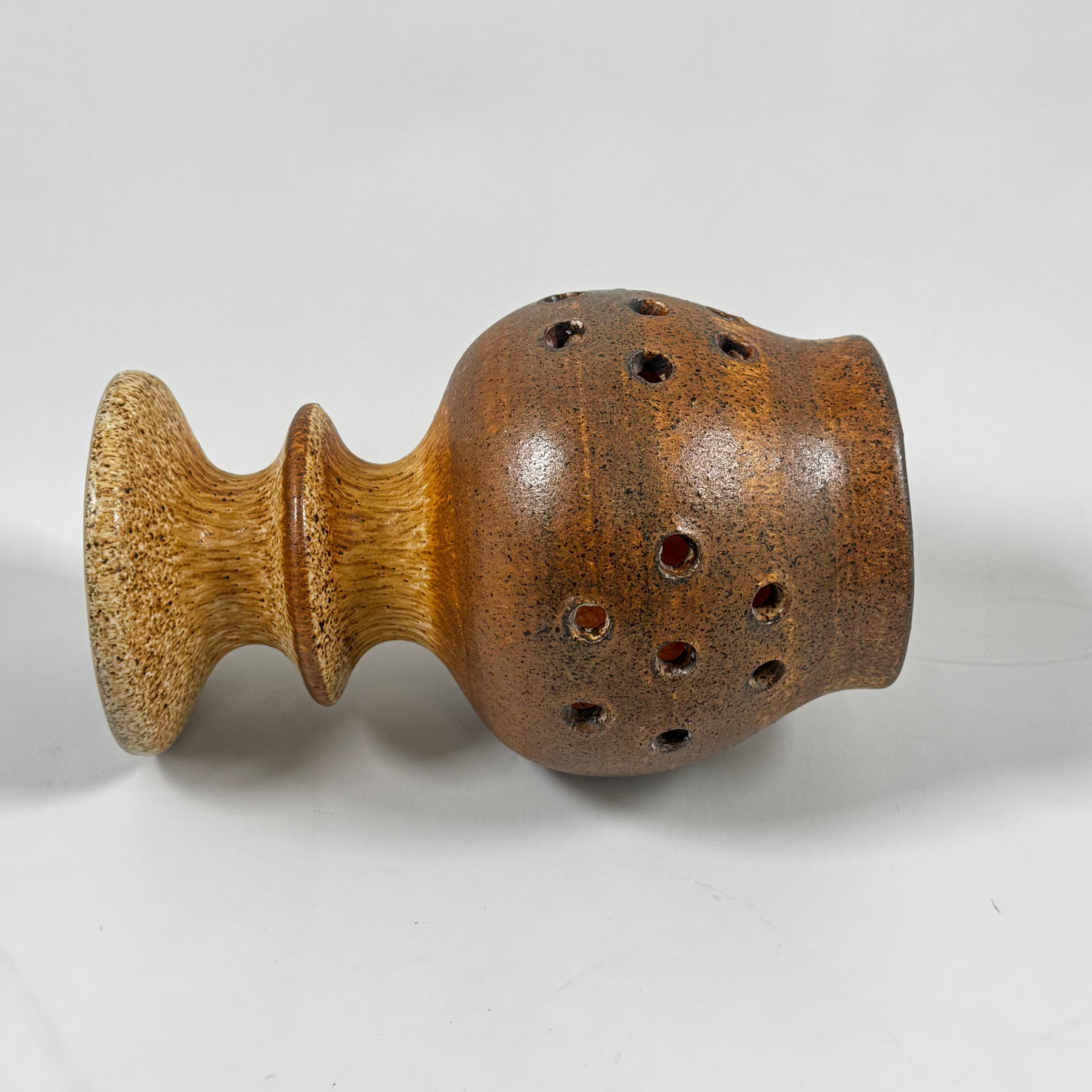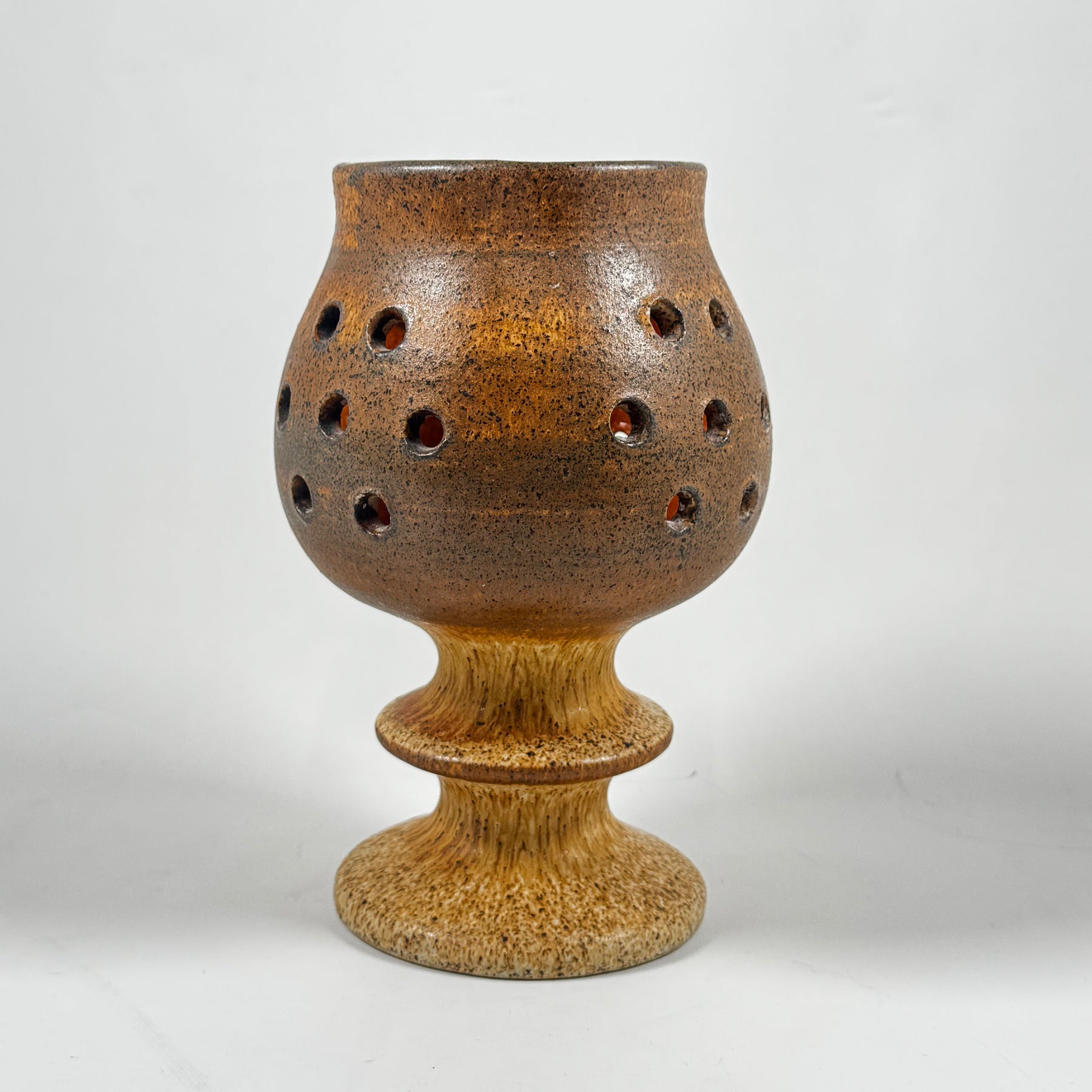 Denna dekorativa vas är skapad av Ego Stengods Ateljé, kända för sin högkvalitativa keramik och omisskännliga stil. Vase har en intressant struktur med perforeringar som ger ett spännande ljusspel när den används med en ljuskälla inuti. Dess rustika och robusta design gör den till ett perfekt inslag i varje hem eller som en uppskattad gåva. Varan är begagnad men fortfarande i mycket gott skick, vilket gör den till ett utmärkt köp.