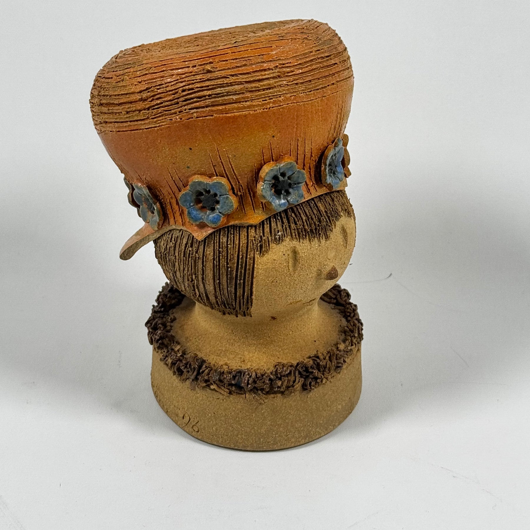 Denna dekorativa träfigur fungerar perfekt som ett iögonfallande inslag i ditt hem. Figuren, som är handgjord, framstår med detaljer i form av målade blommor och en frisyr av naturliga fibrer. Den är idealisk för samlare eller som en sofistikerad gåva. Träfiguren är begagnad men har bevarats i mycket gott skick vilket ger den en varm och inbjudande karaktär.