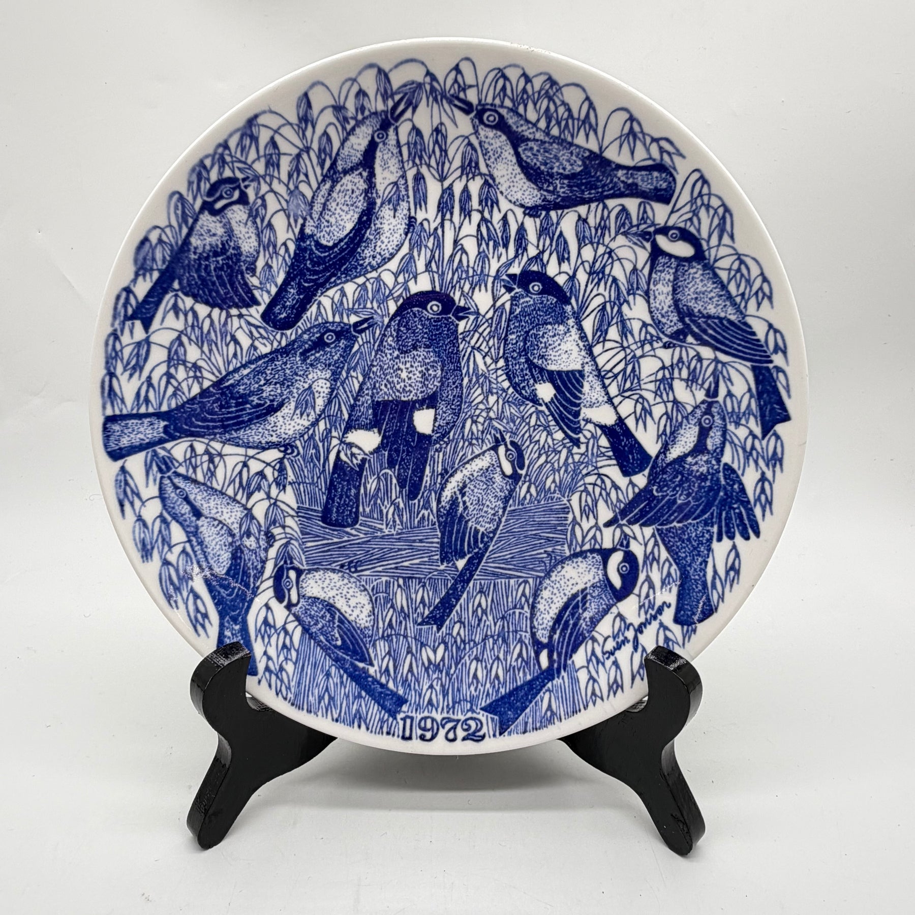 Denna samlartallrik är inte bara en vacker dekorativ pjäs utan bär också ett kulturellt arv komponerat av konstnären Sven Jonson. Tallriken är tillverkad i benporslin och uppvisar en detaljerad och charmig illustration av fåglar i blått på vit bakgrund, vilket gör den perfekt för display eller som en del av en högtidlig dukning. Tallriken är en del av en begränsad upplaga, vilket lägger ett exklusivt värde till ditt hem eller som en gåva. Skicket är mycket gott utan synliga tecken på slitage.