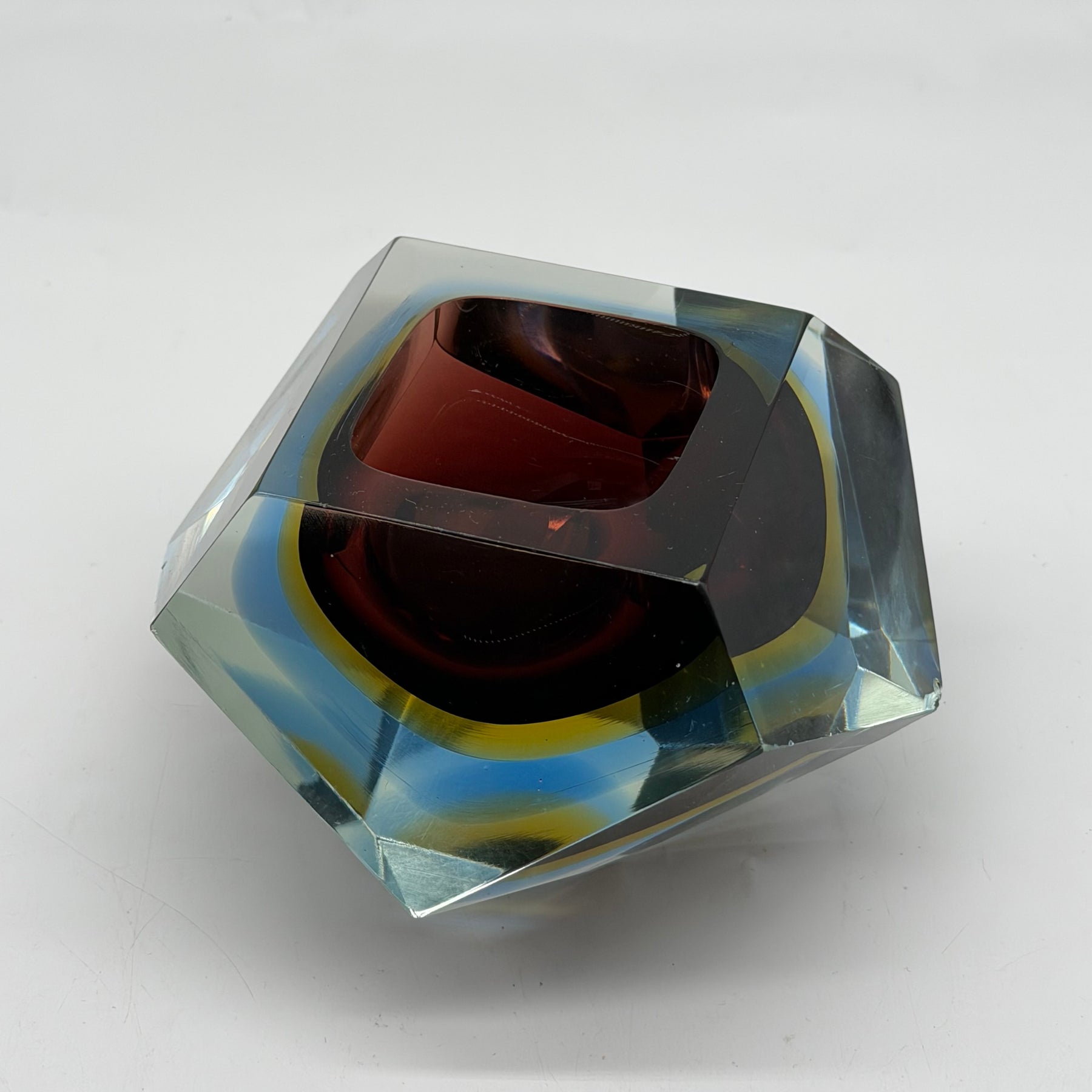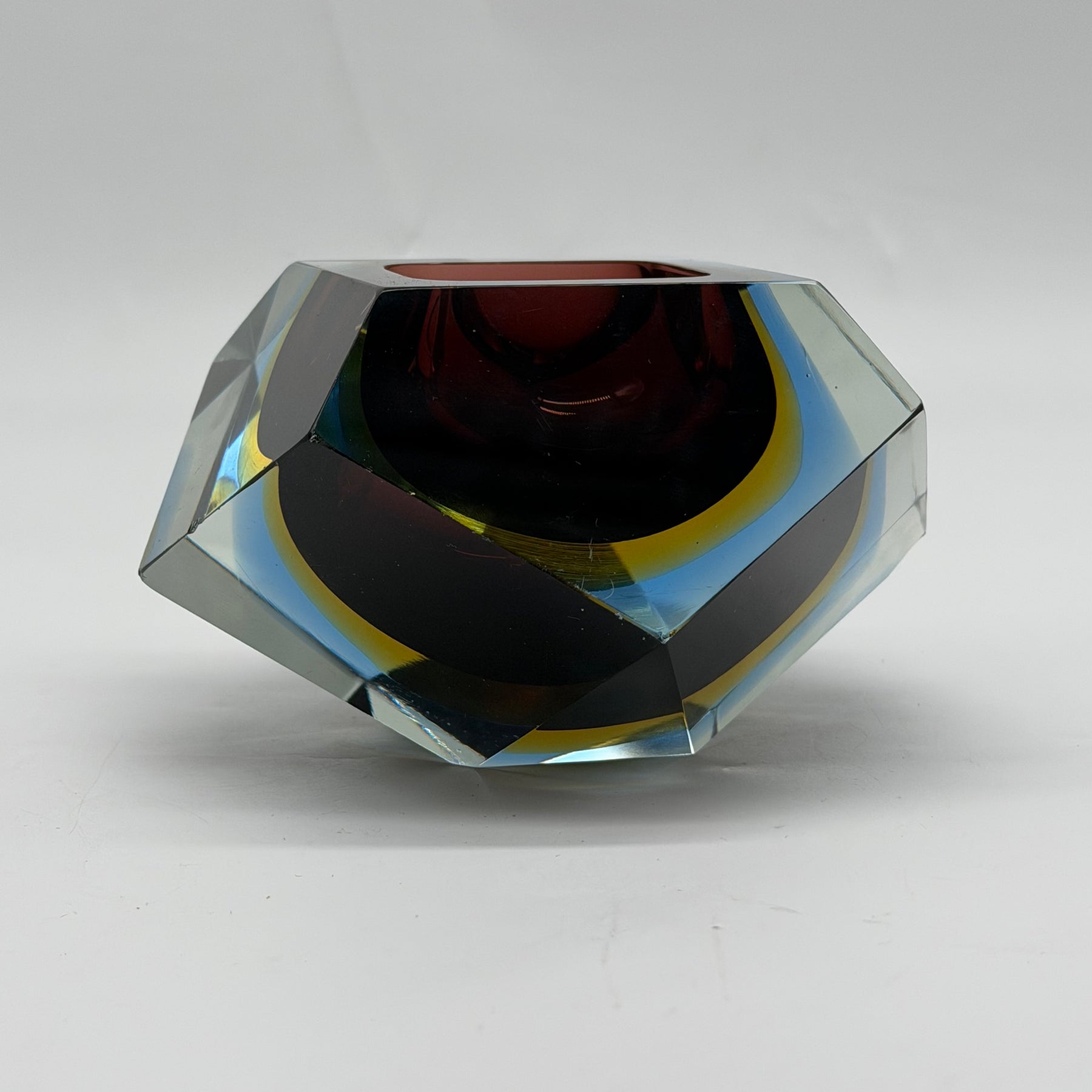 Denna dekorativa vas är skapad av kristall med en fascinerande inre design som kombinerar klara och djupa röda toner med blå och gula accenter. Vasens moderna form och dess spel med ljus gör den perfekt som ett konstverk såväl som för att hålla blommor. Dess kompakta storlek gör den också lämplig för olika typer av heminredningar. Vasen är begagnad men har bibehållit ett exceptionellt skick.