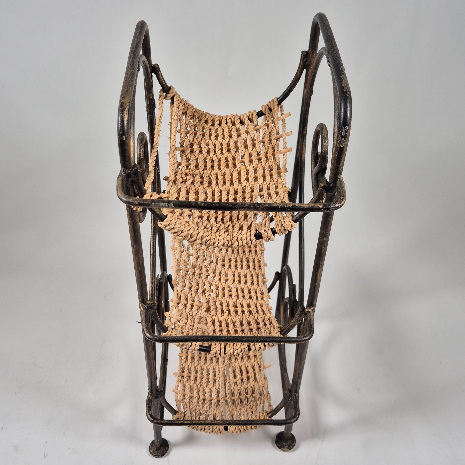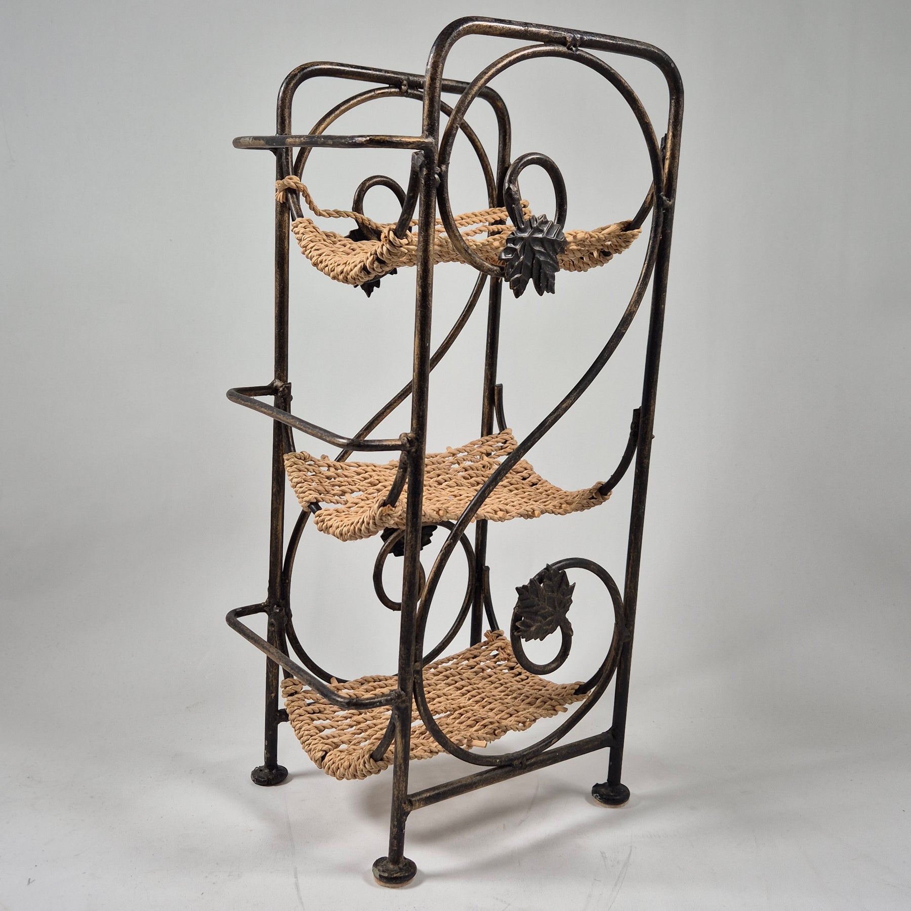 Denna eleganta blomsterhylla är perfekt för att framhäva dina växter och blommor. Tillverkad av metall med dekorativa inslag och repbeklädda hyllplan, erbjuder den solid stabilitet och ett attraktivt utseende. Möbleringen är idealisk för både inomhus- och utomhusbruk, och ger en rustik charm till vilket utrymme som helst. Produkten är begagnad men välbevarad, vilket gör den till en utmärkt investering för älskare av vintage och hållbarhet.Produktspecifikationer