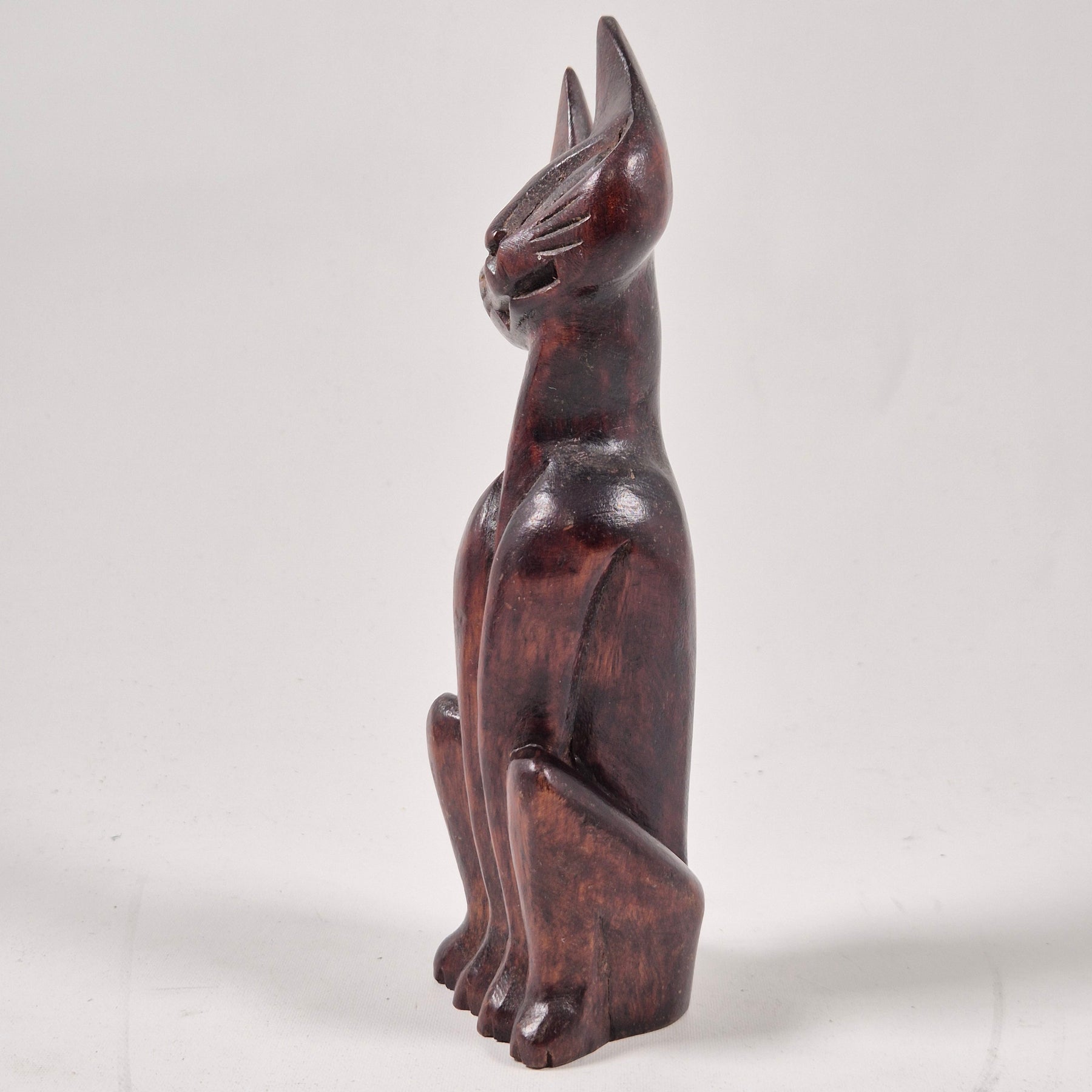 Denna träfigur föreställande en katt är skulpterad för hand i ett mörkt, lysterrikt trämaterial som ger en känsla av elegans och traditionell hantverksskicklighet. Det minimalistiska och stilrena utformningen gör den till en utmärkt inredningsdetalj för alla som uppskattar konsthantverk och naturliga material. Figuren är begagnad men i mycket gott skick vilket tillför en charmig och värmande atmosfär i hemmet.
