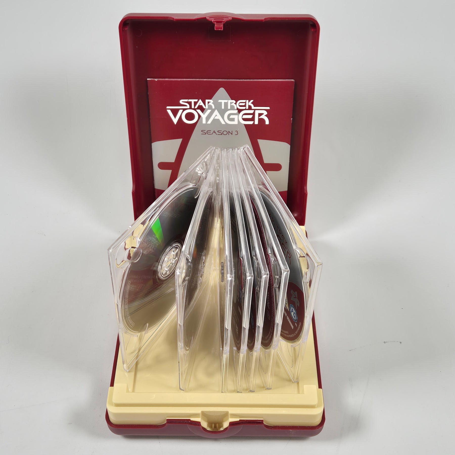 En unik Star Trek Voyager säsong 3 DVD-box i röd samlarutgåva – perfekt för sci-fi-fans och samlare.2. Produktbeskrivning
