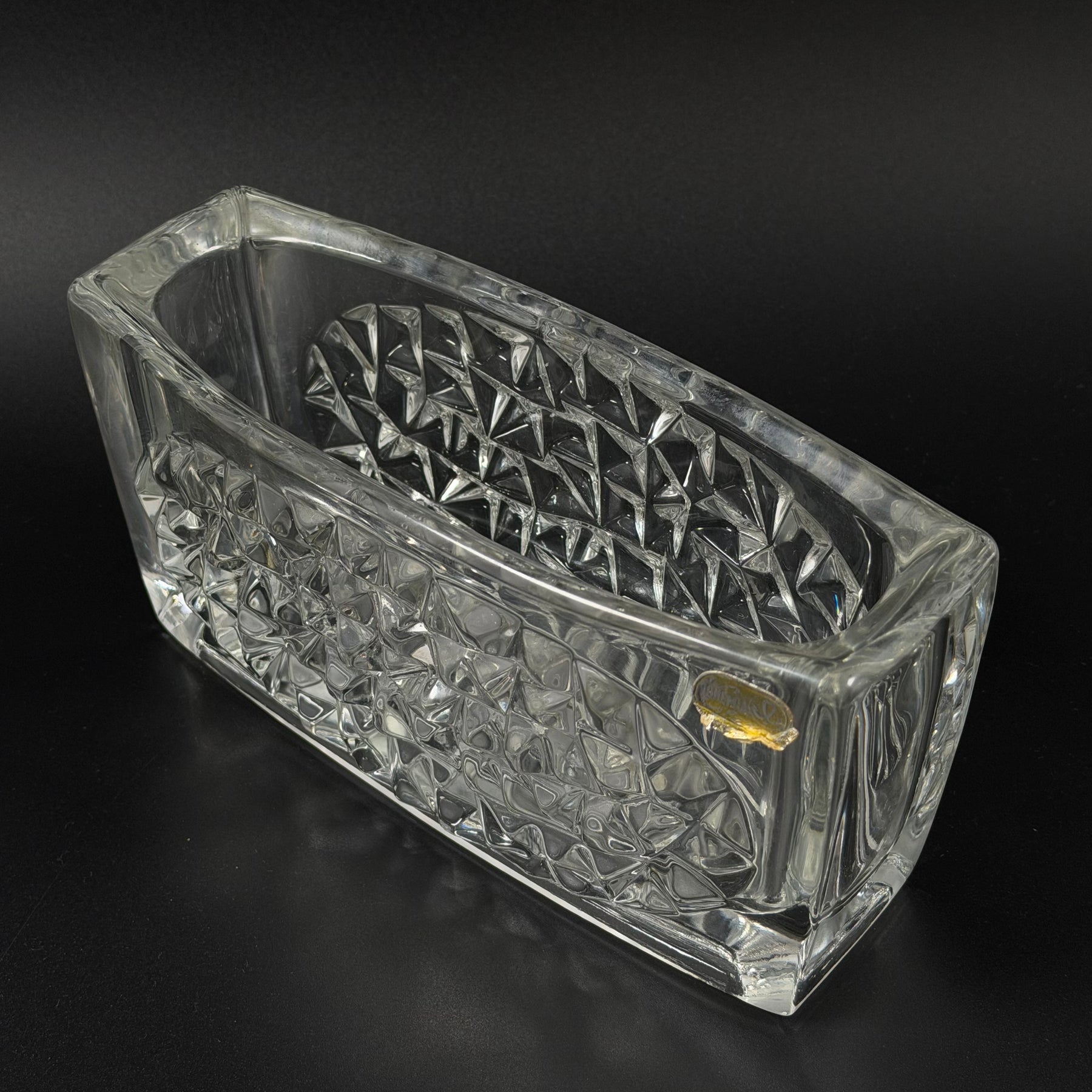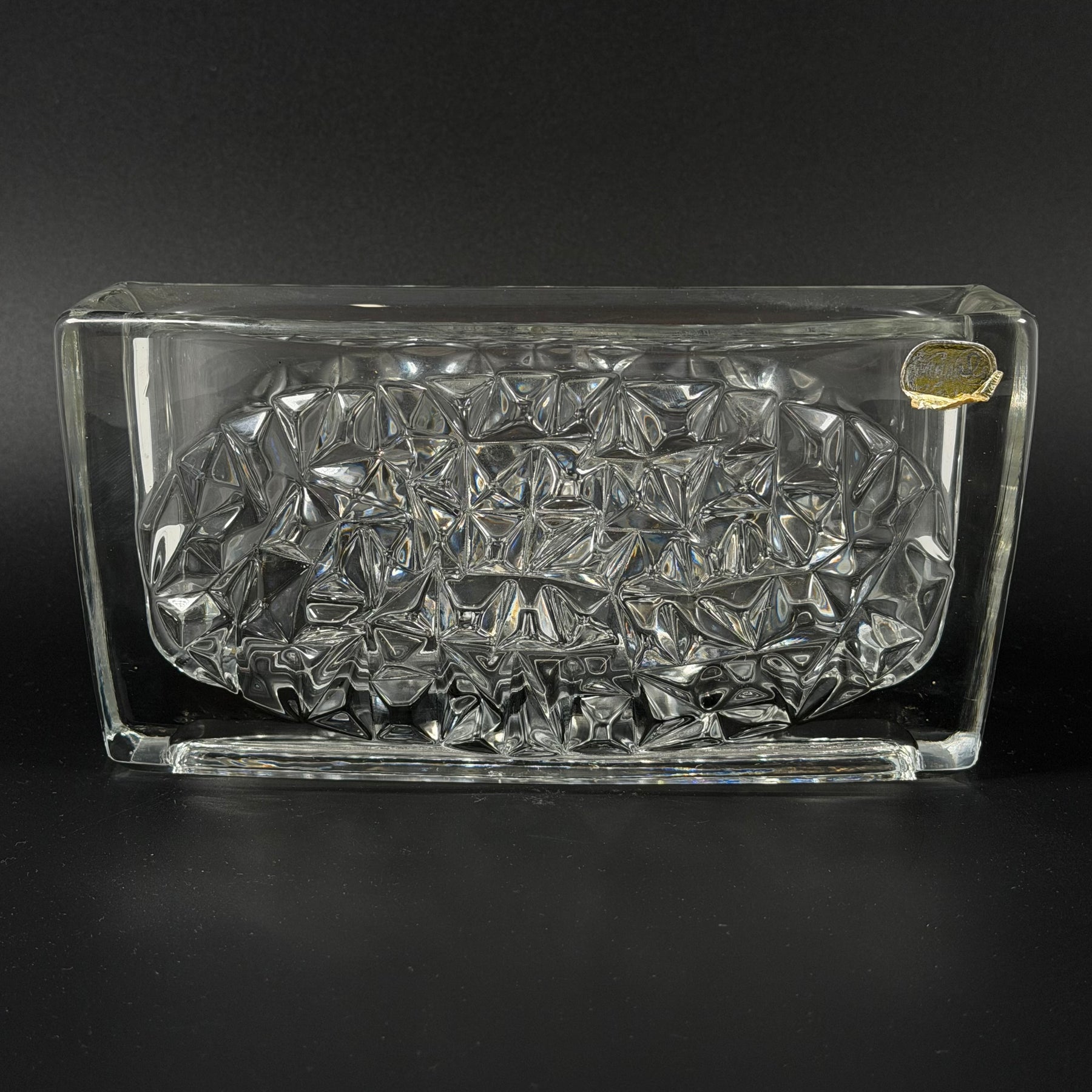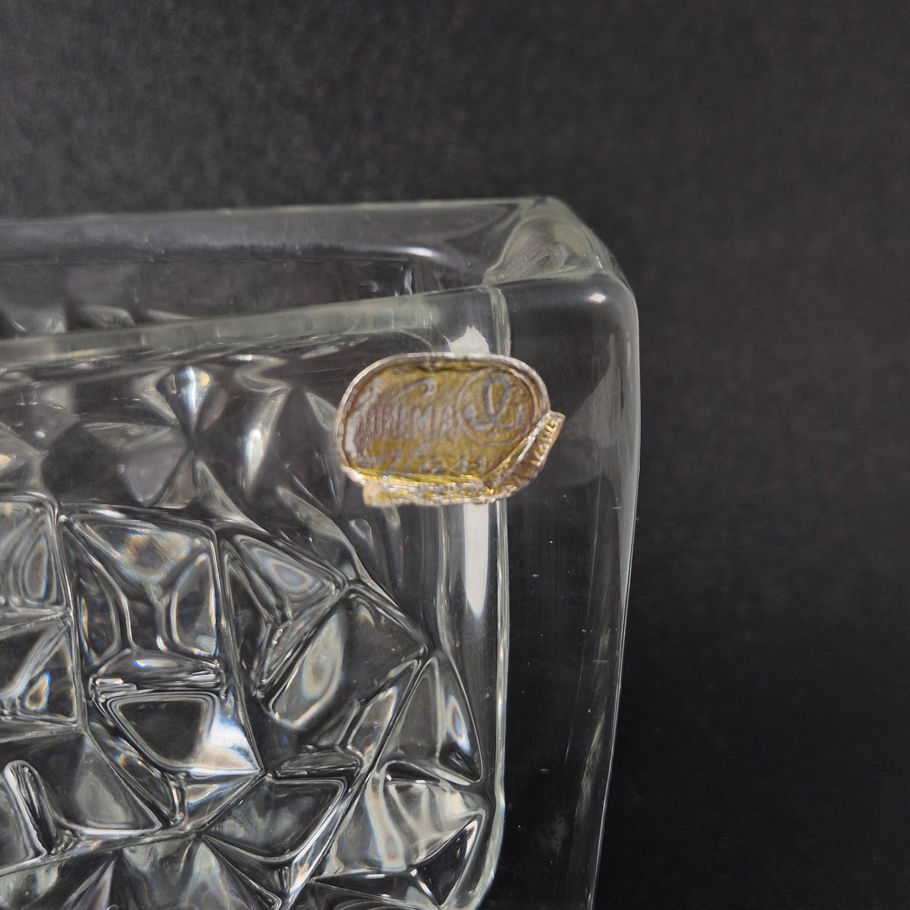 Denna exklusiva vas från Rudolfova karakteriseras av sin robusta form och de djupt skurna mönstren som reflekterar ljuset på ett spektakulärt sätt. Det är en idealisk dekorationsartikel som ger ett touch av sofistikation till varje rum. Vackert designad och trots ålder i strålande skick, är denna vas perfekt för den som uppskattar svenskt hantverk och kvalitet.