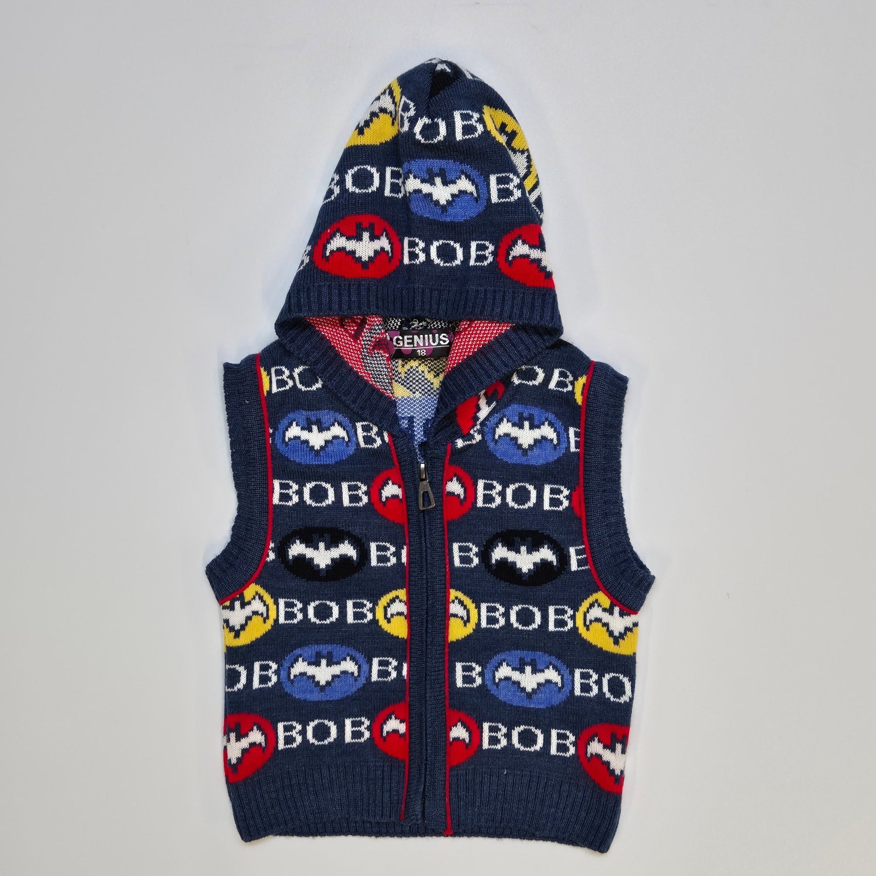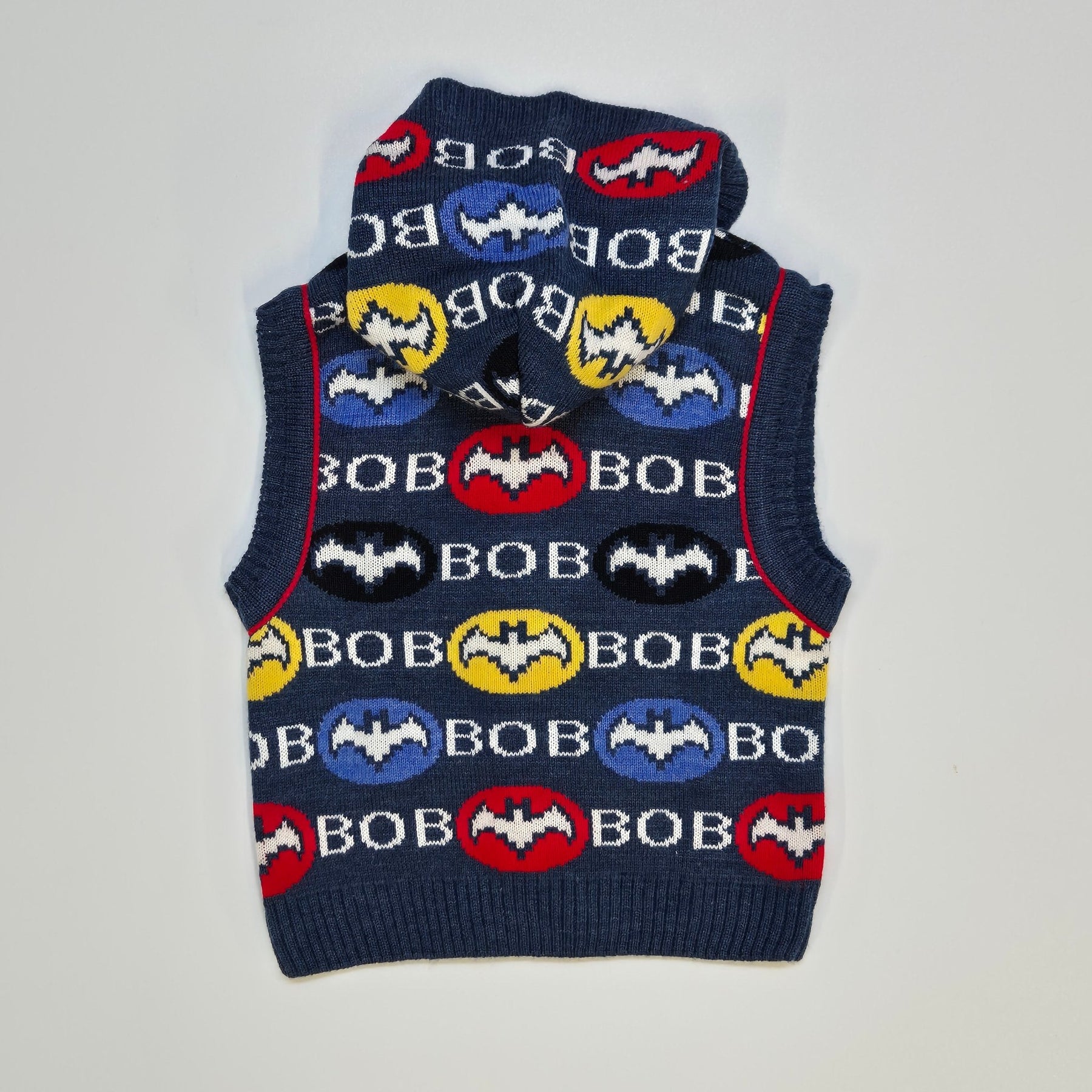 Stickad barnväst med ljusa Batman-loggor och huva. Perfekt för att hålla barnet varmt under de kallare månaderna. Västen är begagnad men i gott skick.